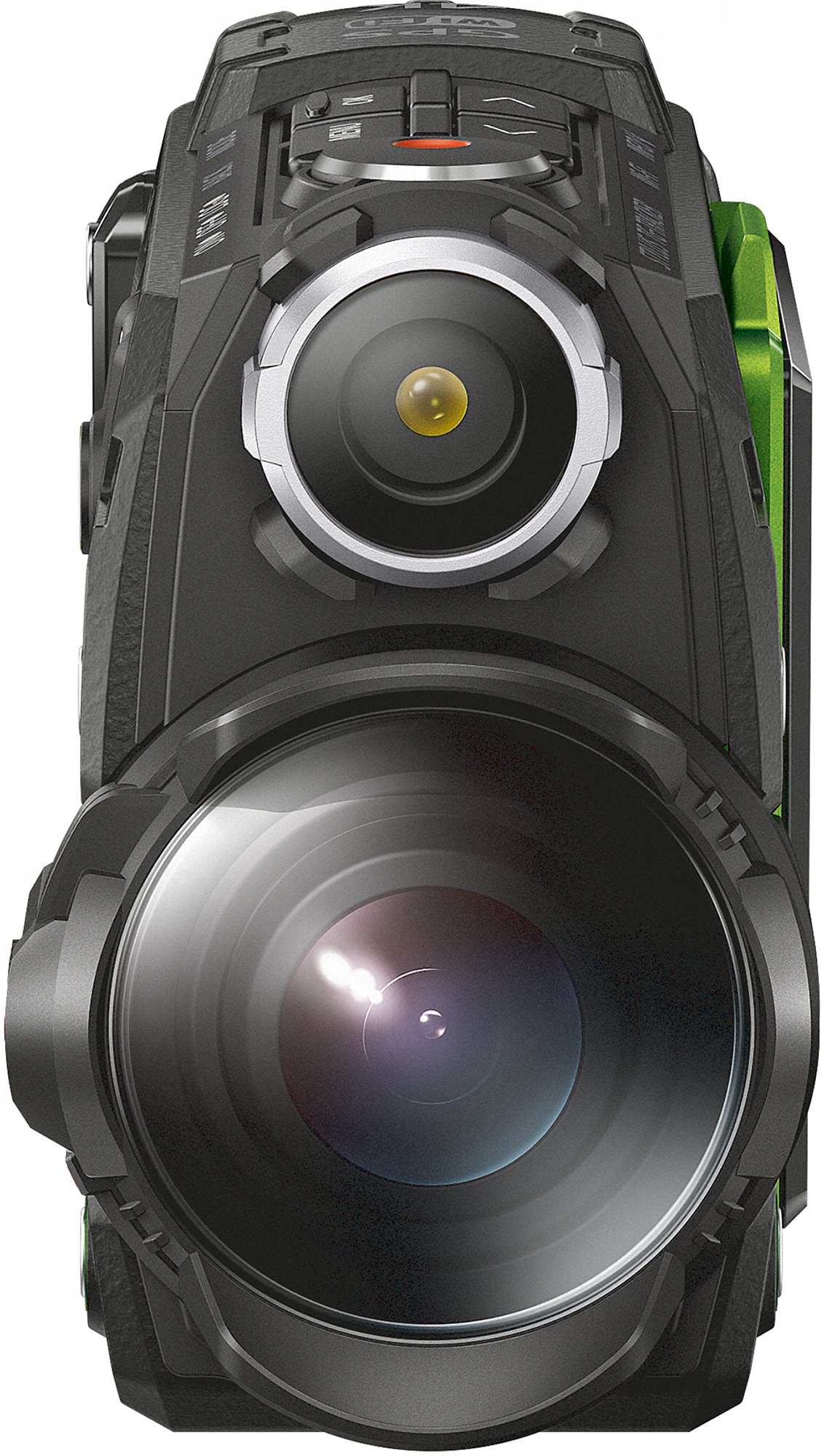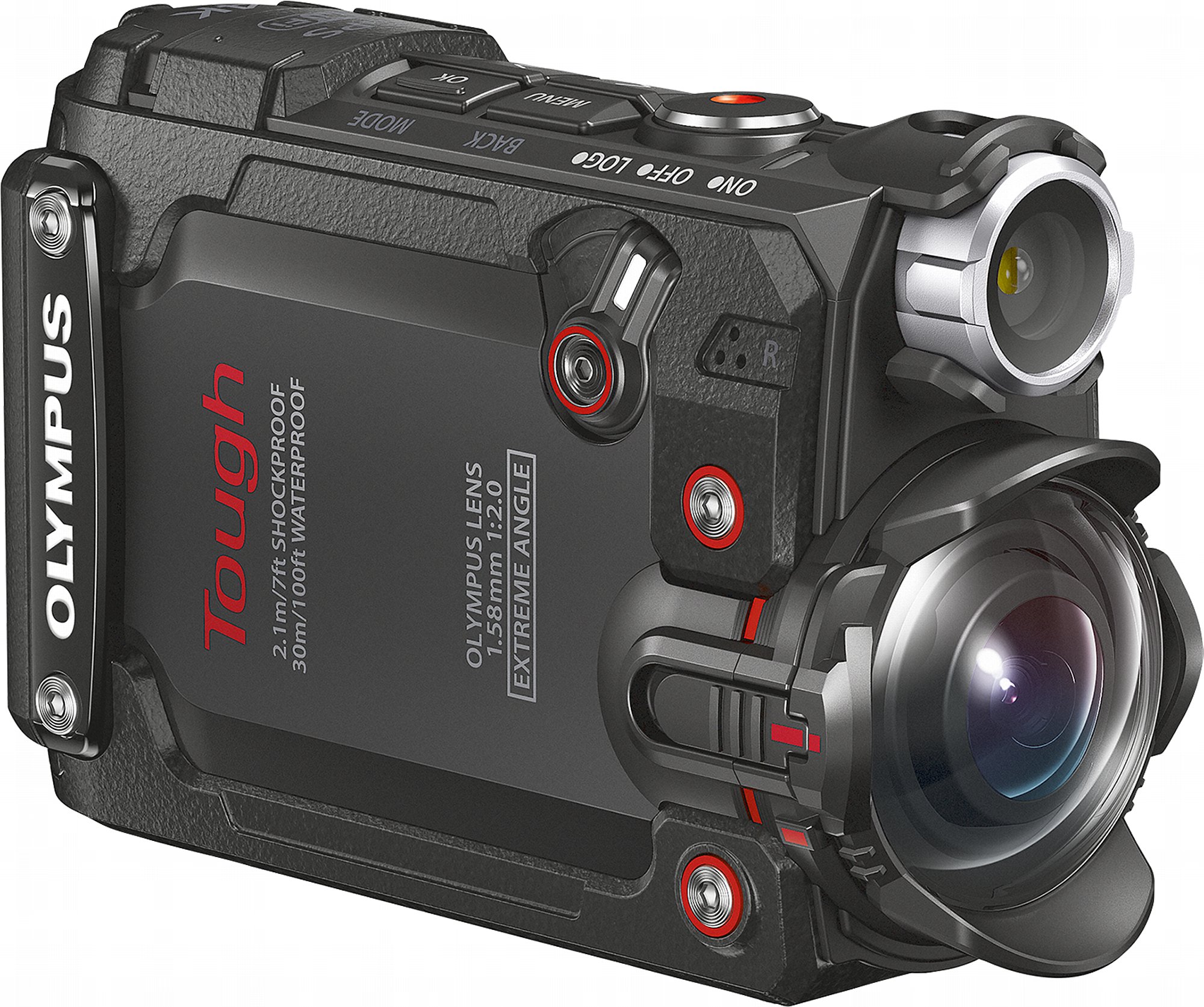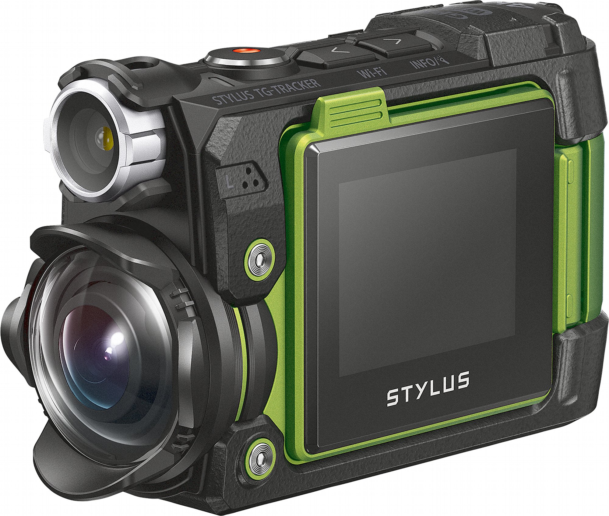 Das Fixfokus-Objektiv bietet sagenhafte 204 Grad Bilddiagonale, bei Kleinbild wäre das ein 14mm-Fisheye-Objektiv. Das ist deutlich mehr als bislang bei Actioncams üblich (ein guter "normaler" Wert sind 170 Grad), und der Bildsensor soll in Verbindung mit dem TruePic VII Bildprozessor 4K-Videoaufzeichnung mit 30 fps ermöglichen. Allerdings wird dabei munter interpoliert, denn für 4K-Video braucht man eigentlich mindestens 8,3 Megapixel im 16:9-Format, der Sensor der Olympus TG-Tracker "sieht" aber nur effektiv 7,2 Megapixel. Neben der interpolierten 4K-Auflösung kann das Gerät FullHD (1080p) auch mit 60 Bildern/s sowie niedrigere Auflösungen, aber keine Zeitlupen. In denselben Auflösungen können auch Fotos geschossen werden (bei 8 Megapixel logischerweise wieder interpoliert). Ein digitaler 5-Achsen-Bildstabilisator soll – auch sogar bei 4K-Videos – unerwünschte Bewegungen beim Filmen ausgleichen. Zur Wiedergabe und fürs Bildschirm-Menü besitzt der TG-Tracker einen kleinen ausklappbaren 1,5-Zoll-Bildschirm im 4:3-Format. Ebenfalls ein Novum bei Actioncams ist ein integriertes LED-Hilfslicht, das kurzzeitig (1 Minute) beachtliche 60 Lumen Helligkeit abgeben kann. Im normalen Modus sind es 30 Minuten lang 20 Lumen. Das Gewicht gibt Olympus betriebsbereit (mit Akku und Speicherkarte) mit 180 Gramm an. Das ist für ein Gerät mit dieser Ausstattung durchaus im Rahmen. Immerhin verfügt das Gerät über Monitor und Videoleuchte und ist zudem ohne Schutzgehäuse robust und wasserdicht. Zum Vergleich: Eine GoPro 4 Silver (die ebenfalls einen Monitor besitzt) wiegt inklusive Unterwassergehäuse ebenfalls 180 Gramm.