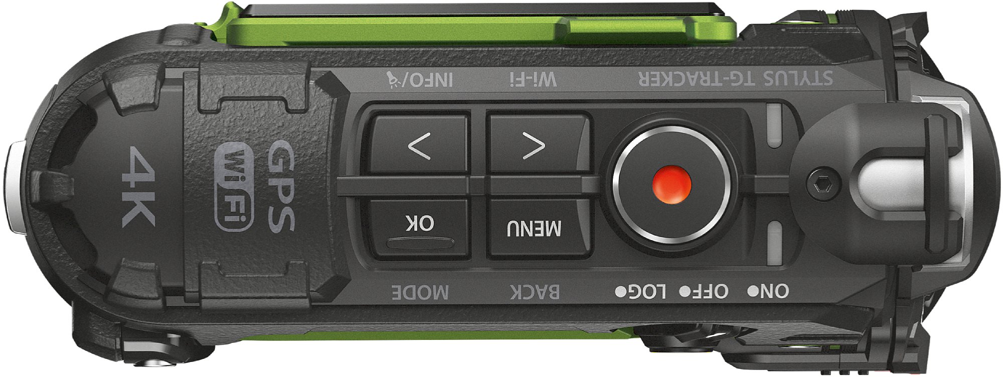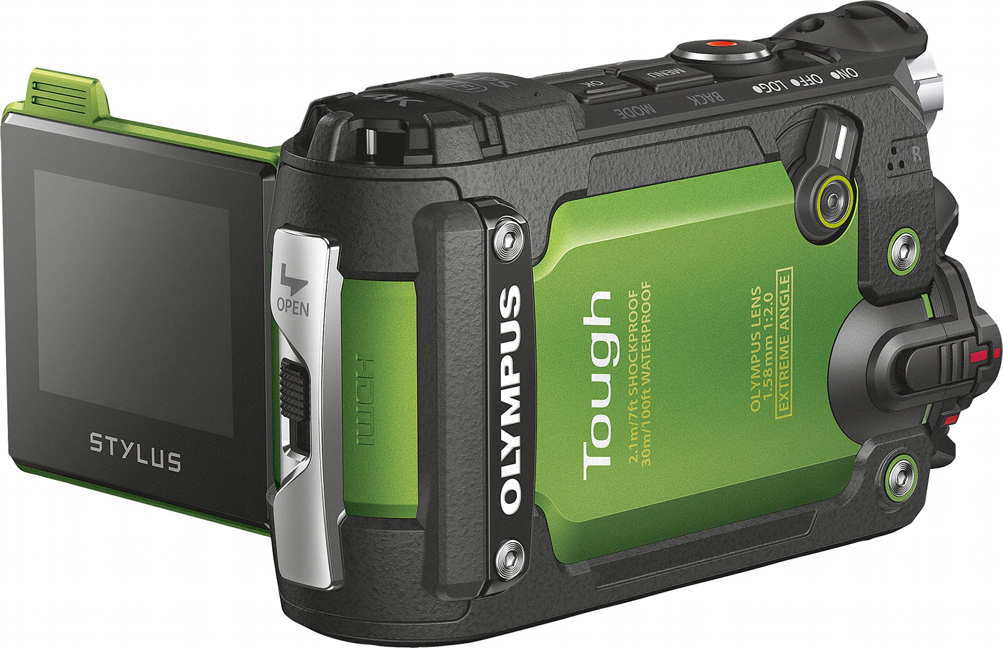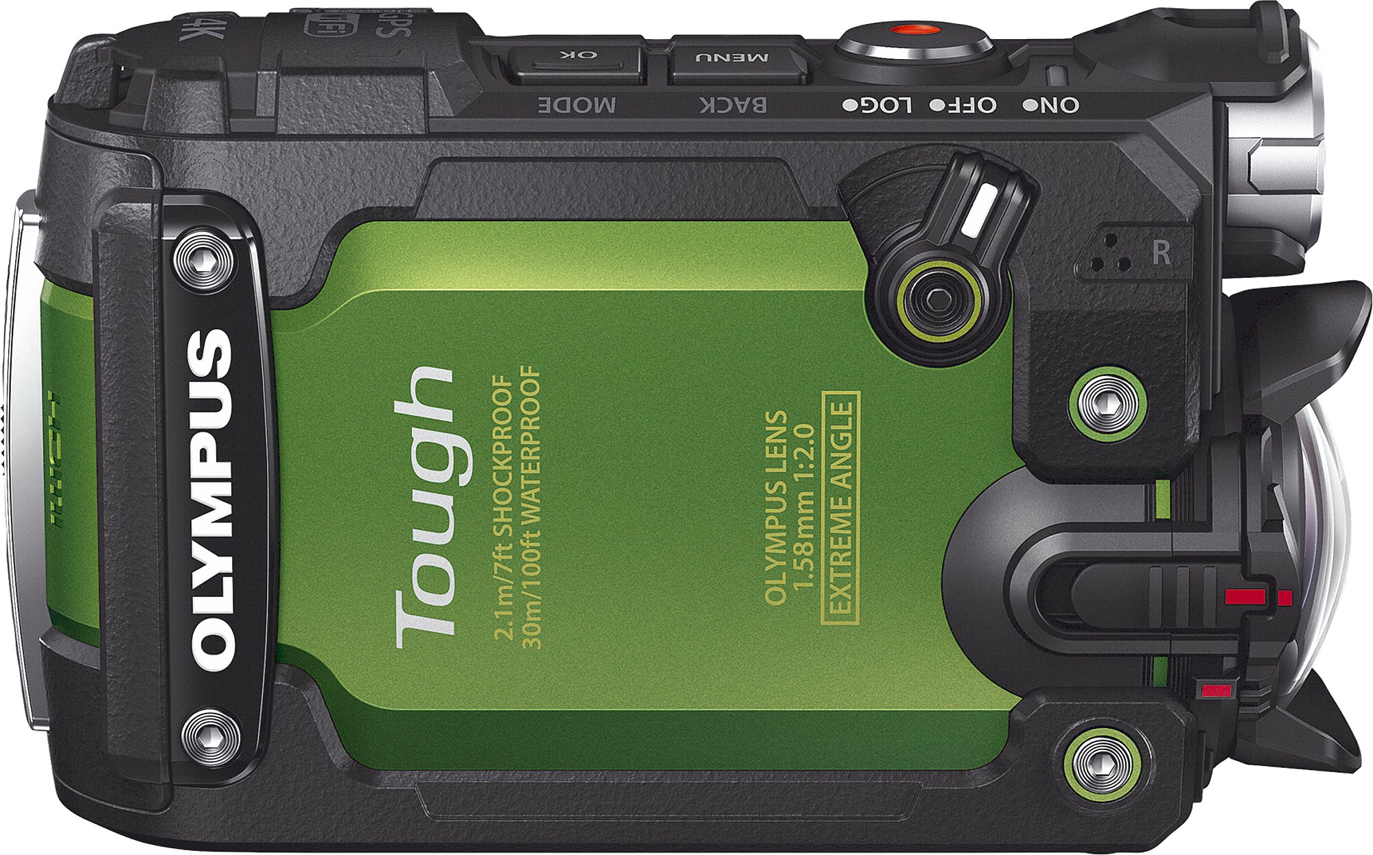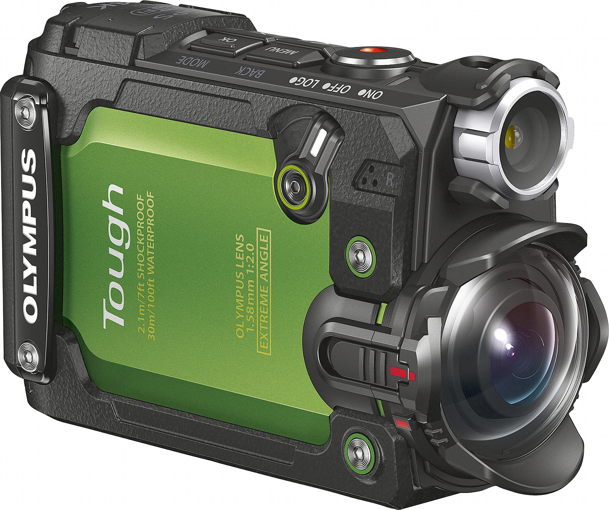 Das Fixfokus-Objektiv bietet sagenhafte 204 Grad Bilddiagonale, bei Kleinbild wäre das ein 14mm-Fisheye-Objektiv. Das ist deutlich mehr als bislang bei Actioncams üblich (ein guter "normaler" Wert sind 170 Grad), und der Bildsensor soll in Verbindung mit dem TruePic VII Bildprozessor 4K-Videoaufzeichnung mit 30 fps ermöglichen. Allerdings wird dabei munter interpoliert, denn für 4K-Video braucht man eigentlich mindestens 8,3 Megapixel im 16:9-Format, der Sensor der Olympus TG-Tracker "sieht" aber nur effektiv 7,2 Megapixel. Neben der interpolierten 4K-Auflösung kann das Gerät FullHD (1080p) auch mit 60 Bildern/s sowie niedrigere Auflösungen, aber keine Zeitlupen. In denselben Auflösungen können auch Fotos geschossen werden (bei 8 Megapixel logischerweise wieder interpoliert). Ein digitaler 5-Achsen-Bildstabilisator soll – auch sogar bei 4K-Videos – unerwünschte Bewegungen beim Filmen ausgleichen. Zur Wiedergabe und fürs Bildschirm-Menü besitzt der TG-Tracker einen kleinen ausklappbaren 1,5-Zoll-Bildschirm im 4:3-Format. Ebenfalls ein Novum bei Actioncams ist ein integriertes LED-Hilfslicht, das kurzzeitig (1 Minute) beachtliche 60 Lumen Helligkeit abgeben kann. Im normalen Modus sind es 30 Minuten lang 20 Lumen. Das Gewicht gibt Olympus betriebsbereit (mit Akku und Speicherkarte) mit 180 Gramm an. Das ist für ein Gerät mit dieser Ausstattung durchaus im Rahmen. Immerhin verfügt das Gerät über Monitor und Videoleuchte und ist zudem ohne Schutzgehäuse robust und wasserdicht. Zum Vergleich: Eine GoPro 4 Silver (die ebenfalls einen Monitor besitzt) wiegt inklusive Unterwassergehäuse ebenfalls 180 Gramm.