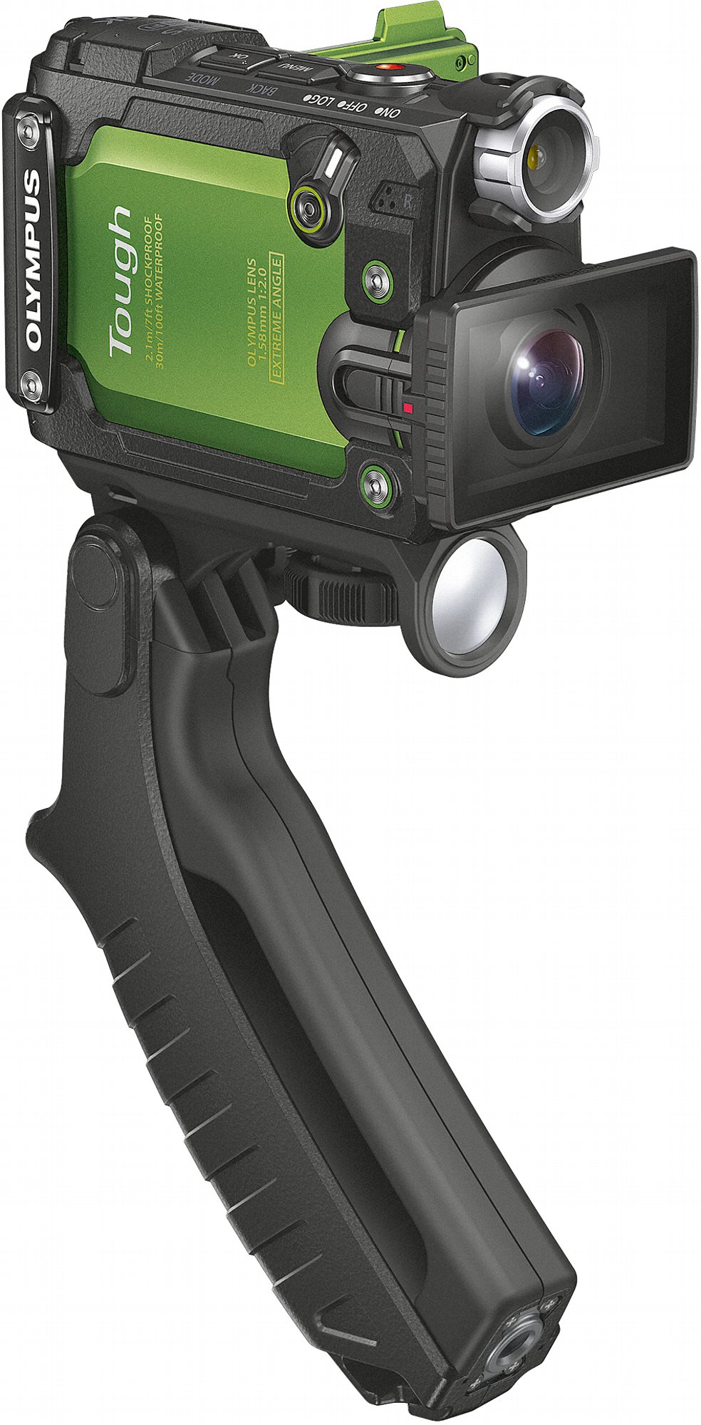 Im Lieferumfang der TG-Tracker enthalten sind zwei Objektivabdeckungen, eine gewölbte für über Wasser und eine plane für Unterwasser. Mit diversem Befestigungs-Zubehör schlägt Olympus sich gar nicht erst herum und legt stattdessen einen "Mount Coupling" (mit "Selfie-Spiegel!) genannten Adapter bei, mit dem die Kamera laut Pressemitteilung mit "zahlreichem Zubehör von Drittanbietern" verwendet werden kann, vermutlich also GoPro-Kompatibel (was prima ist, denn dafür gibt es wirklich jede erdenkliche Art von Halterungen). Mit dabei ist auch ein "Steady Grip" genannter Griff. Der ist aber nicht "steady", sondern nur ein einfacher Handgriff. Der so ausgestattete Olympus TG-Tracker wird 349,00 Euro (UVP) kosten. Markteinführung ist im Juli 2016.