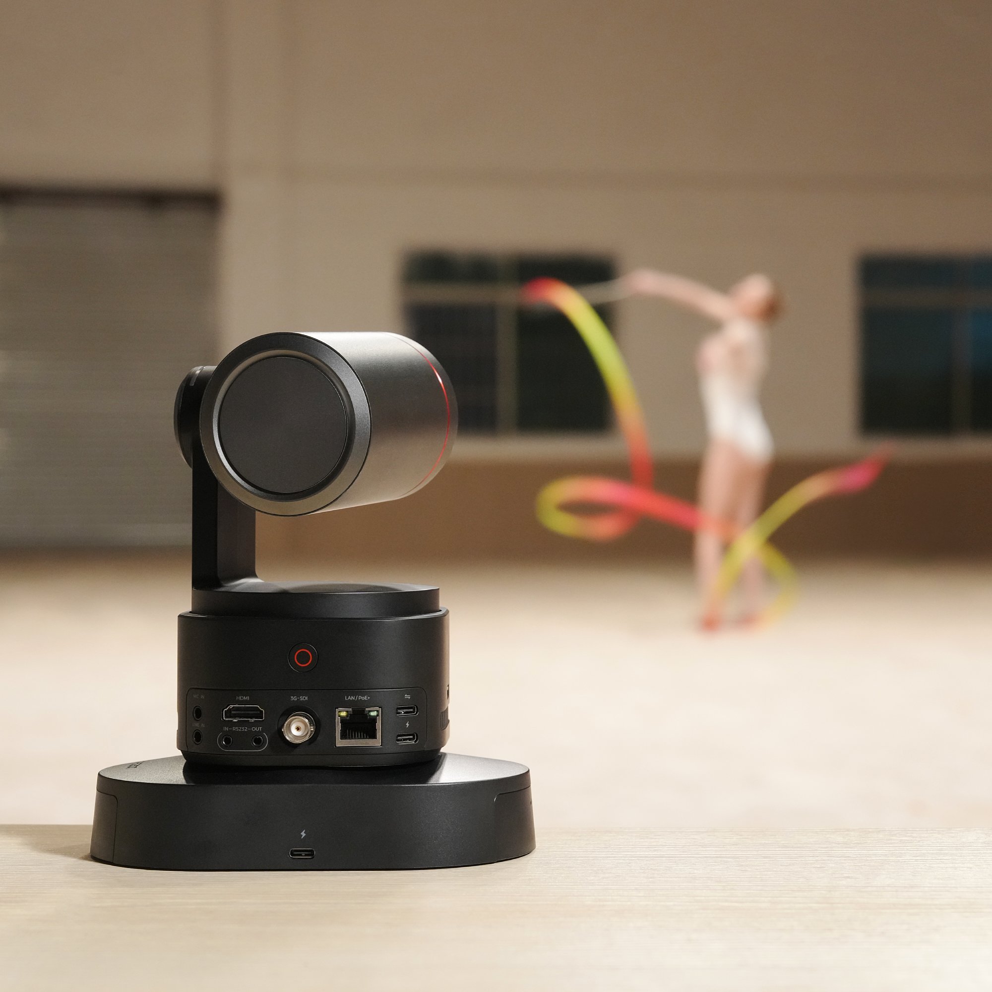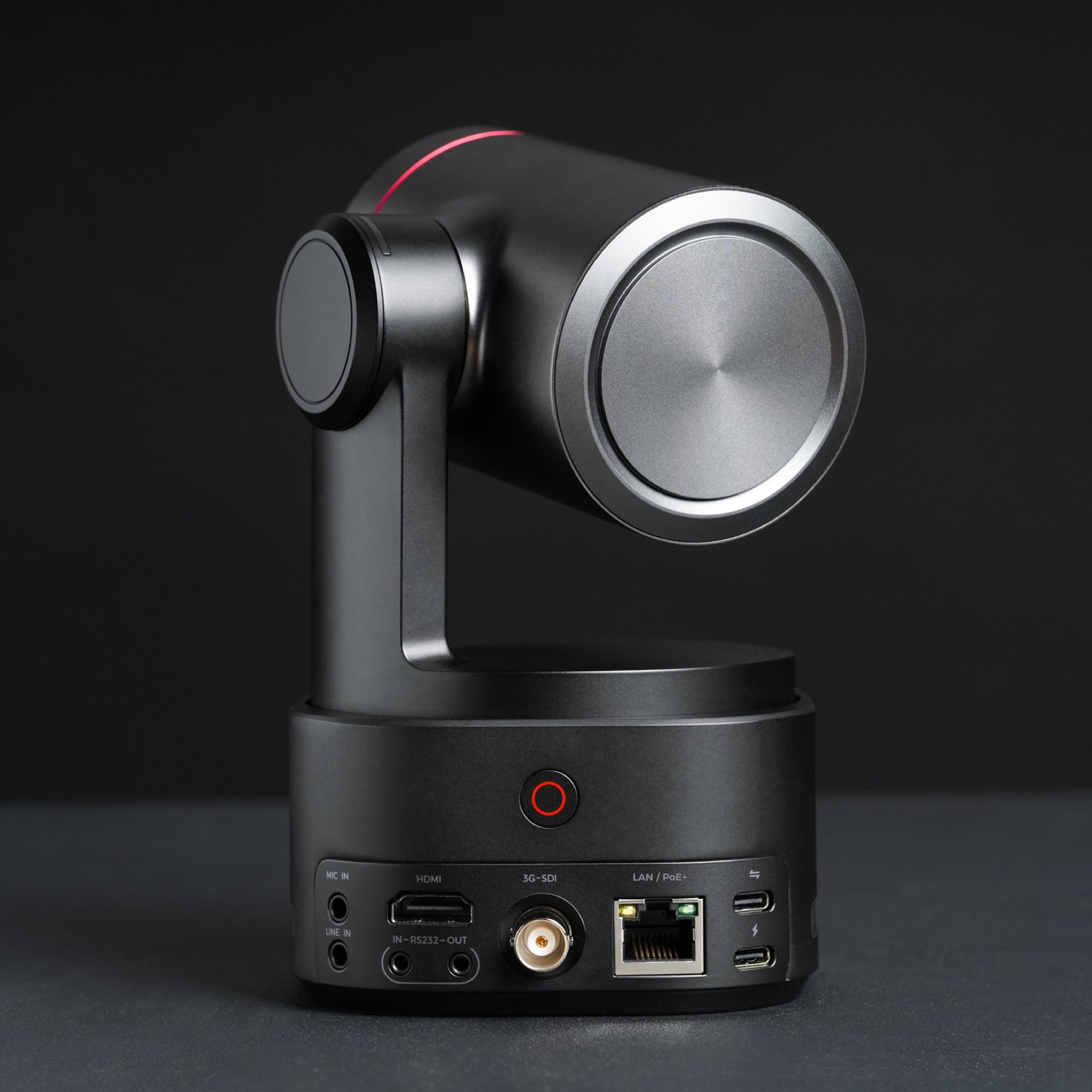Knapp über ein Kilogramm Gewicht bringt die OBSBOT Tail 2 auf die Waage. Das ist auch dem stattlichen Objektiv geschuldet, das in einem 9,5 cm langen Zylinder mit 6,5 cm Durchmesser steckt und neben der erwähnten Drehmechanik ein komplett innenliegendes, mit F1,8 bis F3,0 recht lichtstarkes Objektiv mit 12 Linsen und optischem 5-fach-Zoom. Die Kleinbild-Brennweite entspricht 22 bis 110 mm. Zur sicheren Führung ist natürlich auch der Gimbal entsprechend groß, und die bewegliche Einheit sitzt auf einem Gehäusesockel, in dem ein stattlicher Akku für bis zu fünf Stunden Dauerbetrieb und zahlreiche Anschlüsse sitzen. Die Unterseite ist natürlich mit einem Stativgewinde versehen, aber ebenso mit einer rutschfesten Gummifläche. Wenn ein geeigneter Untergrund vorhanden ist, kann man die Tail 2 also einfach dort aufstellen.