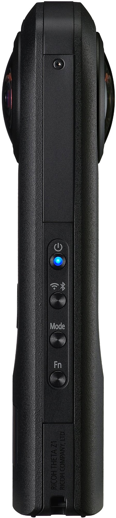 Darüber hinaus wurde auch die Bedienung der Theta Z1 deutlich verbessert. Im unteren Teil des Gehäuses wurde erstmals ein 0,93-Zoll (2,4 cm) Monitor mit OLED-Technologie integriert, auf dem wichtige Status-Informationen sofort abrufbar sind. Beispielsweise werden dort der Aufnahmemodus, die verbleibende Akkuladung, die Anzahl der möglichen Aufnahmen, der Blendenwert oder die ISO-Empfindlichkeit angezeigt. Zudem bietet die neue Fn-Taste direkten Zugriff auf bestimmte Funktionen oder favorisierte Voreinstellungen.