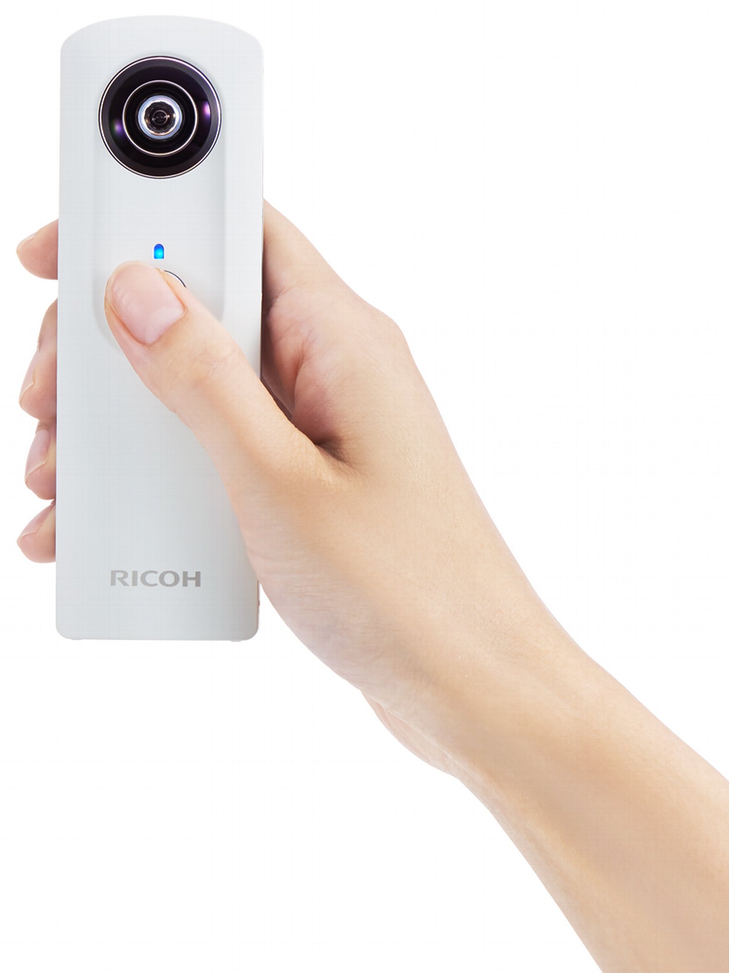 Rein äußerlich unterschiedet sich die neue Version praktisch nicht vom Vorgänger, das im September 2013 als erste vollspärische One-Shot-Panoramakamera vorgestellt wurde. Die Ricoh Theta besitzt zwei Objektive in einem sehr kleinen und schlanken Gehäuse. Eines ist nach vorne und eines nach hinten gerichtet. Über ein Prisma wird das Bild auf jeweils einen Bildsensor in der Kamera gelenkt, es werden also gleichzeitig zwei Aufnahmen geschossen, die noch in der Kamera zu einer Panoramaaufnahme zusammengefügt werden und bis auf einen winzigen Bereich, in dem die Kamera sozusagen selbst im Bild ist, wird damit jeder Blickwinkel erfasst, also ein vollständiges Rundum-Panorama erzeugt.