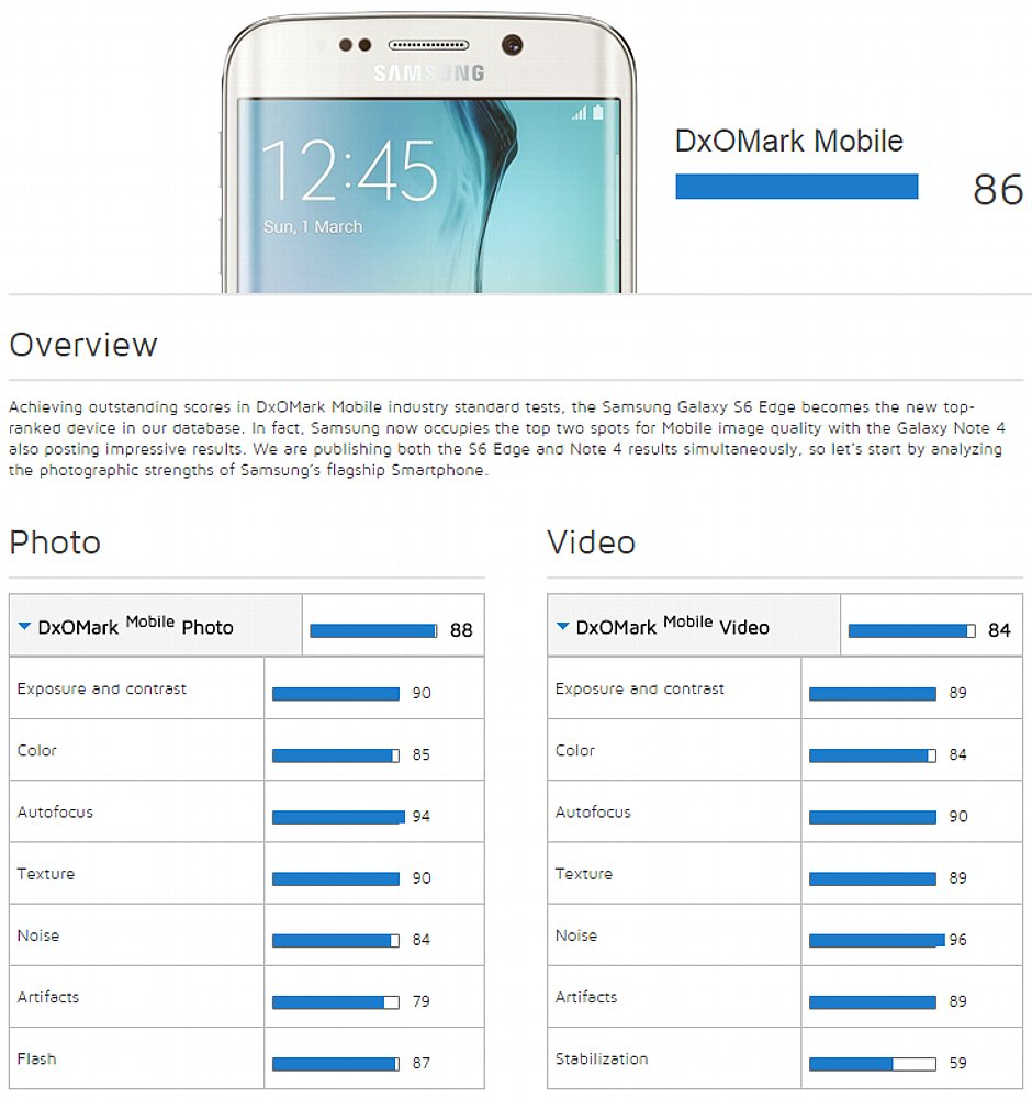 Der Durchschnittswert von 86 für den DxOMark-Mobile-Test beim Samsung Galaxy S6 Edge ergibt sich aus 88 Punkten für Foto und 84 Punkten für Video. Beides stellen die aktuellen Bestwerte bei DxOMark Mobile dar. Damit liegt das Galaxy S6 Edge vier Punkte über dem bisherigen Spitzenreiter iPhone 6 und iPhone 6 Plus und sieben Punkte über dem Samsung Vorgängermodell Galaxy S5.