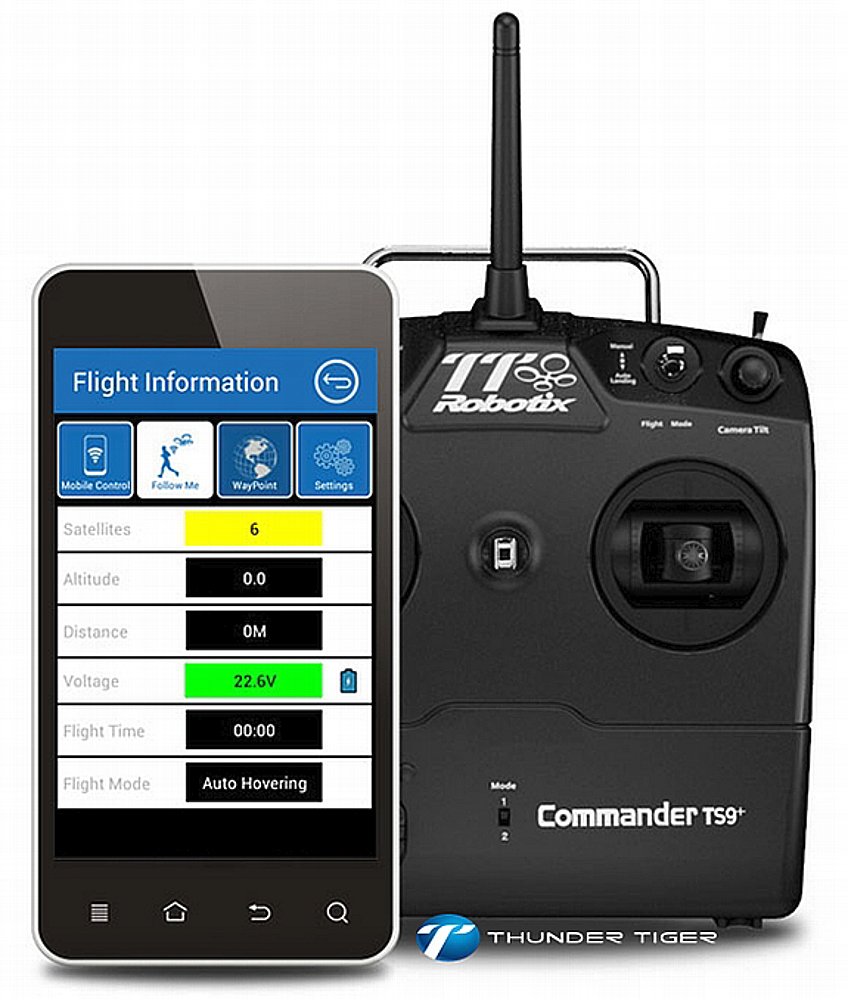 Steuern kannst du den Ghost über Joysticks an der serienmäßigen Fernbedienung auf bis zu 1000 Meter Entfernung. Die Kamerarotation am Gimbal erfolgt natürlich in alle Richtungen (360 Grad horizontal, +/- 90 Grad vertikal), wobei das Schwenken nach oben durch den Quadrocopter selbst nur eingeschränkt sinnvoll ist. Alternativ kannst du die Fernbedienung auch über eine App auf dem Smartphone bzw. Tablet vornehmen: alle Einstellungen der Drohne sind auf der App-Oberfläche verfügbar, die Flugsteuerung übernimmst du, indem du dein Smartphone entsprechend neigst. Ein Live-Bild kannst du offenbar weder auf dem Smartphone, noch der Fernbedienung empfangen, nur die Flugdaten werden an das UI weitergeleitet. Integriert ist dafür die Follow-Me-Funktion, mit der die Drohne in definiertem Abstand und gewünschter Flughöhe deinem Smartphone folgt.
