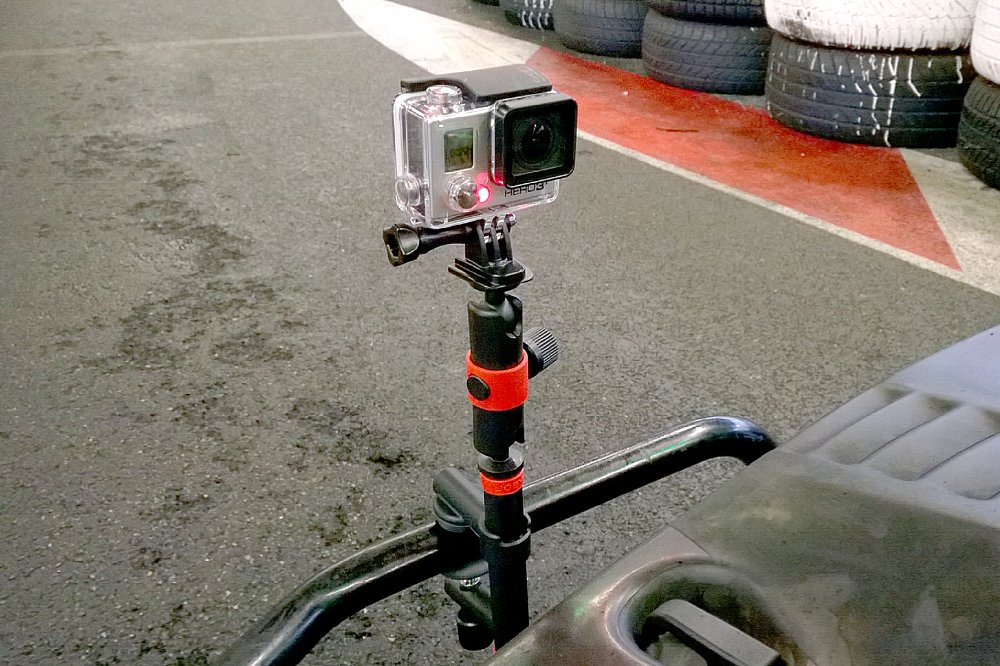 Ein weiteres Produkt aus der Actioncam-Serie von Joby ist die Action Clamp, die mit dem Locking Arm oder einem so genannten GorillaPod-Arm verbunden werden kann. Sie selbst hat eine bis zu 5 cm verstellbare Klammer, um deine Actioncam sicher an unterschiedlichen Orten und Oberflächen festzuschrauben. Schilder, Handläufe, Tischkanten oder Türen eignen sich hervorragend für die Befestigung des Action Clamp. Durch eine Kerbe in der einen Spannzange und die griffige Gummi-Oberfläche hält sie aber auch recht gut an runde Durchmesser wie z. B. Fahrrad-Lenker oder dem Fahrgestell von Gokarts. Der Locking-Arm wird dann in einer der 1/4-Zoll-Gewinde, die sich an beiden Seiten der Action Clamp befinden geschraubt. Durch zwei Kugelgelenke lässt sich der Locking Arm frei in verschiedenen Winkeln positionieren und ermöglicht so einen gewissen Abstand von der Action Clamp. Mit der griffigen Schraube zieht man beide Kugelgelenke des Locking Arms gleichzeitig fest. Die Spannzangen sind aus Kunststoff und halten sehr gut. Die Maße der Action Clamp betragen 51 x 22 x 113 mm, während der Locking Arm 69 x 32 x 130 mm misst. Durch diese recht kompakten Größen und das Gesamtgewicht von knapp 130 g sind die Halterungen auch leicht zu transportieren. Diese Kombination hat uns übrigens außerordentlich gut gefallen. Sie ist klein und leicht und hält super. Der Locking Arm ist blitzschnell eingestellt und gibt dir 10 cm Spielraum in jede Richtung.