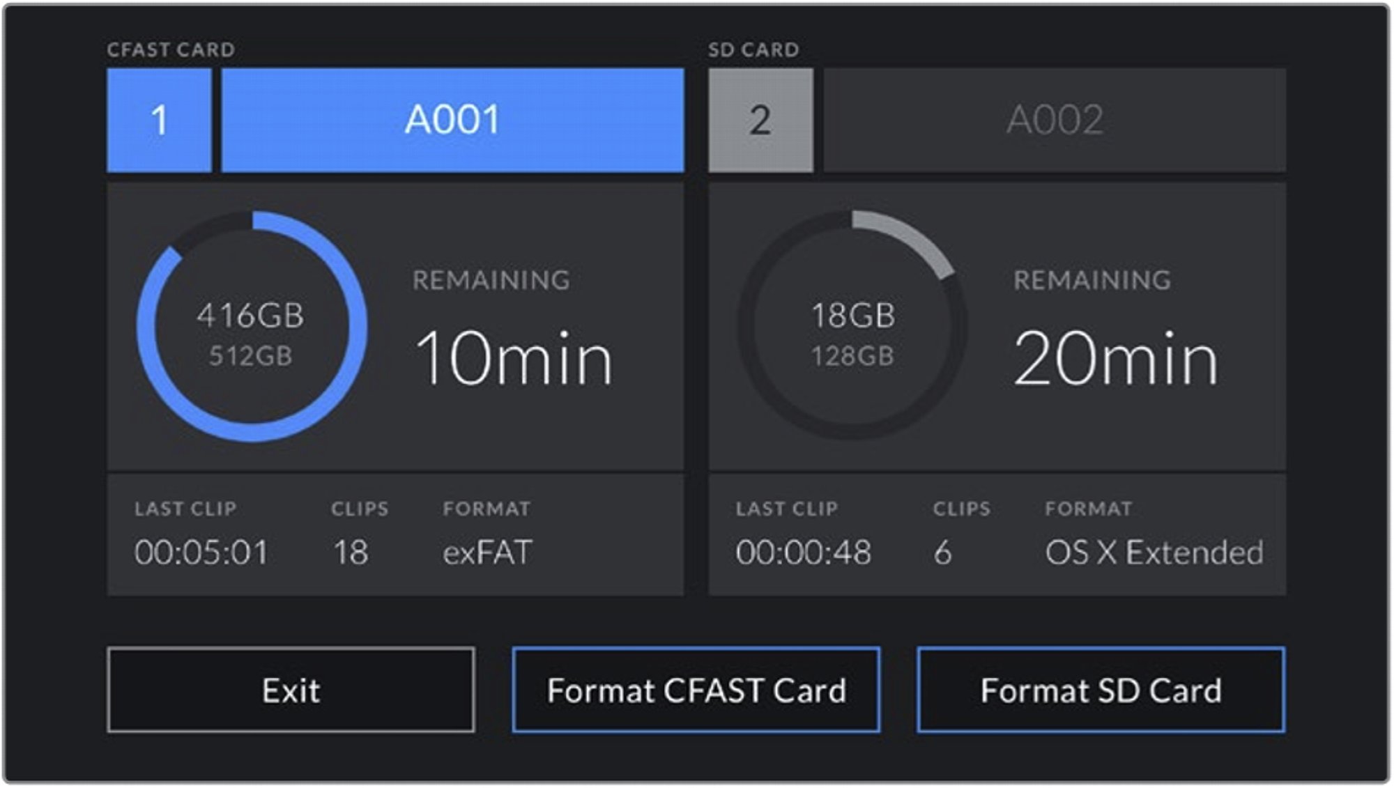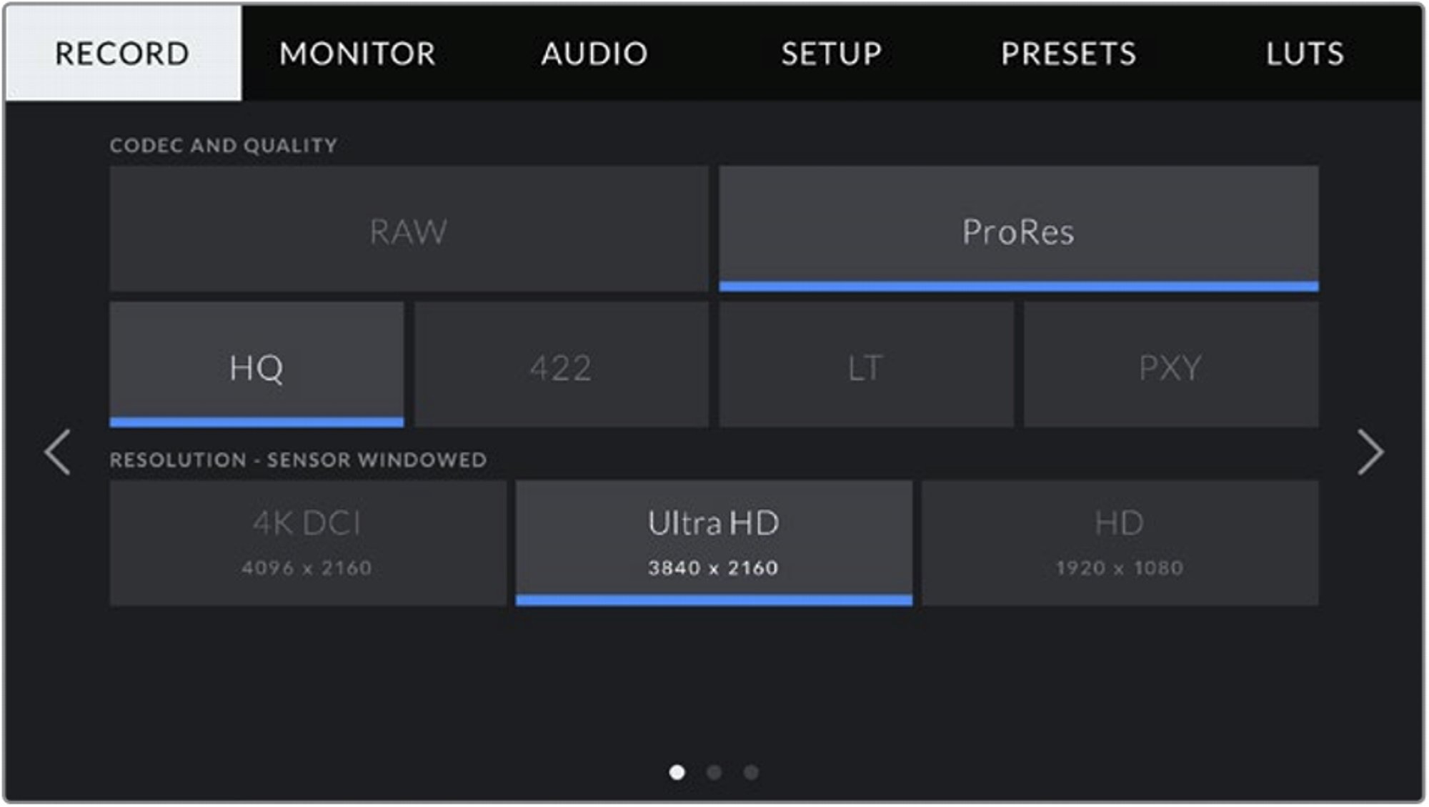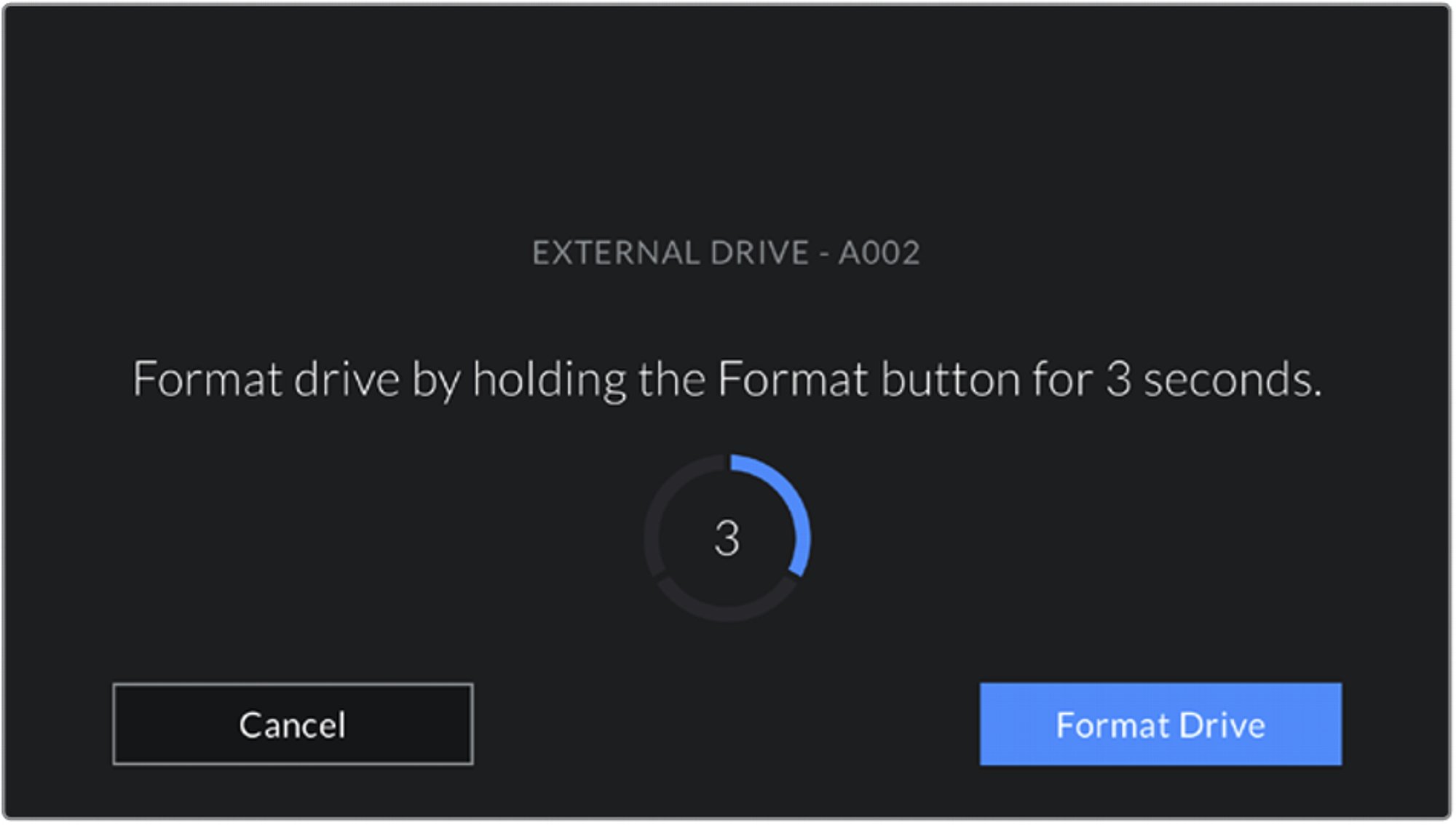Einen so großen Monitor zu verbauen, macht natürlich grundsätzlich viel Sinn, vor allem wenn man dann auch noch die Bedienung so schön darauf abstimmt, wie Blackmagic es getan hat. Der Monitor bietet nämlich nicht nur jede Menge Überblick beim Filmen und bei der Wiedergabe, sondern auch die Bedienung der Kamera ist so wie man es heute eigentlich erwarten könnte, wie aber in der Foto/Video-Branche so gar nicht üblich ist. Der große Bildschirm bietet genug Platz für aufgeräumte, für Touch-Bedienung optimierte Bildschirmstruktur bei der Konfiguration. Die Bildschirm-Menüs sind nie überfrachtet, Schrift und Schaltflächen sind groß und super lesbar. "Gefährliche" Tätigkeiten, wie z. B. das Formatieren von Speichermedien erfordern drei Sekunden langes Drücken der Schaltfläche "Format Drive". Darauf weist ein entsprechender Text hin und so kann wirklich gar nichts schiefgehen.