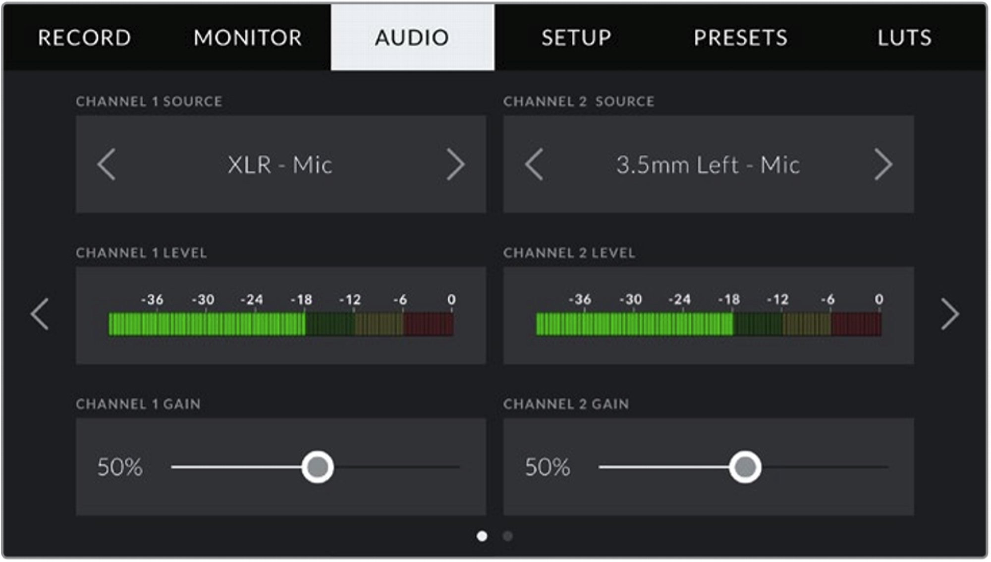 Externe Mikrofone lassen sich an einer 3,5mm-Stereoklinkenbuchse und an einer Mini-XLR-Buchse anschließen. Letztere bietet 48V-Phantomspeisung für entsprechende Mikrofone. Über Adapter Mini-XLR auf normales XLR lassen sich dann auch alle normalen Mikrofone verwenden. Beide Eingänge lassen sich gleichzeitig verwenden und auf die beiden Aufzeichnungskanäle legen. So kann beispielweise ein auf der Kamera aufgesetztes Mikrofon (Mono oder Stereo) auf die linke Spur gelegt werden und dort Mono aufgezeichnet werden, während ein an die XLR-Buchse angeschlossenes Mikrofon (z. B. eine Funkstrecke) auf den rechten Kanal gelegt wird. Natürlich kannst du beide Kanäle getrennt manuell aussteuern (eine automatische Steuerung oder einen Begrenzer hat die Kamera nicht).