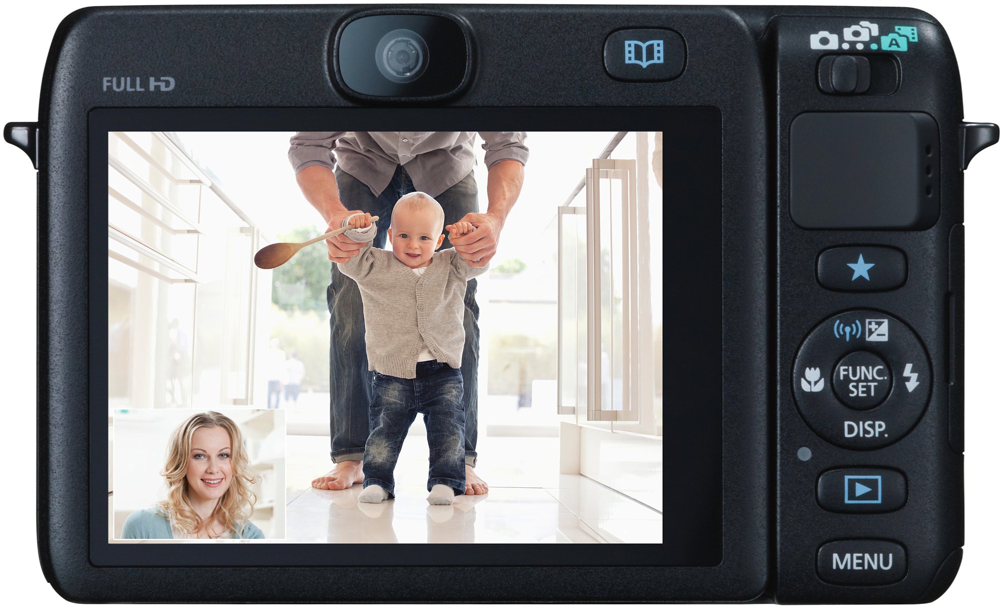 Eine weitere Funktion, die die PowerShot N100 bietet, nennt sich Hybrid-Auto. Damit entgeht niemandem ein schönes Motiv, denn von jeder Fotoaufnahme zeichnet die Kamera automatisch einen Videoclip von vier Sekunden auf. Hybrid-Auto kann zudem mit der Dualen Aufnahme kombiniert werden. In diesem Fall wird dann die Person hinter der Kamera jeweils zwei Sekunden vor und nach dem Druck auf den Auslöser aufgenommen. Am Ende des Aufnahmetages werden alle Clips zu einem 720p-Film zusammengefasst, damit auch die Entstehungsgeschichte der Fotos dokumentiert wird. Im Test funktionierten beide Aufnahmetechniken problemlos und sie sind sicher spaßige Innovationen. Trotzdem fragen wir uns, ob wirklich jemand sowas nutzen wird. Canon unterstreicht, dass die Kamera den Fotografen selber in den Fokus rückt, aber wir sind nicht davon überzeugt. Denn leider erinnert das kleine Rück-Bild eher an einen FaceTime-Videoanruf und vermittelt den Eindruck, dass der Fotograf irgendwo anders ist – das ist schon ein wenig schade.