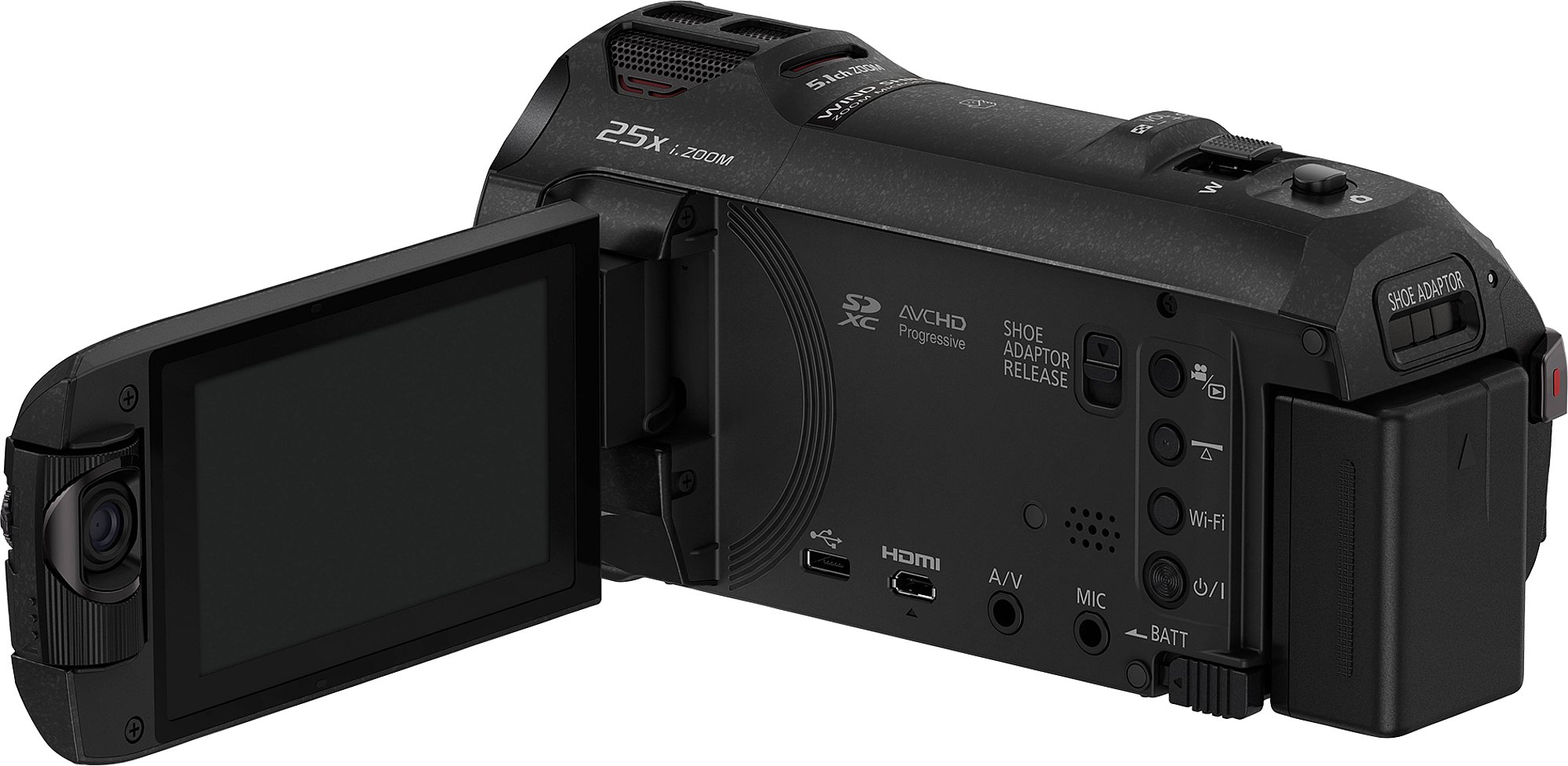 Der Panasonic HC-W878/HC-W979 ist klein und mit gerade mal 448 Gramm (betriebsbereit inkl. Akku und Speicherkarte) auch leicht. Die Handlage und Ergonomie ist gut. Die Hand umfasst die Oberkante des Camcorders. Dort stört nichts, nicht einmal ein Zubehör-Schuh, der dort oben eigentlich sitzt und hingehört. Dafür liegt ein Zubehör-Schuh-Adapter bei, der bei Bedarf hinten (dort wo "normalerweise" der Sucher sitzt) in einen Gehäuseschlitz eingeschoben wird und einrastet. Die Lösung mag etwas eigenwillig erscheinen – dumm ist sie aber nicht. Nur so bleibt die Gehäuseoberseite jederzeit für eine griffgünstige Kamerahaltung frei. Die Bedienung erfolgt hauptsächlich über den 3 Zoll großen, dreh- und schwenkbaren Touch-Screen. Daneben gibt es nur vier Hardware-Tasten an der linken Gehäuseseite, den Zoom-Hebel und den Fotoauslöser auf der Oberseite und die Video-Start/Pause-Taste auf der Rückseite. Ergänzt wird das noch durch ein Dreh/Drück-Rad links unten am Gehäuse. Damit lassen sich manuelle Einstellungen sehr feinfühlig justieren und bestätigen. Das Rad läuft wirklich extrem schön gedämpft und seine Druckknopf-Funktion ist weich und geräuschlos, hat aber dennoch einen eindeutigen Druckpunkt. Besser geht es eigentlich nicht. Nicht ganz so gut hat uns die Zoom-Wippe gefallen, der Zoom könne unserer Meinung nach noch etwas sanfter anlaufen. Es fiel uns auch schwer den Punkt zwischen "läuft noch nicht" und "fängt an zu zoomen" genau zu treffen oder den Zoom in der gewünschten Geschwindigkeit laufen zu lassen (und nicht ungewollt zu beschleunigen). Schade eigentlich, dass sich das sanft laufende Dreh/Drück-Rad nicht auch zum Zoomen verwenden lässt. Aber Zoomen beim Videofilmen, das lässt man ja sowieso lieber sein.