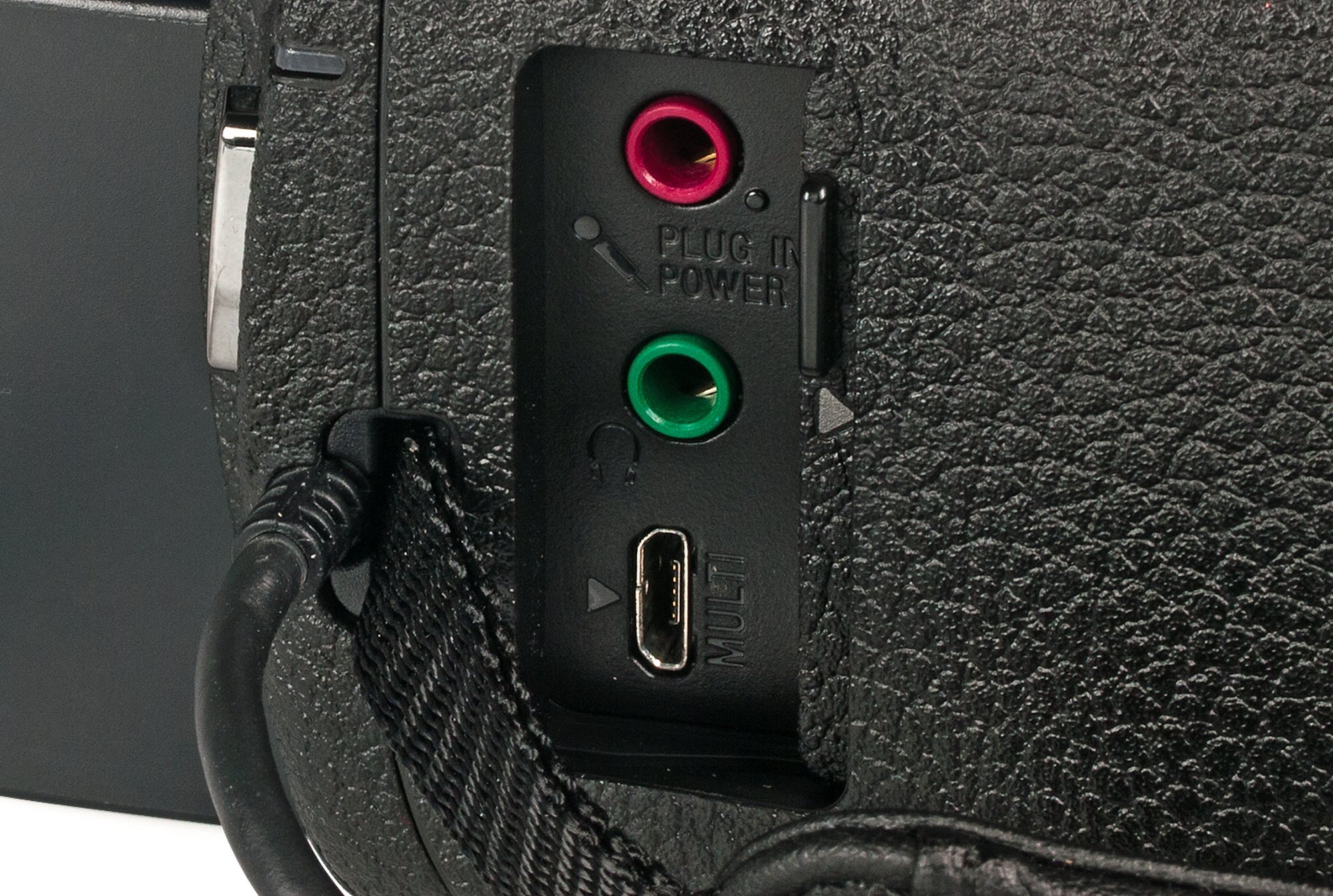 Auf der linken Seite (von der Linse aus) findest du, ebenfalls durch eine Schiebeabdeckung geschützt, den Mikrofon-Eingang, einen Audioausgang für Standard-3,5-mm-Stecker und einen MicroUSB-Multistecker. Außerdem ist hier die NFC-Schnittstelle untergebracht. Der FDR-AXP33 beherrscht nämlich auch Drahtlosverbindungen via WiFi und per NFC ist die Verbindung zu einem NFC-kompatiblen Smartphone in Sekundenschnelle hergestellt.