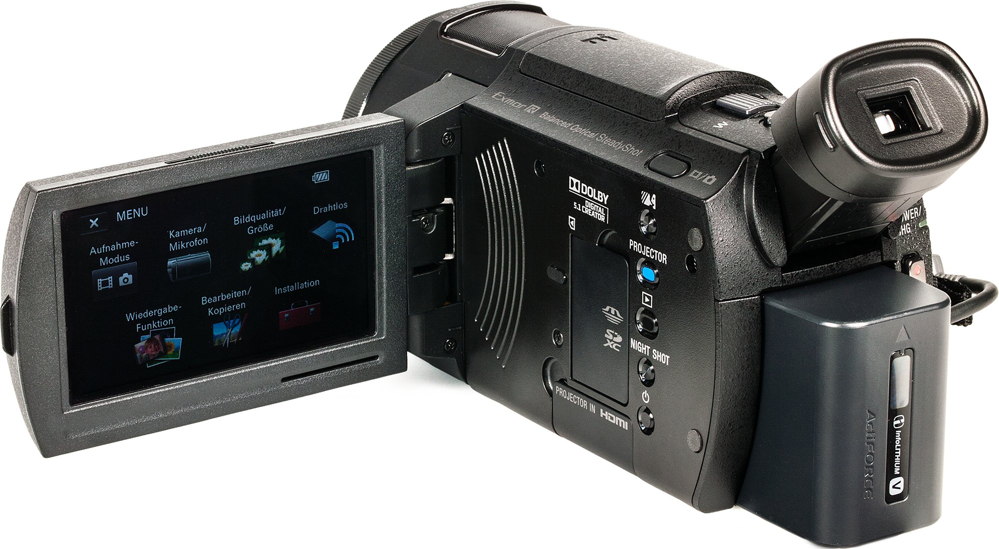 Die restlichen Bedienelemente verbergen sich hinter dem klapp- und drehbaren LC-Display mit 75 mm Bildschirmdiagonale. Ein Ein/Aus-Knopf für den Projektor (zu dem wir später noch kommen), eine Taste zum schnellen Wechsel in den Playback-Modus, ein Knopf für Nachtaufnahmen sowie die An/Aus-Taste für den Camcorder an sich. Letztgenannte brauchst du normalerweise gar nicht. Der Camcorder schaltet sich automatisch ein, wann immer du den Bildschirm aufklappst. Das kann auch etwas lästig sein. Wenn du beispielsweise nur an das Speicherkartenfach möchtest, das sich ebenfalls hinter dem Bildschirm befindet, musst du also in Kauf nehmen, dass sich dabei das Gerät hochfährt (um das zu verhindern, müsstest du zuvor den Akku abnehmen). Das klappengeschützte Kartenfach fasst SD-Karten und den Sony-eigenen Memory Stick II. Wie gewöhnlich stellt sich Sony recht zimperlich bei der Akzeptanz von SD-Karten an: Wenn du in 4K filmen möchtest, musst du eine SDXC der Klasse 10 verwenden. Für die hohe Datenrate mit 100 Mbit/s muss es sogar eine SDXC UHS-1 U3-Karte sein. Am unteren Gehäuserand findest du je einen HDMI-Ein- bzw. Ausgang. Positiv anzumerken ist hierbei, dass im Lieferumfang tatsächlich auch ein passendes MicroHDMI-Auf-HDMI-Kabel enthalten ist.