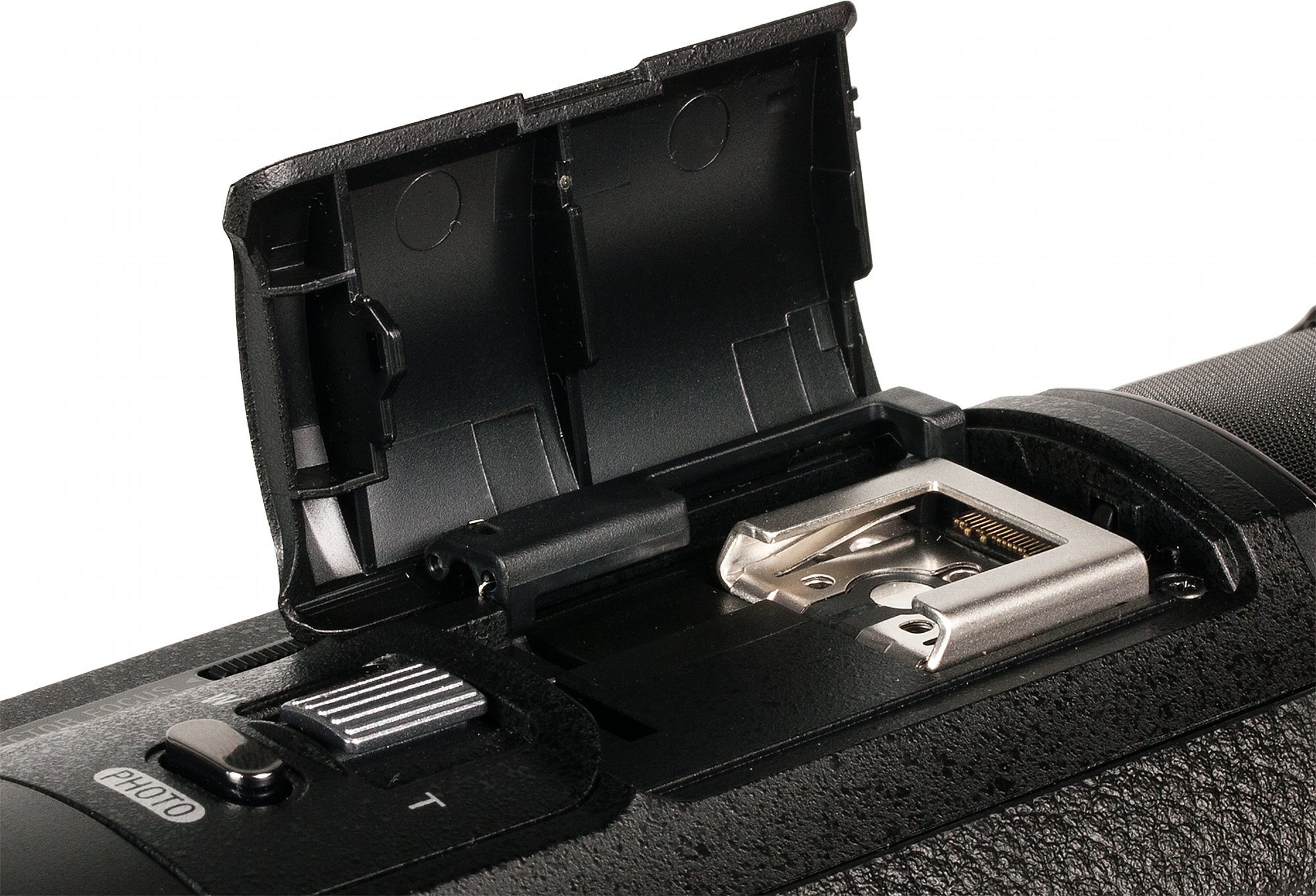 Auf der Rückseite findet der Akku Platz. Ein erfreulich dickes Ding ist mitgeliefert: Der NP-VF70 hat knapp über 2.000 mAh bei 8,4 V Spannung. Damit hält der FDR-AXP33/AX33 lange durch: 135 Minuten nonstop oder rund eine Stunde im Praxis-Betrieb mit vielem Ein- und Ausschalten und vielen Starts und Stopps. Das deckt sich durchaus mit unseren Erfahrungen.