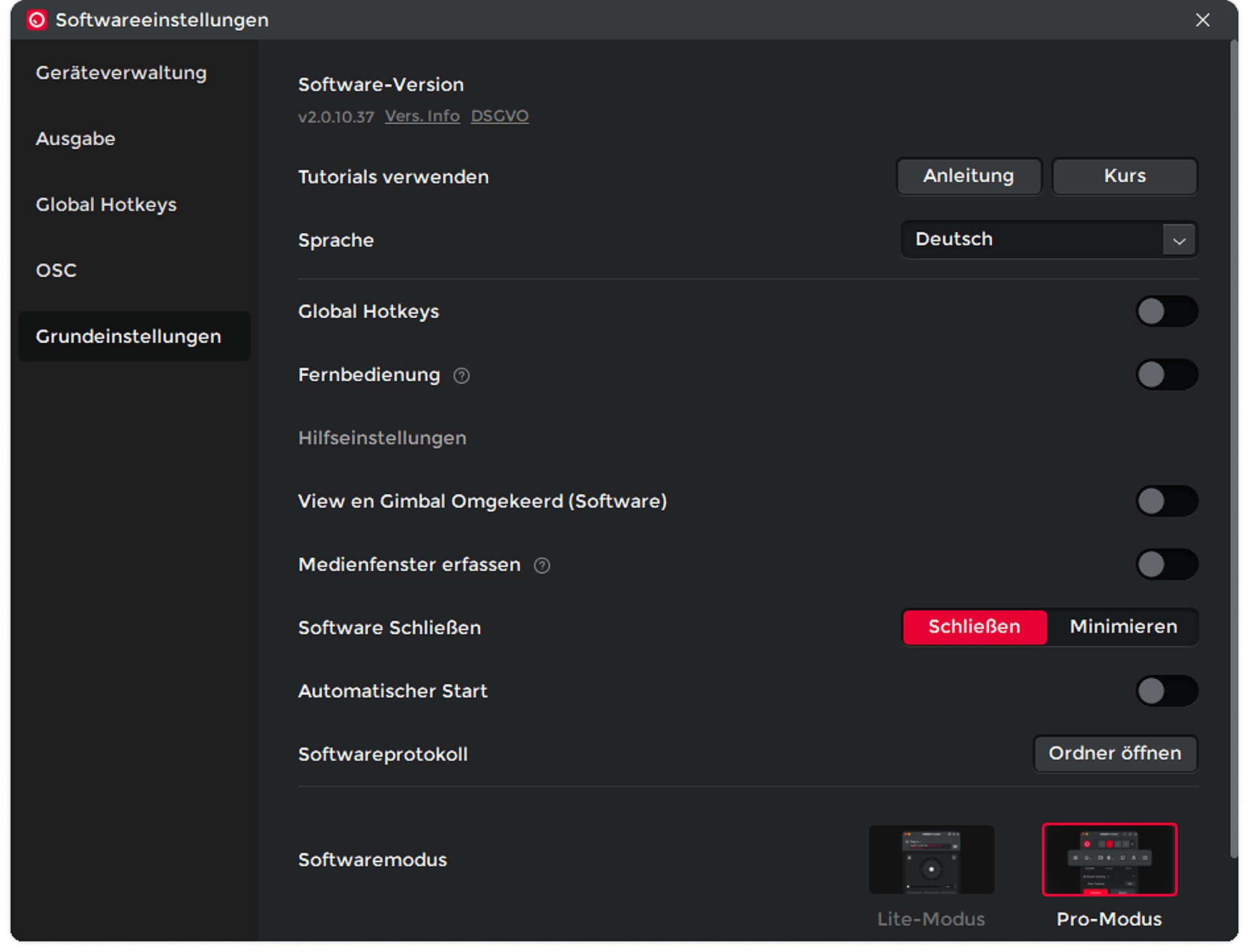 Die Software Obsbot Center ist unglaublich mächtig. Sie kann bis zu vier Obsbot -Kameras einstellen und steuern, einschließlich der Gimbals der Kameras. Für die Tiny 3 gibt es zahllose Einstellungen, von der Auflösung und Bildfrequenz, der Ausrichtung (Querformat oder Hochformat, hier vom Englischen wörtlich mit Landschaft und Porträt übersetzt), der Bitrate und anderen zahlreichen Grundeinstellungen.