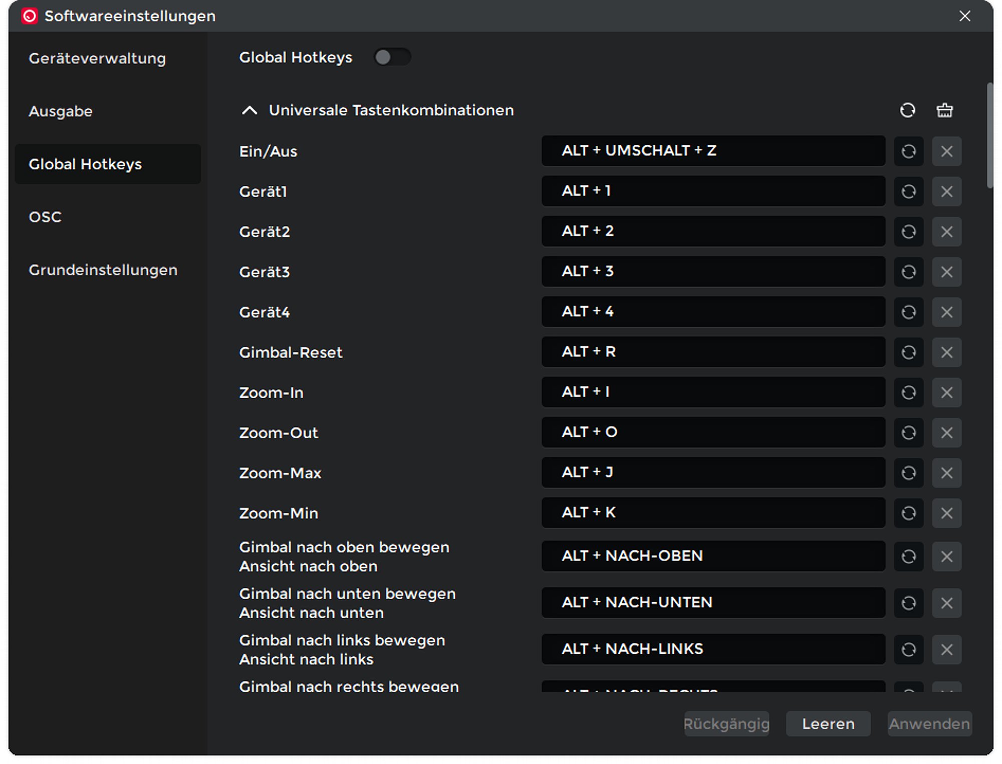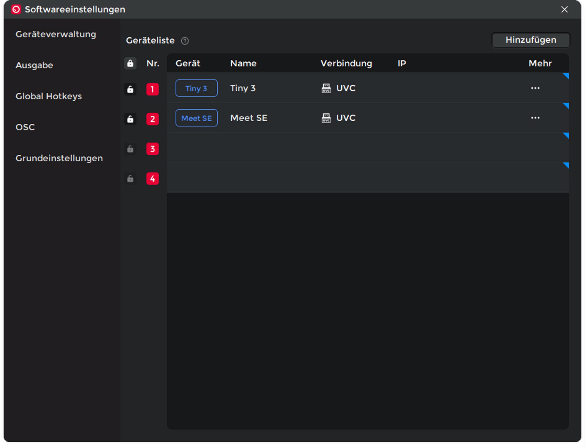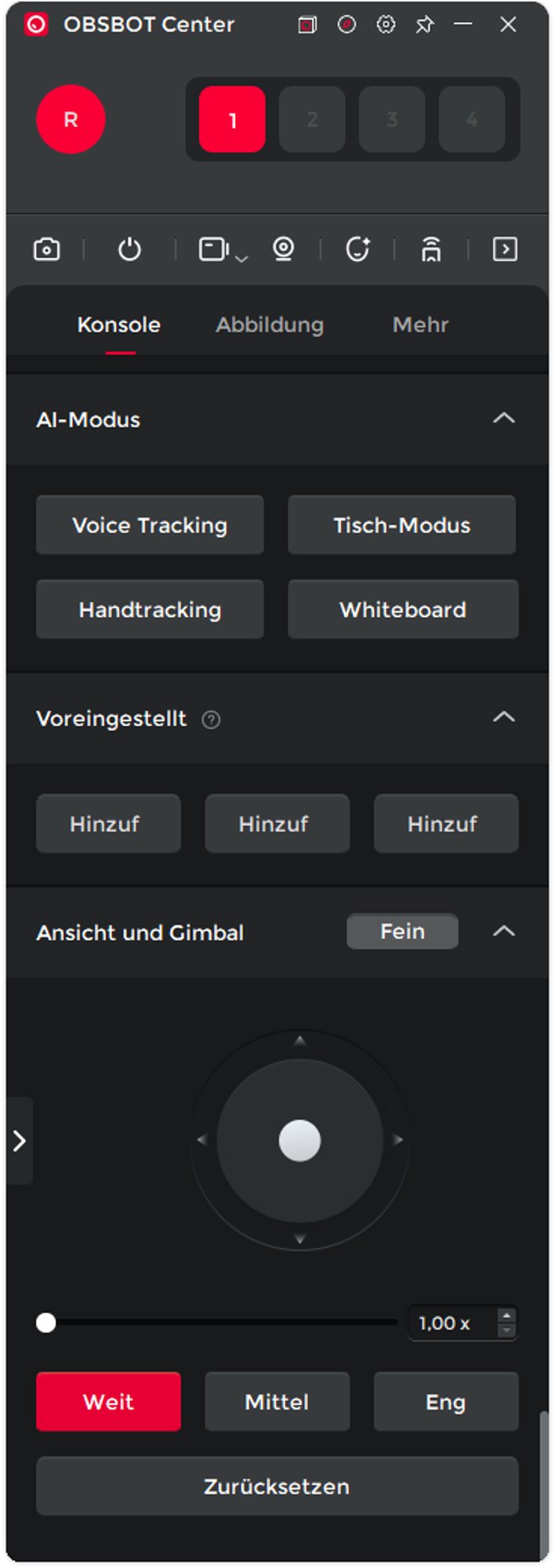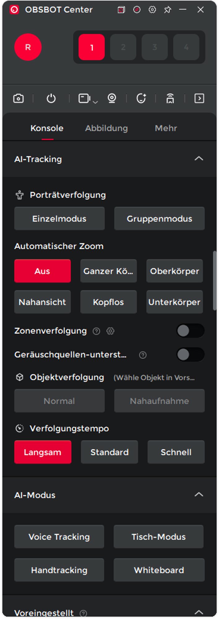 Dazu gibt es mehrere Fenster für die Kamerasteuerung, wo sich unter anderem das Auto-Framing ein- und ausschalten lässt. Zudem kann man noch beeinflussen, wie sich das Auto-Framing verhalten soll (Gruppenmodus, Oberkörper oder Nahaufnahme). Für das Zoom stehen hier insgesamt noch eine weitere Zoomstufe, alternativ zwei verschiedene, sehr moderate Zoomstufen (1,18x und 1,6x) direkt per Schnelltaste zur Verfügung und ein Zoomregler in 0,3x-Stufen bis maximal 4-fach-Zoom. Es lassen sich sogar drei beliebige Kombinationen aus Kameraausrichtung und Zoom abspeichern, also drei bestimmte Positionen, die man dann mit einem Knopfdruck jederzeit direkt ansteuern kann. Auch wie schnell oder langsam Gimbal und Zoom auf den virtuellen Joystick reagieren sollen, lässt sich einstellen, sodass man damit auch ganz sanfte Schwenks machen kann. Da bleiben also keine Wünsche offen.
