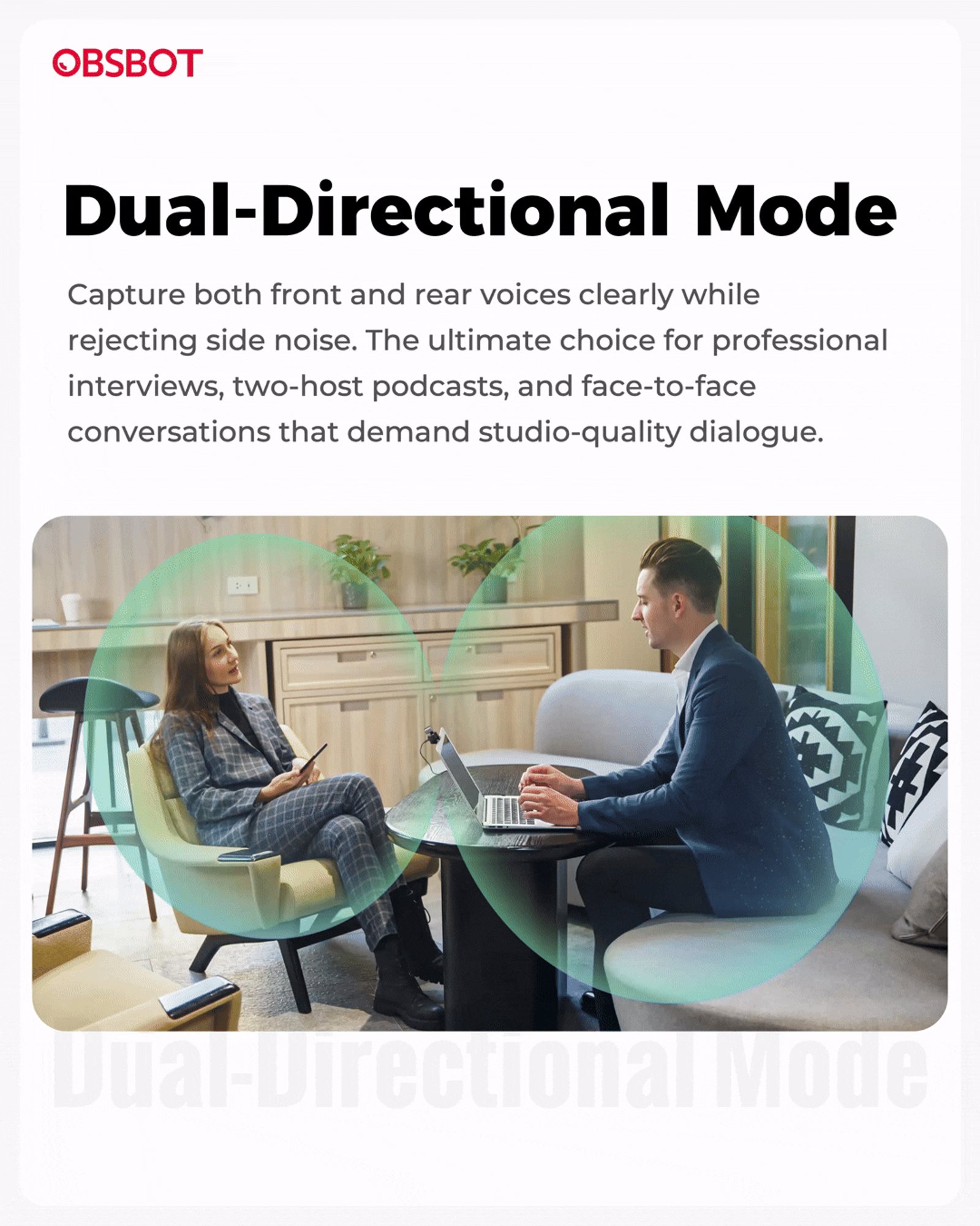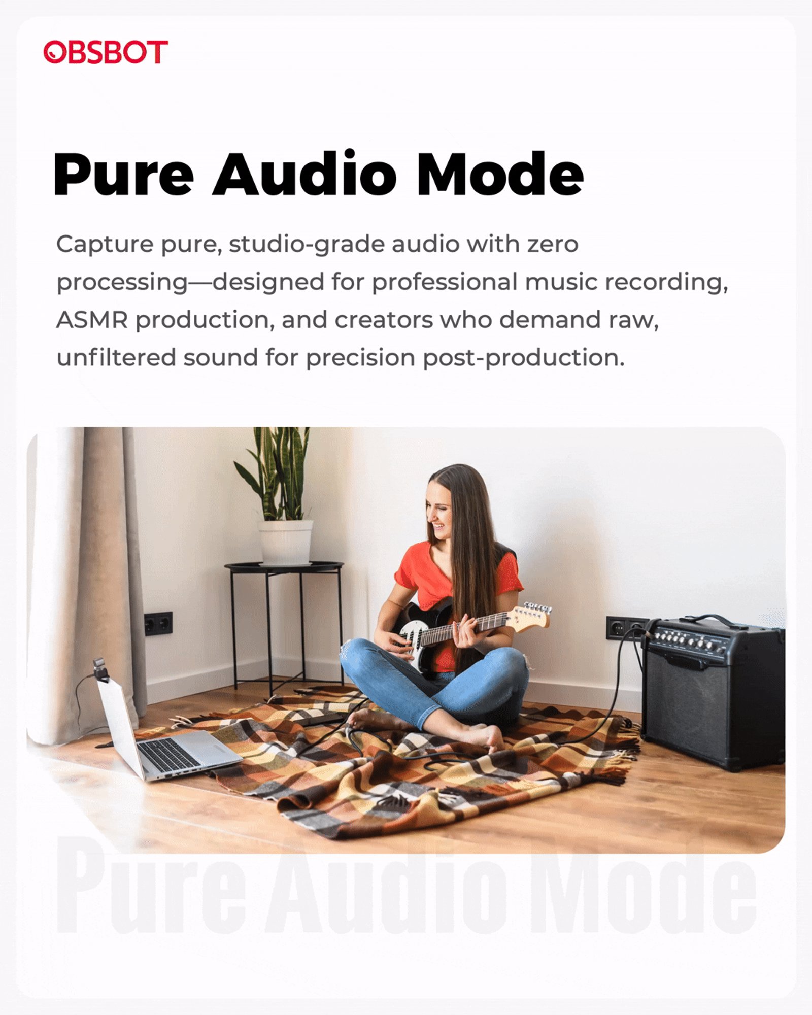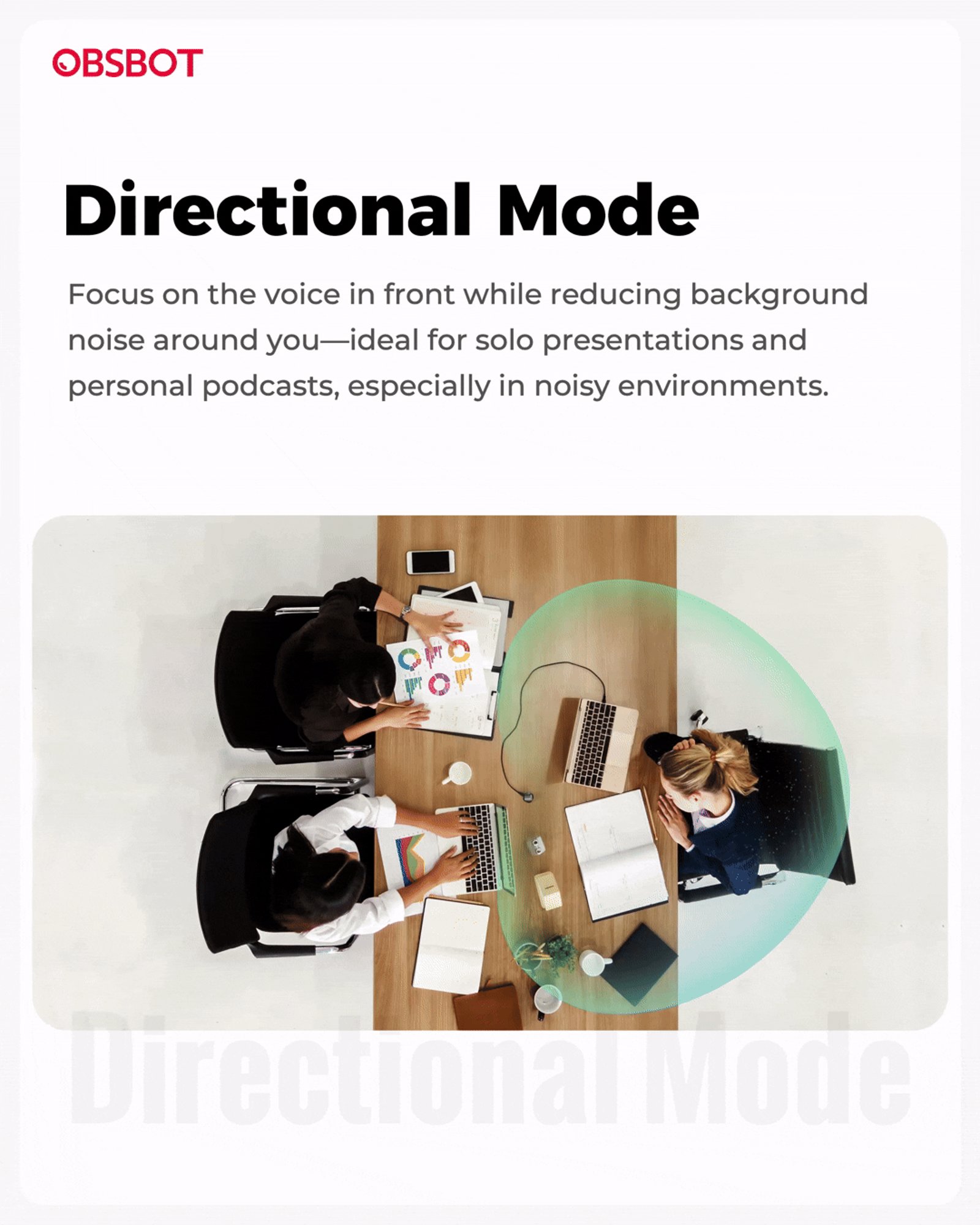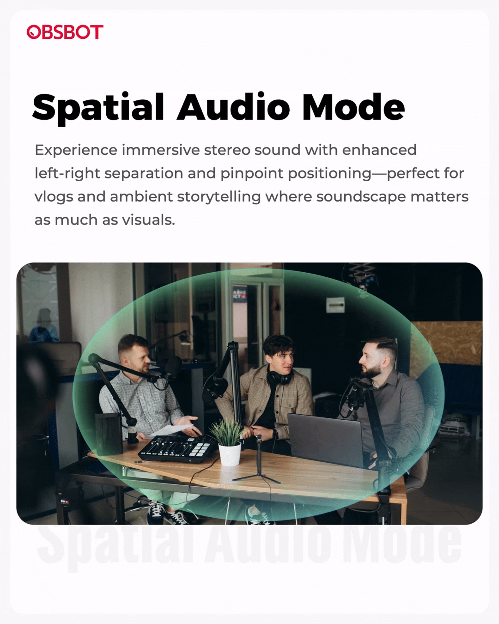 Laut Obsbot sollen die Mikrofone besonders leistungsfähig sein: Mit 130 dB Spitzenschallpegel lässt sich auch in sehr lauten Umgebungen arbeiten und 24 Bit Abtastung sollen für eine feine Tonqualität sorgen. Dazu kommen mit 69 dB Signal-Rauschabstand ein geringes Eigenrauschen und mit 50 Hz bis 20 kHz ein weiter Frequenzbereich. In der Theorie soll man damit also oft ohne weitere Mikrofone auskommen. Und wem das dennoch nicht reicht, kann alternativ bis zu zwei der neuen Drahtlos-Mikrofone namens Vox SE von Obsbot direkt mit der Tiny 3 verbinden, die Kamera hat also direkt einen Funkempfänger eingebaut. Das kann beispielsweise in lauteren Umgebungen hilfreich sein oder wenn der Sprecher weiter von der Kamera entfernt ist. Bei allem Aufwand, den Obsbot hier betrieben hat, liefert die Tiny 3 letztlich aber immer nur Mono-Ton, kein Stereo und eben erst recht kein Spatial Audio in dem Sinne, dass da irgendein räumliches Klangerlebnis bei herauskommt.