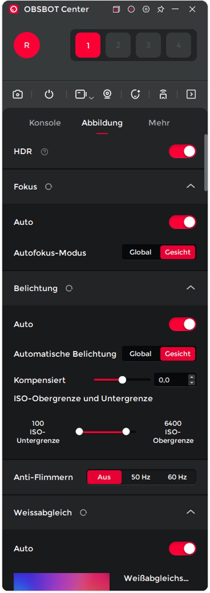 Bei all dem ist bemerkenswert, dass das, was man in der Obsbot Center Software macht, immer nur Einstellungen sind, die intern in der Kamera ausgeführt werden. Die ganze Zeit über liefert die Obsbot Tiny 3 ihr Bildsignal übers USB-Kabel direkt in die Videokonferenz-Software oder Videostreaming-Software. Der Rechner selbst oder die Software muss da gar nichts verarbeiten, das macht die Kamera alles intern.