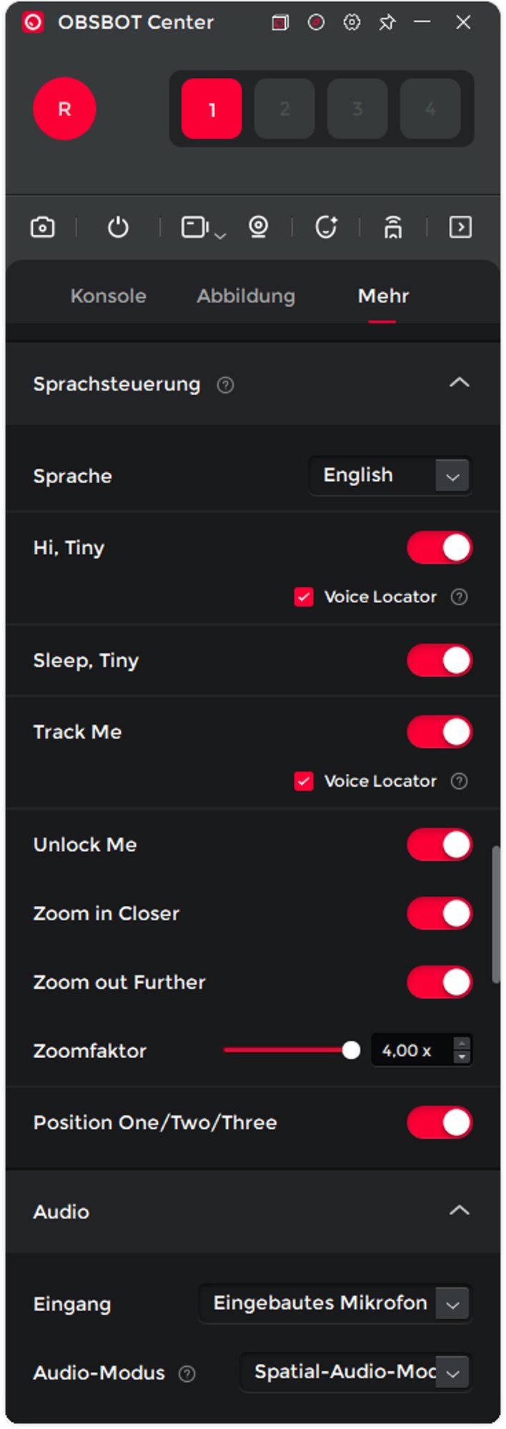 Ebenfalls sehr umfangreich sind die Mikrofon-Einstellungsmöglichkeiten: Jeder einzelne Sprachbefehl lässt sich beispielsweise ein- oder ausschalten (Aufwachen, Schlafen, Verfolgen, Zoomen, Positionen ansteuern) und ob beim Aufwachen und Tracken die Richtung, aus der der Befehl kam, die Startrichtung vorgeben soll. Auch das externe Drahtlos-Ansteckmikrofon wird über die Software erstmalig mit der Kamera verbunden und dessen Lautstärke kann geregelt werden.