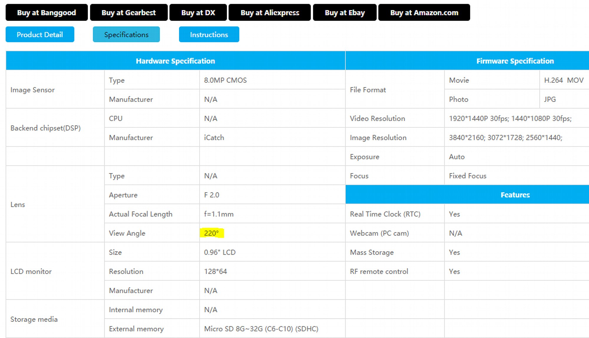 Neben (sehr preisgünstigen) Actioncams baut Shuoying auch Netzwerk-Überwachungskameras, die ein ebensolches Ultraweitwinkel-Objektiv verwenden, wie die Amkov AMK100S bzw. Shuoying PDV1800. Wenn man das Vorschaubild einer solchen Kamera als Ausschnitt betrachtet, ergbibt sich die Möglichkeit den Ausschnitt zu verändern, quasi als würde man die Kamera virtuell schwenken, eine Möglichkeit, die du mit der Actioncam mit der App am Smartphone genauso hast. Vergleicht man die technischen Daten jedoch aufmerksam, so fällt ein gravierender Unterschied auf: Amkov wirbt mit 220 Grad Bildwinkel, Shuoying gibt hingegen 190 Grad an. Also doch nicht die gleiche Kamera?