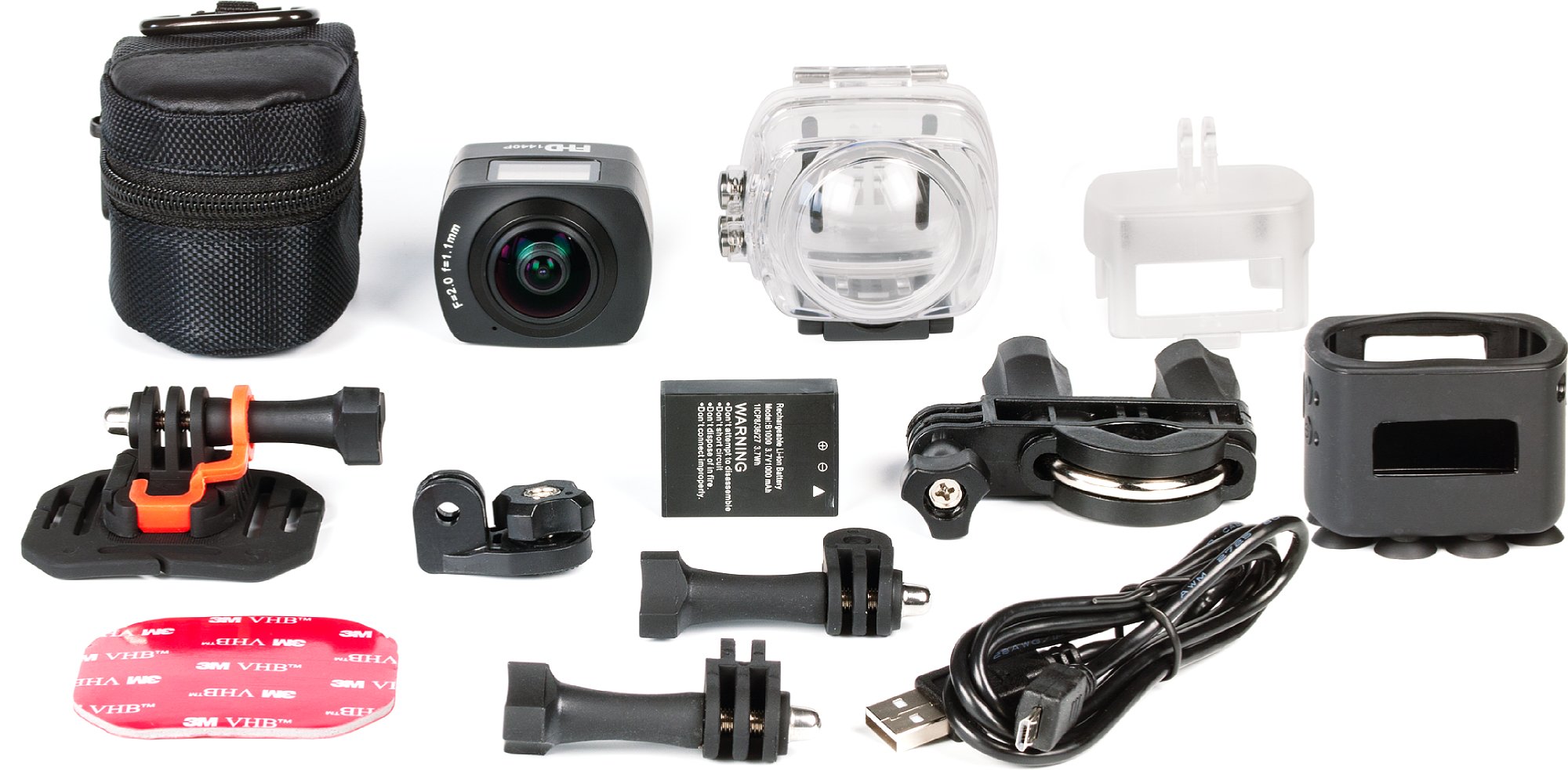 Der Lieferumfang war, wie versprochen, komplett. Neben der Kamera samt Akku sind ein 30-Meter-Unterwassergehäuse sowie eine offene Kunststoffhalterung dabei, dazu eine Klebehalterung (nur für gewölbte Flächen), zwei Gelenke und eine Fahrradhalterung sowie ein 1/4-Zoll-Kameraschrauben-Adapter. Darüber hinaus liegt im Karton eine Kameratasche bei, wichtig zum Schutz der vorstehenden Glas-Linse, sowie eine witzige Silikonhülle mit neun kleinen Saugnäpfchen, die die komplett mit Akku, Speicherkarte und Silikonhülle 101 Gramm leichte Kamera problemlos an glatten Oberflächen hält (z. B. Glasscheiben, aber auch Kunstofffenster-Rahmen, Metallflächen usw.). Die Schnittstellen, das Display und die Bedienelemente bleiben übrigens beim Betrieb in der Silikonhalterung und auch in der offenen Kunststoffhalterung zugänglich, sodass du leicht an die Speicherkarte kommst oder die Kamera auch während des Betriebs mit Strom versorgen kannst. Das geschlossene Unterwassergehäuse ist natürlich dicht, hat aber drei Knöpfe für die uneingeschränkte Bedienung.