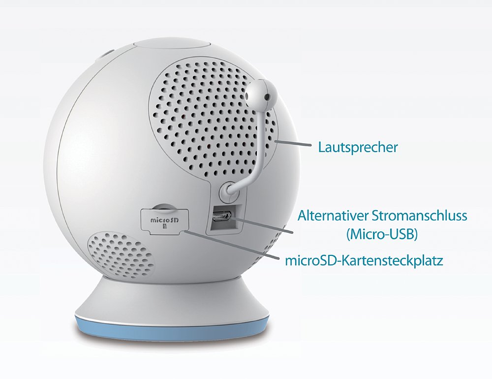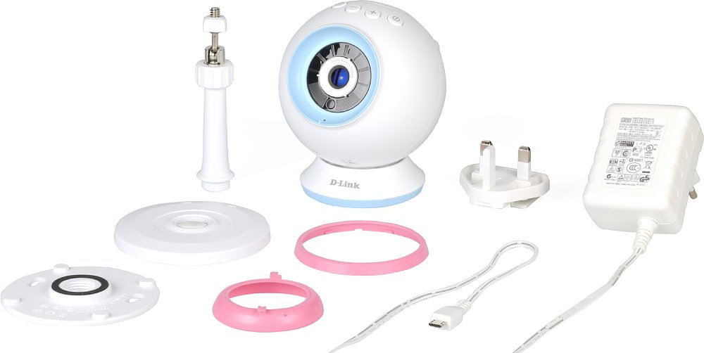 Die D-Link EyeOn Baby Camera DCS-825L wird mit einer umfangreichen Ausstattung geliefert. In der Verpackung liegen das Netzgerät mit zwei Adaptern, einen für deutsche und einen für britische Steckdosen, den Standfuß, zwei rosafarbene Akzentringe (zum Austausch gegen die hellblauen), die Gebrauchsanweisungen (leider nicht wirklich ausführlich) und das Wandmontage-Set. Oben auf dem Standfuß ist eine klebrige Gummierung eingelassen, auf die die Babycam sehr gut hält. Du kannst den Fuß jederzeit abnehmen und in einem beliebigen anderen Winkel wieder neu ankleben. Das Befestigen an der Wand haben wir selber nicht getestet aber scheint unkompliziert zu sein. Dazu erhältst du eine runde Kameramontageplatte mit zwei vorgebohrten Löchern, Dübel und Schrauben, eine weiße Plastik-Abdeckung und einen Kamera-Schaft. Auch die Akzentringe können sehr schnell ausgetauscht werden: einfach den schon angebauten blauen Ring gegen den Uhrzeigersinn drehen und ihn abnehmen. Dann bringst du den rosafarbenen Akzentring an und drehst du ihn, bis er einrastet.