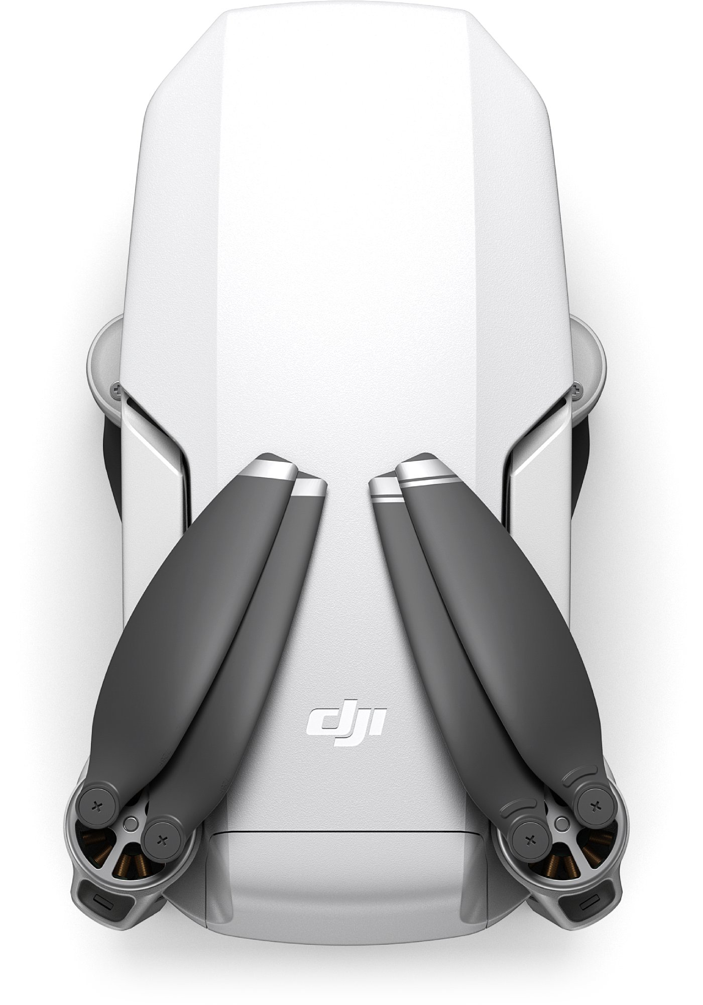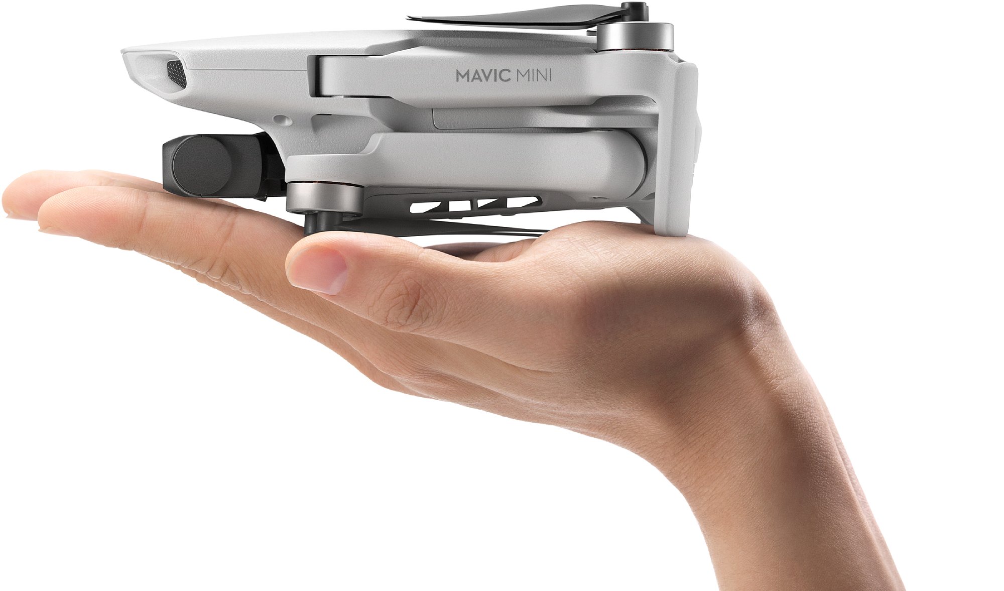 Kommen wir endlich zum eigentlichen Star des Abends, der DJI Mavic Mini Drohne selbst. Diese ist nicht nur kleiner als die Fernbedienung, sondern auch leichter. 249 Gramm war das Entwicklungsziel der DJI-Ingenieure. Nicht ein Gramm mehr! Diese Grenze einzuhalten bedeutet nämlich z. B. in Deutschland, dass man sich nicht um eine feuerfeste Plakette mit der Adresse des Piloten kümmern muss, die an der Drohne angebracht sein muss. In USA spart man sich unterhalb von 250 Gramm sogar die behördliche Registrierung der Drohne. Was man in Deutschland trotzdem braucht (unabhängig vom Gewicht der Drohne) ist aber eine Haftpflicht-Versicherung.