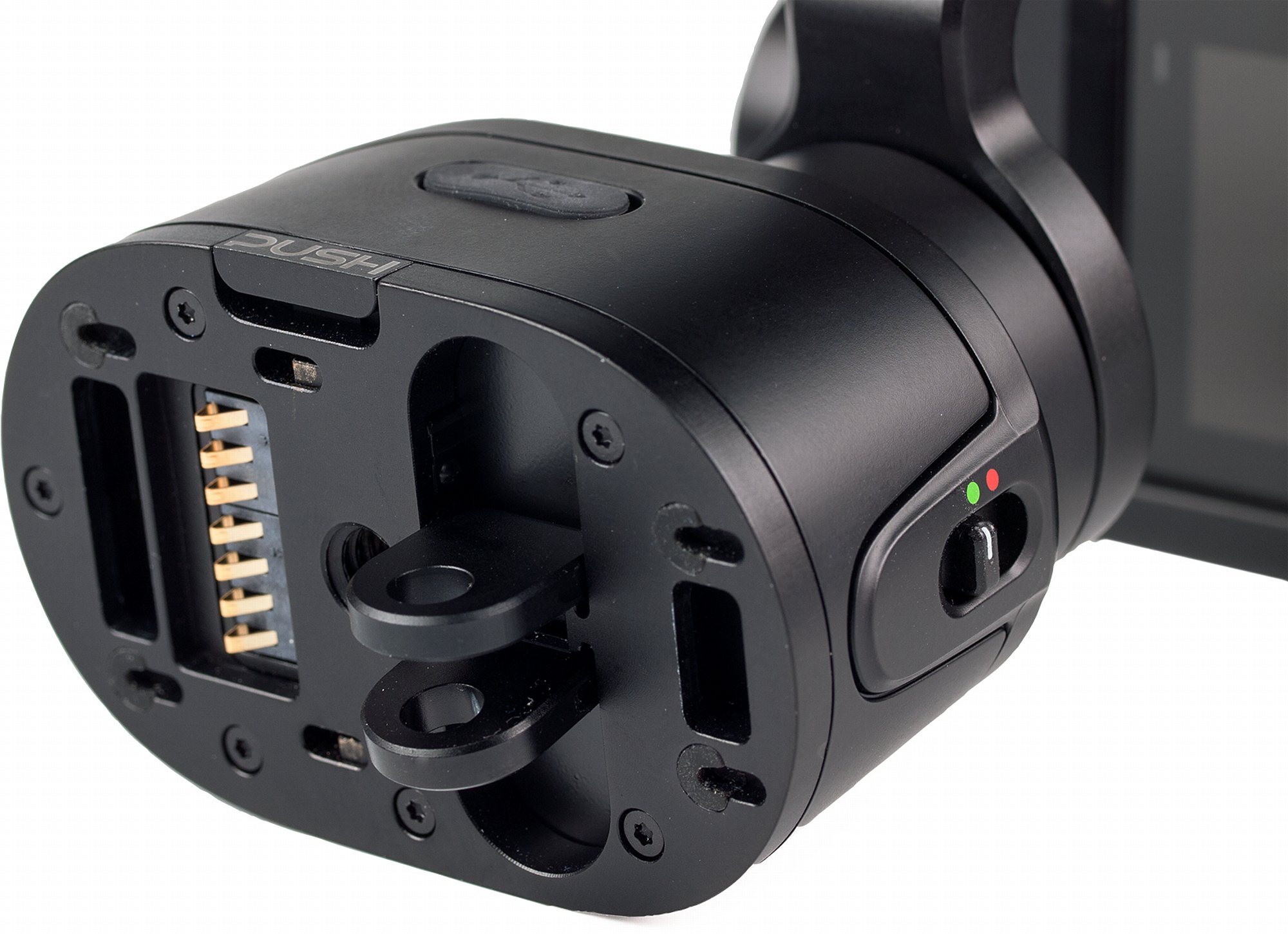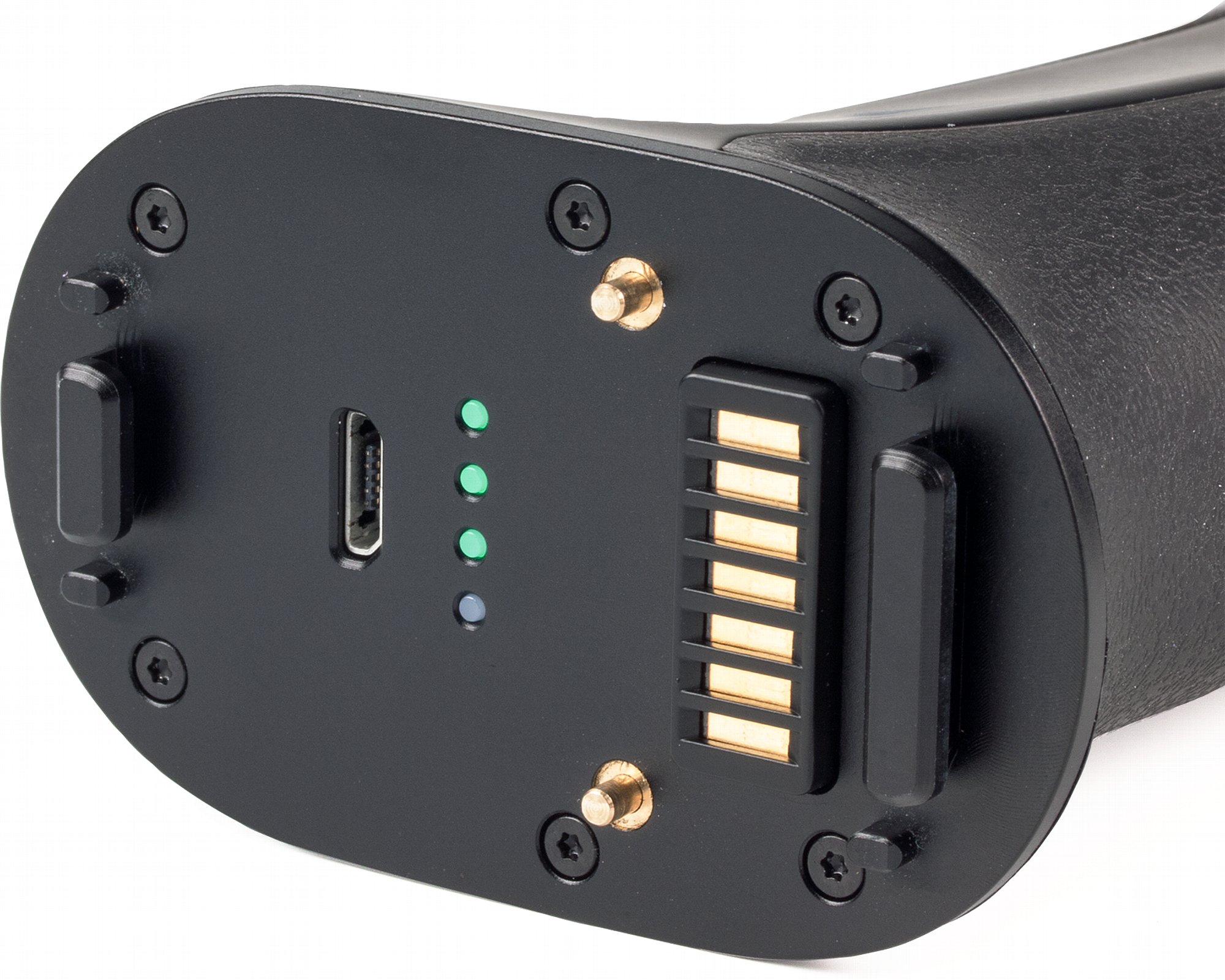 Sowohl die Basis als auch der Handgriff beinhalten jeweils einen Akku. Geladen werden beide über eine eigene MicroUSB-Buchse. Das heißt, es wird nichts "durchgeladen", sondern es müssen tatsächlich sowohl die Basis als auch der Handgriff separat aufgeladen werden; immerhin lädt der Handgriff-Akku im Betrieb den kleinen Akku im Kopf nach. Der Kopf alleine hält nicht besonders lange durch, der Akku hat auch nur 350 mAh. Zusammen mit dem 2000mAh-Akku im Handgriff hat der Gimbal dann natürlich eine deutlich längere Laufzeit. Acht bis neun Stunden gibt der Hersteller für beide Akkus zusammen an. Der kleine Akku in der Kopf-Basis alleine ist allerdings schon nach rund einer Stunde leer.