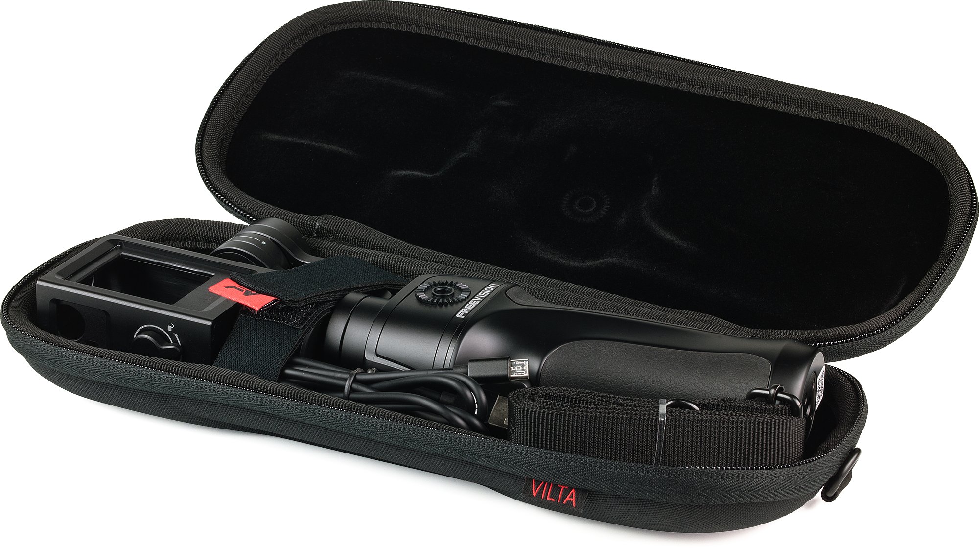 Der Freevision Vilta ist zweiteilig aufgebaut und kann deshalb universell auf zwei Arten eingesetzt werden. So wie er in der Schutztasche liegt, ist er ein handgeführtes 3-Achsen-Schwebestativ. Den Handgriff kannst du aber abnehmen. Dann hast du einen Gimbal, dessen Basis die Elektronik und wichtige Bedienelemente und Leuchtdioden beherbergt. Die Unterseite der Basis hat es im wahrsten Sinne des Wortes in sich. Dort befindet sich nämlich nicht nur ein 1/4-Zoll-Standard-Stativgewinde, sondern du kannst alternativ zwei stabile "Finger" für eine GoPro-kompatible Halterung ausklappen – eine super Idee! Alleerdings ist das Ausklappen der Befestigung etwas fummelig. Die Halterung macht einen super stabilen Eindruck und erspart es dir, mit irgendwelchen Adaptern zu arbeiten. Mit dieser Befestigungsmöglichkeit könntest du den Gimbal direkt auf einer Helmhalterung montieren oder an einem Brustgurt. Ob sowas Sinn bei dem von dir betriebenen Sport macht, musst du selbst entscheiden. Immerhin wiegen Gimbal (ohne Handgriff) und Kamera (GoPro Hero 5 Black) zusammen fast 390 Gramm. Aber diverse andere Halterungen machen natürlich definitiv Sinn, seien es z. B. eine Lenker-Halterung am Fahrrad oder eine Befestigung an Motorrädern oder auf Booten (aber Achtung: wasserfest ist der Freevision Vilta nicht).