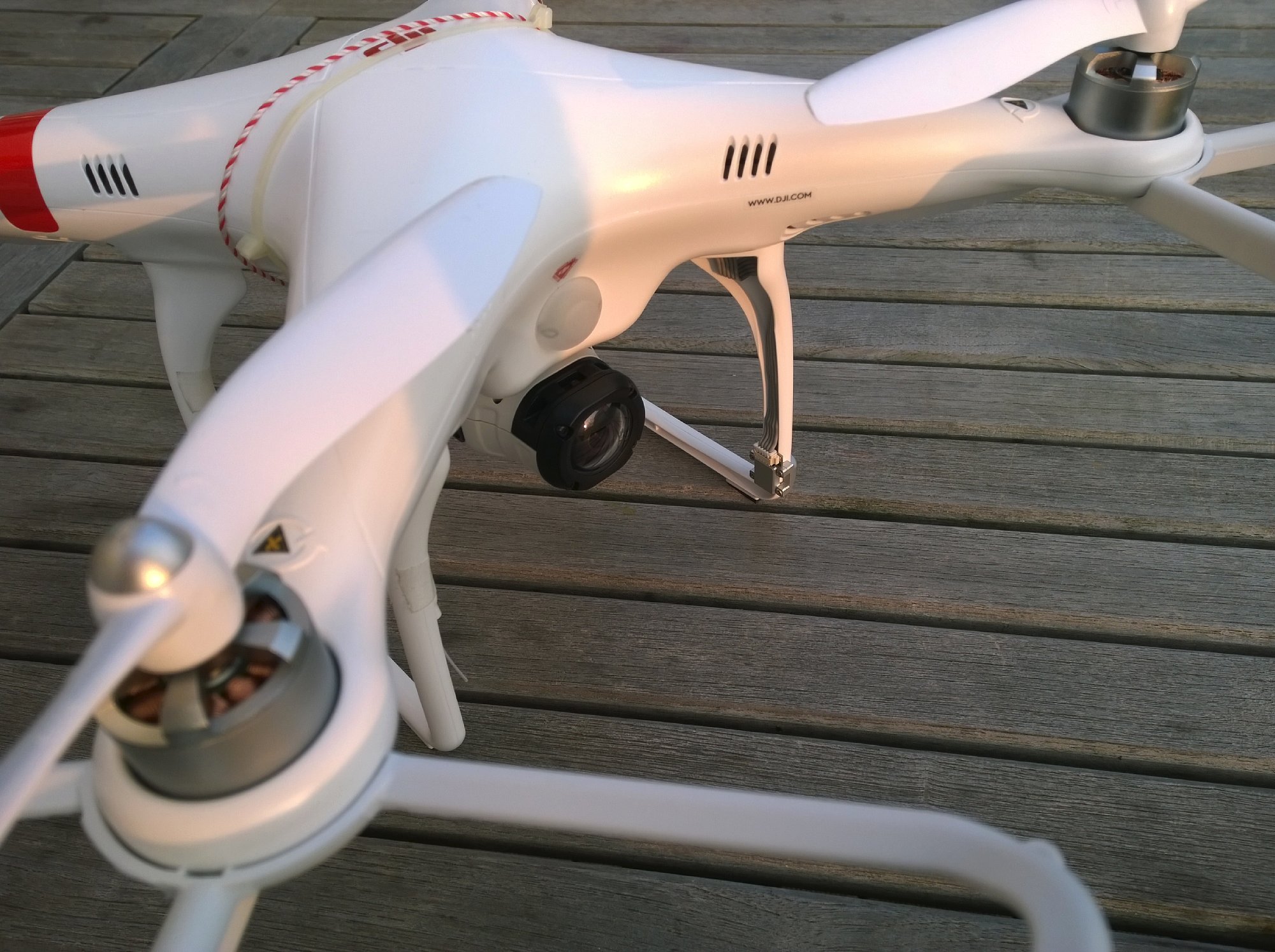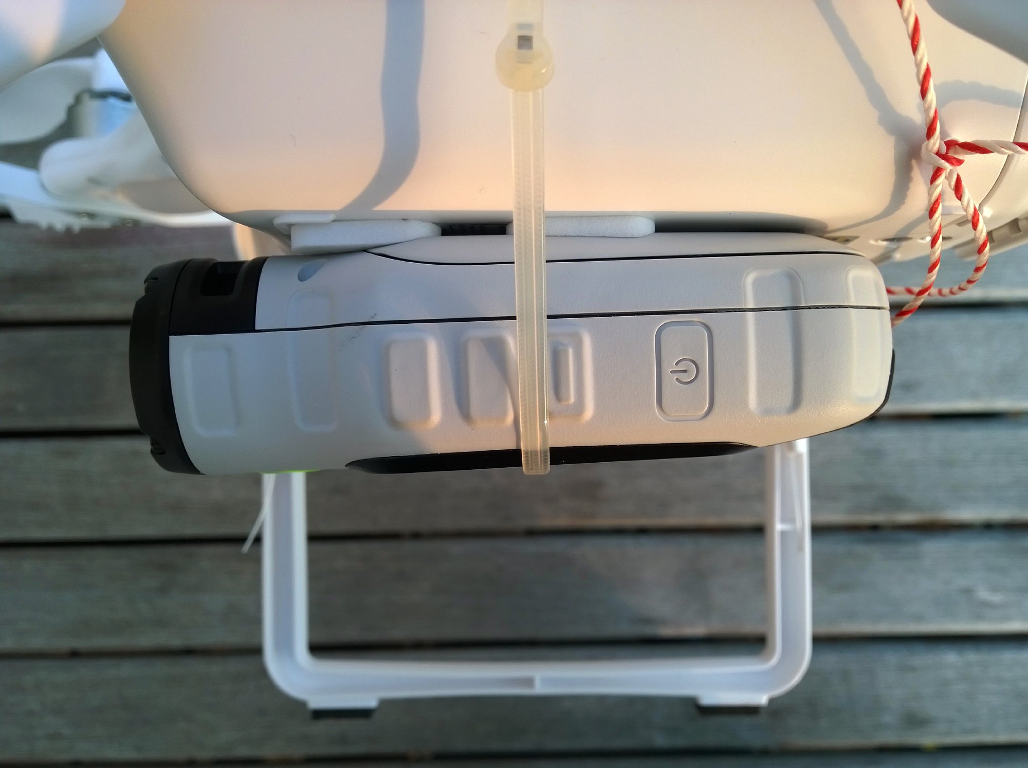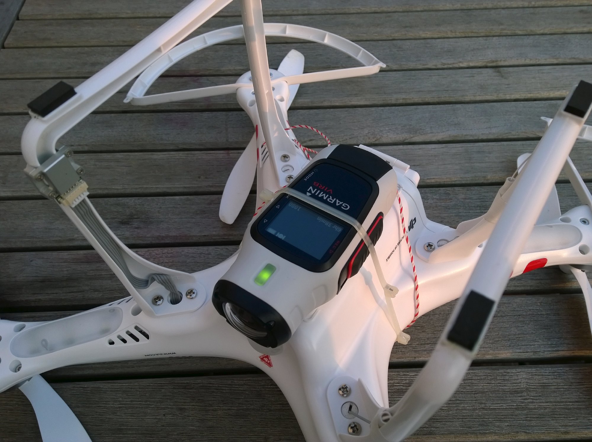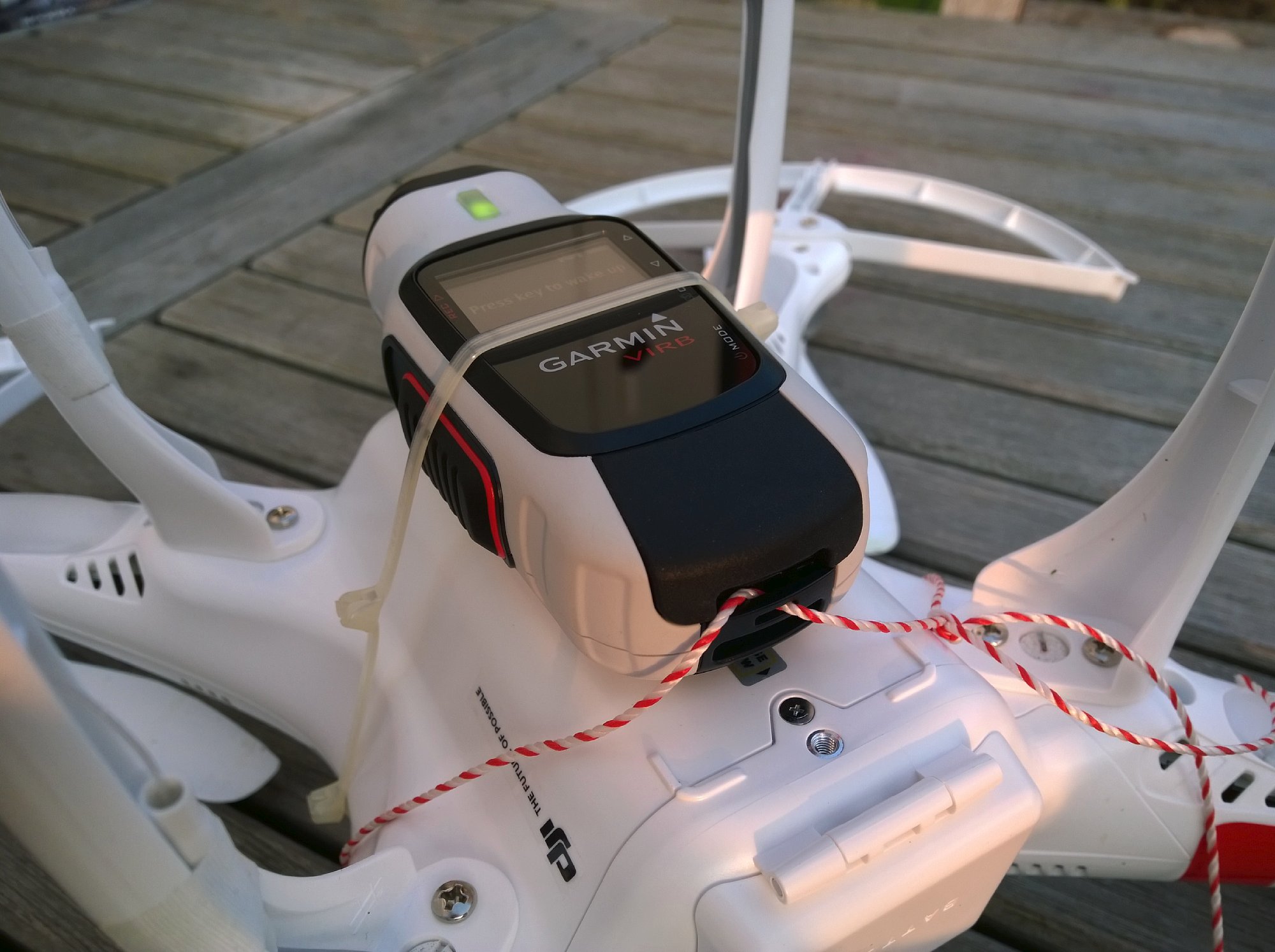 Bei Fotos werden übrigens sowohl die GPS-Position als auch die Höhe über Normal-Null in die Metadaten geschrieben. Darüber hinaus landen die kontinuierlich aufgezeichneten Daten in Form von FIT- (*.fit) und GPX-Dateien (*.gpx) in einem Garmin-Verzeichnis auf der Speicherkarte. Von dort aus können sie ins kostenlose Garmin-Videoschnittprogramm oder auch in andere Programme (z. B. Google Earth) importiert werden, um dort die zurückgelegte Strecke anzuzeigen. Mit der Möglichkeit Koordinaten und die Höhe aufzuzeichnen, ist die Garmin Virb Elite natürlich grundsätzlich auch interessant für Multikopter-Piloten. Unter beispielsweise einen DJI Phantom Quadrokopter muss man ja nicht zwangsläufig eine GoPro Hero hängen. Allerdings erweist sich für diesen Einsatzzweck das hohe Gewicht der Garmin Virb Elite als Nachteil. 180 Gramm bringt sie auf jeden Fall auf die Waage, selbst ohne Halterung und Befestigungsmaterial. Mit der serienmäßigen Halterung wären es noch weitere 75 Gramm. Damit ist man dann schon fast beim Gewicht einer GoPro Hero 3+ inklusive Gimbal-Head, was beides zusammen dann natürlich qualitativ in einer anderen Liga (mindestens was die Ruhe bei Videos angeht), aber auch in einer anderen Preisklasse spielt. Ich habe es trotzdem mal probiert und die Garmin Virb Elite, durch einige Schaumstoff-Puffer entkoppelt, mittels Kabelbindern unter einen DJI Phantom 1 Quadrokopter geschnallt (siehe Fotos). Dank Sicherungsöse an der Kamera konnte ich die Kamera noch zusätzlich sichern, einen Verlust brauchte ich trotz Bastellösung also nicht zu finden. Das Gesamtgewicht war dann trotz montierter Prob-Guards (optinaler Propellerschutz) kein Problem. 300 Gramm trägt der Phantom 1 problemlos (auch wenn der Hersteller nur 200 Gramm vorsieht) und hier war ich insgesamt nur bei 255 Gramm inklusive Kabelbinder. Im Einstellungs-Menü konnte ich die Kamera auf Über-Kopf-Montage umstellen und trotz Kabelbinder-Montage war die Kamera problemlos bedienbar. Die Bildergebnisse waren recht gut. Aus dieser Anwendung stammt aber meine Erkenntnis, das Drehbewegungen durch die Bildstabilisierung kaum ausgeglichen werden. Dafür bietet das "Ultra-Zoom"-Bildfeld dann einen natürlichen Bildwinkel und die Verzerrungen werden soweit ausgeglichen, dass sie nicht mehr stören. Im "Breit"-Bildfeld hingegen ist der Fischaugen-Effekt spektakulär und der Bildwinkel extrem groß, was gerade bei Luftaufnahmen spektakulär aussieht. Insgesamt für die Kopter-Anwendung also gar nicht schlecht geeignet, bis auf das leider sehr hohe Gewicht.
