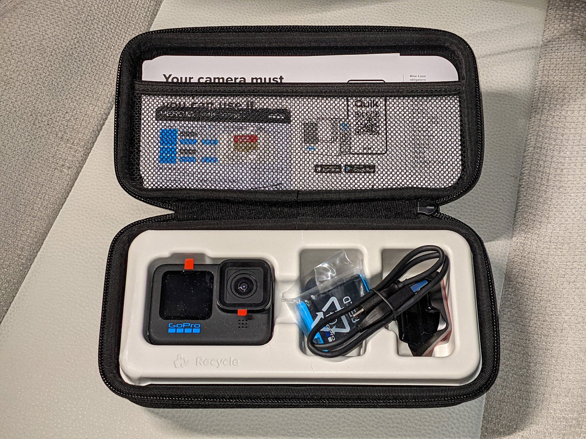 Ansonsten ist der Lieferumfang aufs Nötigste beschränkt. Nicht einmal eine Klebehalterung für plane Oberflächen wird mitgeliefert, sondern lediglich eine für gewölbte Oberflächen (Helme) inklusive der nötigen Klemme (die Haltearme sind seit der Hero8-Generation klappbar direkt am Gehäuse). Darüber hinaus sind ein USB-C-auf-USB-A-Kabel und natürlich der Akku mitgeliefert. Bei unserem Testgerät lag noch eine schnelle, 64 GByte große SanDisk-Micro-SD-Karte mit in der Tasche.