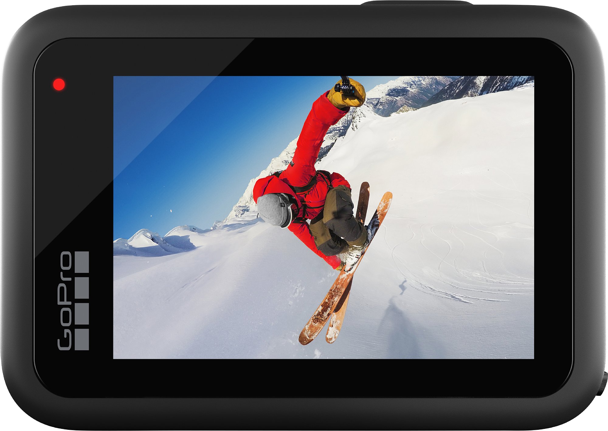 An physischen Tasten gibt es bei GoPro zwei, eine seitlich und eine oben, das hat auch schon Tradition. Seitlich wird die Kamera eingeschaltet und danach schaltet jeder Druck den Modus durch (Video, Foto, Zeitraffer). Länger drücken schickt die Kamera ins Standby. Die Taste auf der Oberseite ist für Aufnahme Start/Stopp bzw. der Auslöser für ein einzelnes Foto. Das Verhalten ist auf Wunsch so konfigurierbar, dass ein Druck auf den Auslöser die Kamera einschaltet und sofort die Aufnahme startet. Ein weiterer Tastendruck beendet dann die Aufzeichnung und schickt die Kamera wieder ins Standby. Kinderleicht also und zudem über die rot blinkenden LEDs gut rückgemeldet.