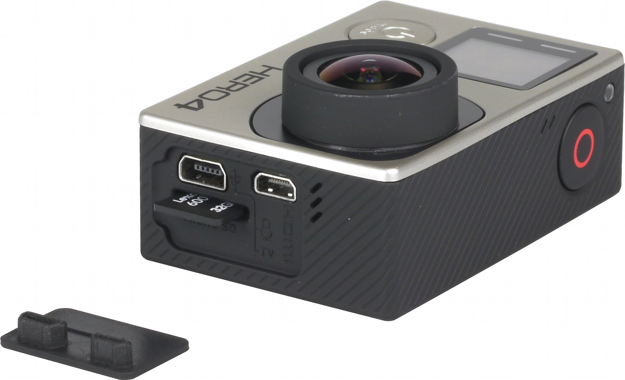 Die GoPro Hero4 Silver gibt es neben dem Standardpaket auch in einer Surf- bzw. Music-Ausführung mit jeweils dazugehörendem Zubehör. Mitgeliefert werden in der Standardversion ein USB-Kabel, zwei Klebehalterungen, ein wasserfestes Gehäuse mit alternativen Türen, ein paar GoPro-Verbindungsstücke sowie ein umfangreiches Handbuch. Das Unterwassergehäuse hält dem Druck in bis zu 40 m Tiefe stand und lässt die Bedienung über die mechanischen Tasten in vollem Umfang zu. Falls du unter Wasser den Touchscreen benutzen willst, gibt es dafür eine Klappe mit Folienfenster, die dann aber nur noch bis 3 Meter Tiefe geeignet ist. Eine ganz offene Rückwand wird ebenfalls mitgeliefert. Diese lässt den Ton ins Gehäuse durch und bietet freien Zugriff auf den Touchscreen, gleichzeitig aber weitgehend Schutz vor Stößen und sogar Spritzwasser (sofern es nicht gerade von hinten kommt). Mit den Abmessungen von 58 mm Breite, 40 mm Höhe und 28 mm Tiefe ist die Hero4 Silver genau so groß wie die Hero4 Black und die Hero3+ (ihr direktes Vorgängermodell) und ist dadurch mit dem Zubehör der vorhergehenden Generation (nahezu) uneingeschränkt kompatibel.