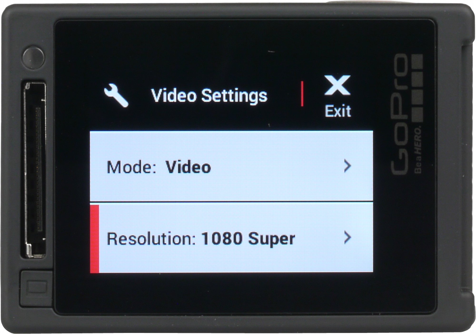 Um die Hero4 Silver in Betrieb zu nehmen, drückst kurz auf den Power-Knopf. Der integrierte Monitor zeigt dir daraufhin (ohne Zeitverzögerung) das Live-Sucherbild sowie die aktuellen Aufnahmeeinstellungen an. Wie oben erwähnt, ist die geringe Größe dabei wenig komfortabel für das Auge, wenn auch für die Bedienung nicht weiter problematisch. Wenn du nämlich mit dem Optionen-Button die Einstellungen öffnest, ist dort die Benutzeroberfläche so gestaltet, dass du dich mit Touchbedienung nicht verklicken kannst. Und wenn du die Kamera klassisch mit Mode- und Record-Taste steuerst, wirst du ohnehin keine Probleme haben.