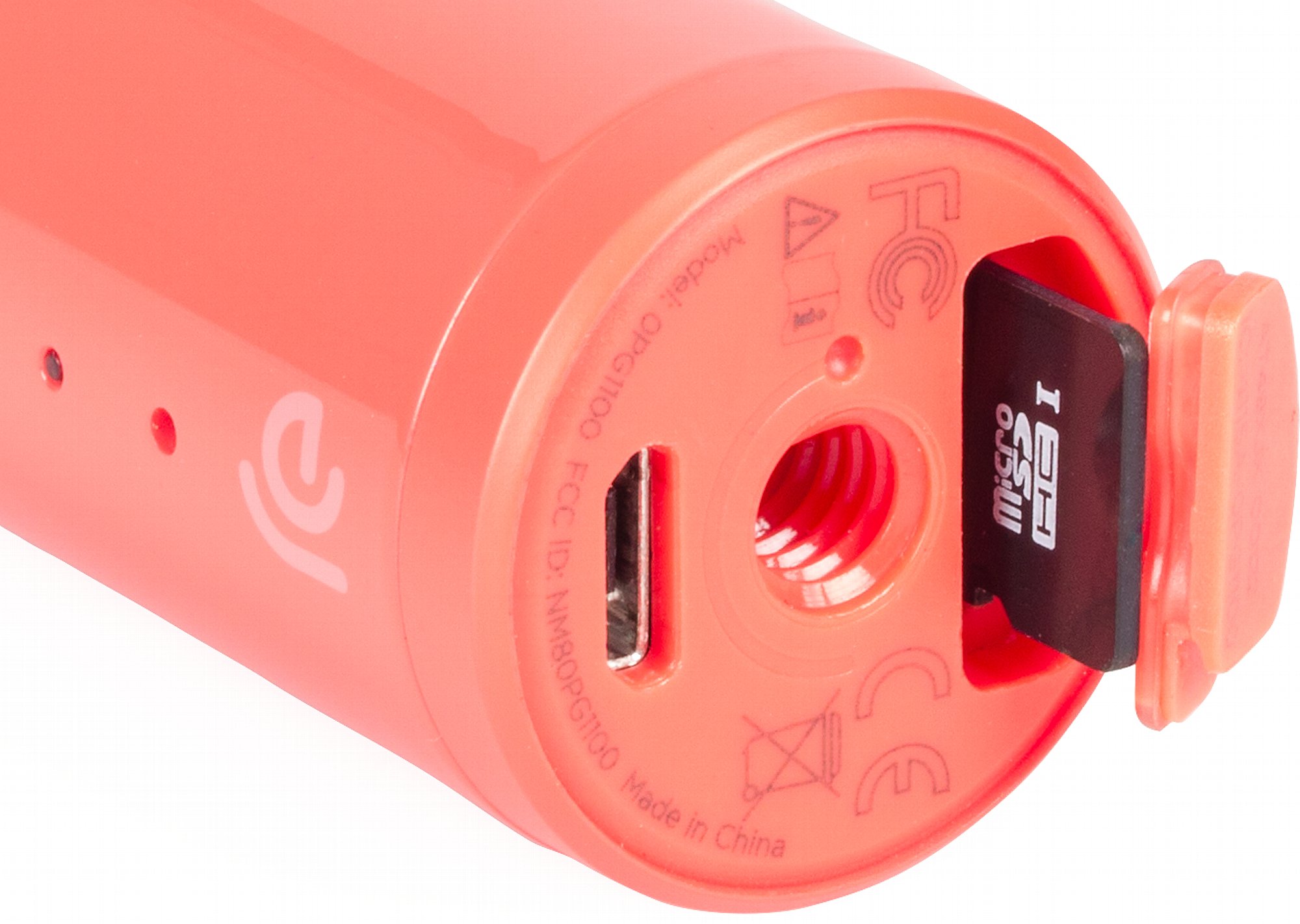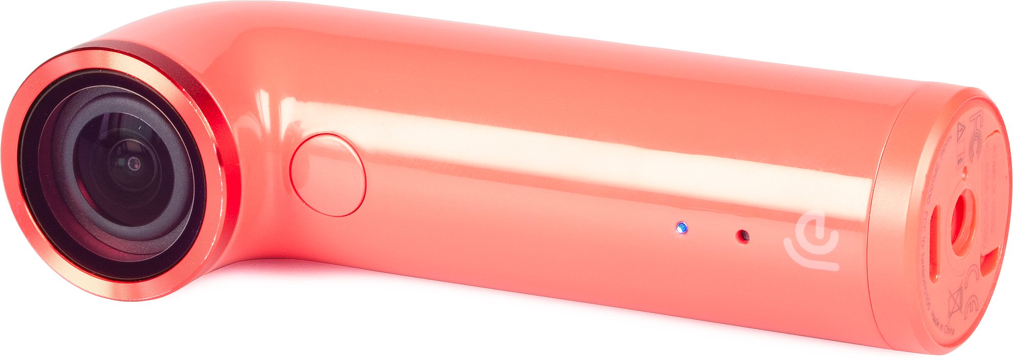 Die Kamera selbst ist 98 mm hoch und am Kopfende 35 mm breit. „Breit“ ist hierbei relativ zu betrachten, da die HTC RE in der Grundform ein gebogenes Rohr mit festem Durchmesser darstellt. Das Konzept wird zwar allgemein milde belächelt, ist im Grunde aber sogar recht clever: Die Kamera liegt (auch durch das angemessene Gewicht von 66,5 Gramm) angenehm in der Hand, die Kante unter der Linse thront auf dem Zeigefinger (da befindet sich auch der unauffällige Modus-Knopf) und exakt dort, wo du mit deinem Daumen gegenhältst, sitzt die große Auslösetaste, die einen ordentlichen Widerstand hat, sodass du sie nicht unabsichtlich betätigen kannst. Unten befinden sich eine zusätzliche Status-LED und ein Lautsprecher (offenbar nur für die nervenden Signal-Pieper). Auf der flachen Unterseite sitzen dann der MicroUSB-Port, eine fingernagel-ausreißende Abdeckung für die MicroSD-Karte und ein 1/4-Zoll-Gewinde zur Stativmontage oder für die Handschlaufe mit Deckklappe.