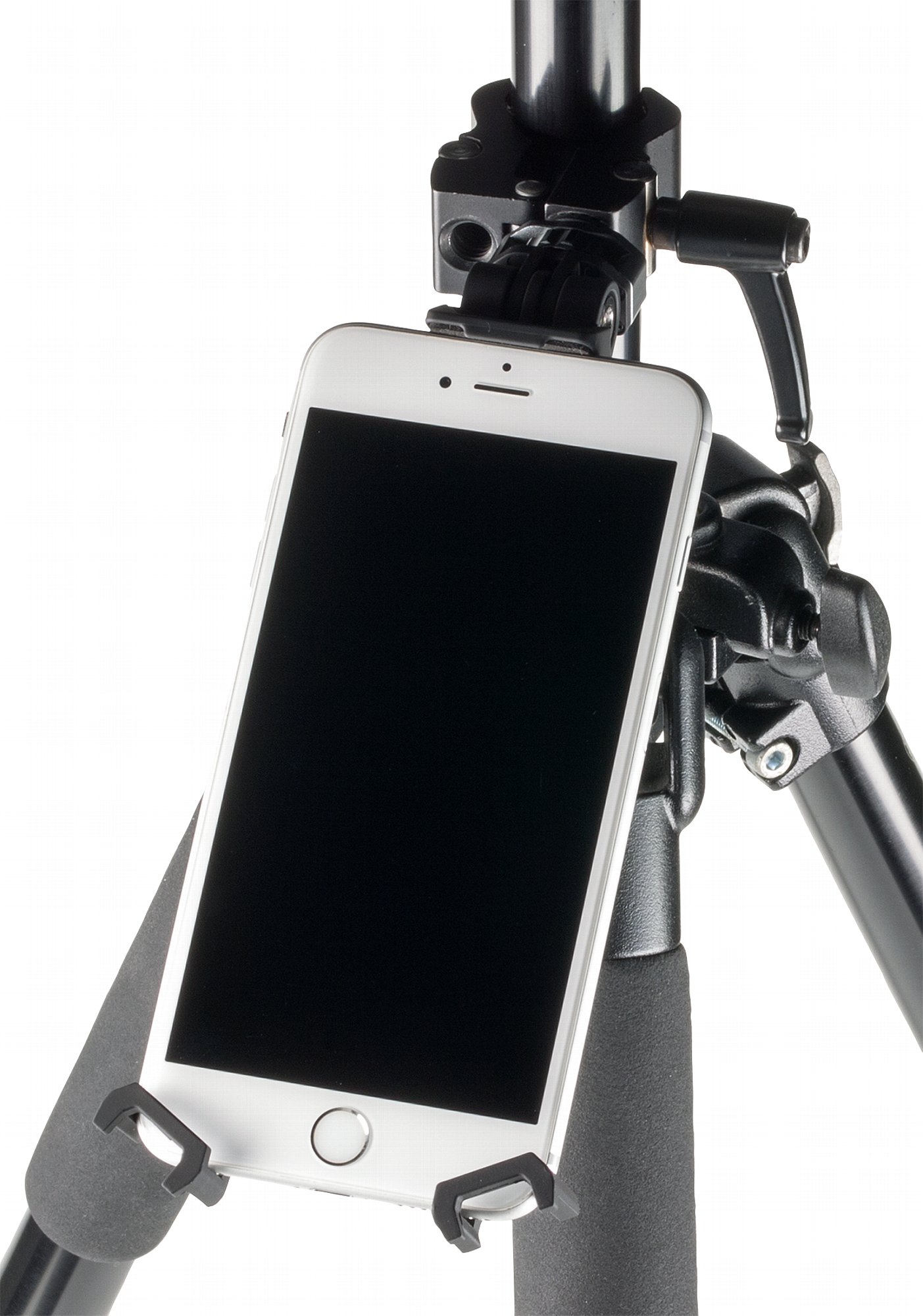 Die Smartphone-Halterung selbst ist übrigens recht leicht (74 Gramm) und so pfiffig konstruiert, dass sich Smartphones unterschiedlicher Größen dort einspannen lassen. Zwei beim Transport platzsparend eingeklappten Arme werden ausgeklappt und dort die beiden Ecken einer schmalen Seite des Smartphones eingesetzt. Dann zieht man das Ganze so weit heraus, bis die andere schmale Seite des Smartphones in der anderen Seite der Halterung einrastet. Eine recht starke Federspannung hält das alles dann sicher in Position. Das ist jetzt vielleicht nicht die Lösung, die man an den Fahrradlenker schraubt und damit Downhill den Berg runterdonnert. Aber für den normalen "gedämpften" Betrieb in der Hand ist die Halterung mehr als ausreichend – und zudem wirklich komfortabel zu bedienen (was man von anderen Halterungen nicht immer sagen kann).