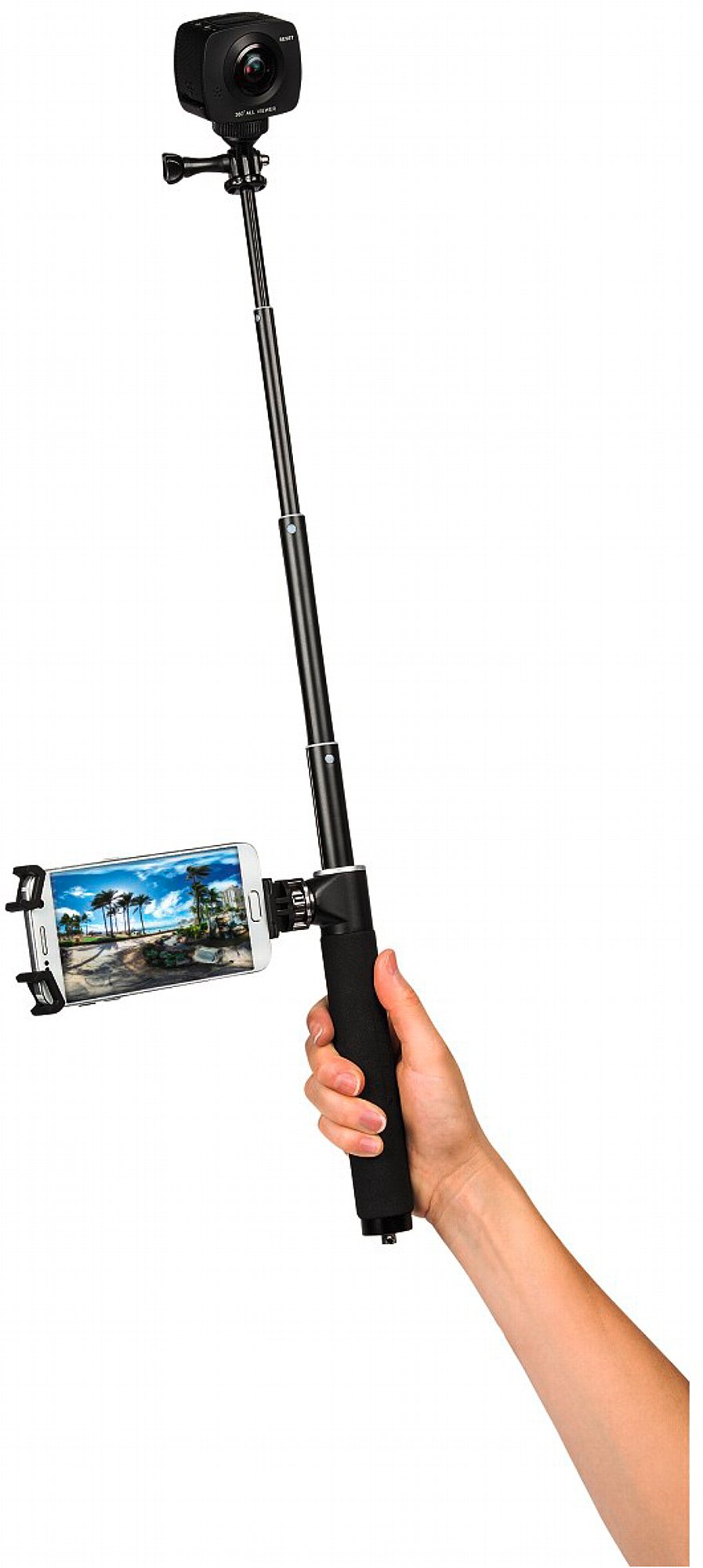 In der Summe der Eigenschaften ist der Hama Selfie 100 Panorama eigentlich weniger ein spezieller Panoramakamera-Selfie-Stick, als vielmehr ein guter Selfie-Stick mit Smartphone-Halterung für Actioncams, die ja auch oft per Smartphone-App fernbedient werden. Die abnehmbare Smartphone-Halterung kann vielseitig positioniert werden. Der große Griffdurchmesser sorgt für sichere Handhabung auch etwas schwererer Kameras und die große, plane Bodenplatte mit 1/4-Zoll-Stativgewinde macht ihn zu einer idealen Stativ-Verlängerung.