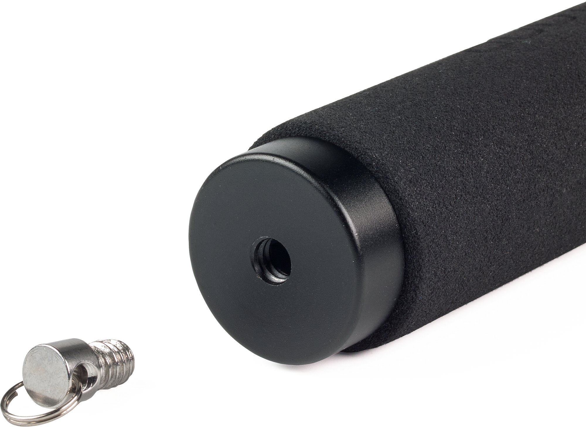 Der große Durchmesser des Griffs ist nicht nur vorteilhaft für eine gute Handlage, sondern hat noch einen zweiten, riesengroßen Vorteil. Der Hama-Stick hat, wie viele andere (aber nicht alle) Selfie-Sticks an der Unterseite des Griffs eine Öse für eine Handschlaufe. Diese kannst du herausdrehen und dann kommt erfreulicherweise nicht irgendein metrisches Gewinde zum Vorschein, sondern sinnvollerweise ein 1/4-Zoll Fotogewinde. Damit kannst du den Selfie Stick wunderbar als Stativverlängerung auf einem normalen Stativ verwenden. Dies geht wiederum mit dem Hama-Stick weitaus besser als mit anderen, dünneren Selfie-Sticks, weil die große Auflagefläche (27 mm Durchmesser) im Grunde überhaupt erst die Voraussetzung schafft, dass der Selfie Stick sicher und stabil auf dem Stativ sitzt. Feine Sache.