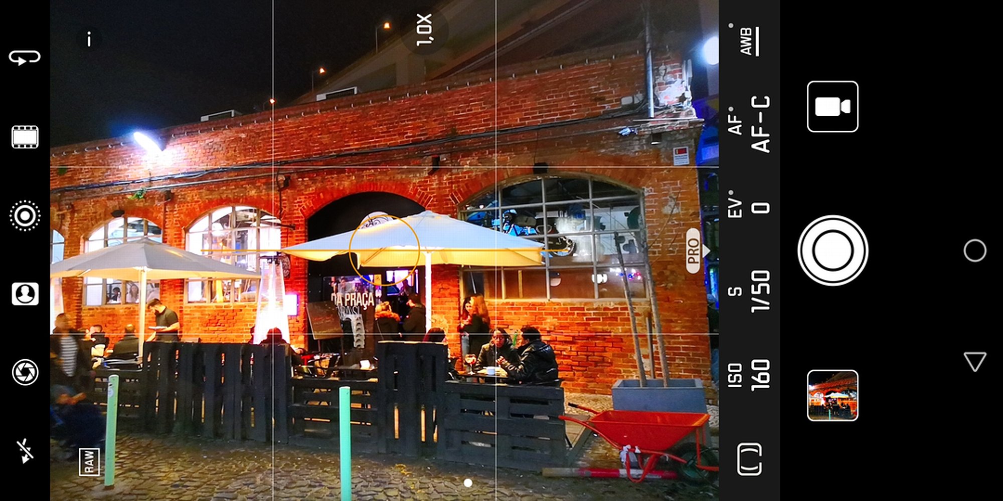 Nun zum für uns Wichtigsten, der Kamera. F1,6 Lichtstärke, das ist mal eine Ansage. Die bisher lichtstärksten Smartphone-Kameras hatten F1,7. Das ist kein so großer Unterschied. Aber bei den technisch hochinteressanten Doppelkameras mit Leica-Schriftzug, die Huawei verbaut, hatten wir bislang nur F2,2. Auch wenn diese Zahlen mit ihren Nachkommastellen so wirken, als sei das kein so großer Unterschied: Die Blendenzahl ist ein logarithmischer Wert. Beginnend bei 1 (= 100 % Lichtdurchlässigkeit) bedeutet jeder nächste volle Blendenwert der sogenannten Blendenreihe (1,4, dann 2, gefolgt von 2,8) jeweils 50 Prozent Lichtverlust. Eine Verbesserung der Lichtstärke von F2,2 auf F1,6 entspricht also fast einer Verdoppelung der auf den Sensor fallenden Lichtmenge! In der Praxis heißt das, dass ISO-Werde niedriger und Belichtungszeiten kürzer ausfallen können. Als Rechenbeispiel kann eine Nachtaufnahme dienen, die ich mit dem Huawei Mate 10 Pro gemacht habe. Die Situation hatte wirklich sehr wenig Licht, ausschließlich von Straßenlaternen. Eine Probeaufnahme mit automatischer Belichtung fiel erwartungsgemäß viel zu hell aus und gab die Szene nicht naturgetreu wieder. Deshalb habe eine volle Blende minus-korrigiert (Belichtungskorrektur auf -1). Die Automatik des Mate 10 Pro hat sich dann für eine Belichtungszeit von 1/17 Sekunde entschieden, die ich dank optischen Bildstabilisators gerade noch aus der Hand halten konnte. Die Automatik hat die ISO-Zahl dabei auf moderate ISO 640 eingestellt. Das ist tatsächlich die ideale Kombination für diese Situation. So wenig ISO wie möglich und eine Belichtungszeit, die dank Stabi gerade noch aus der Hand zu fotografieren ist. Aufnahme geglückt!