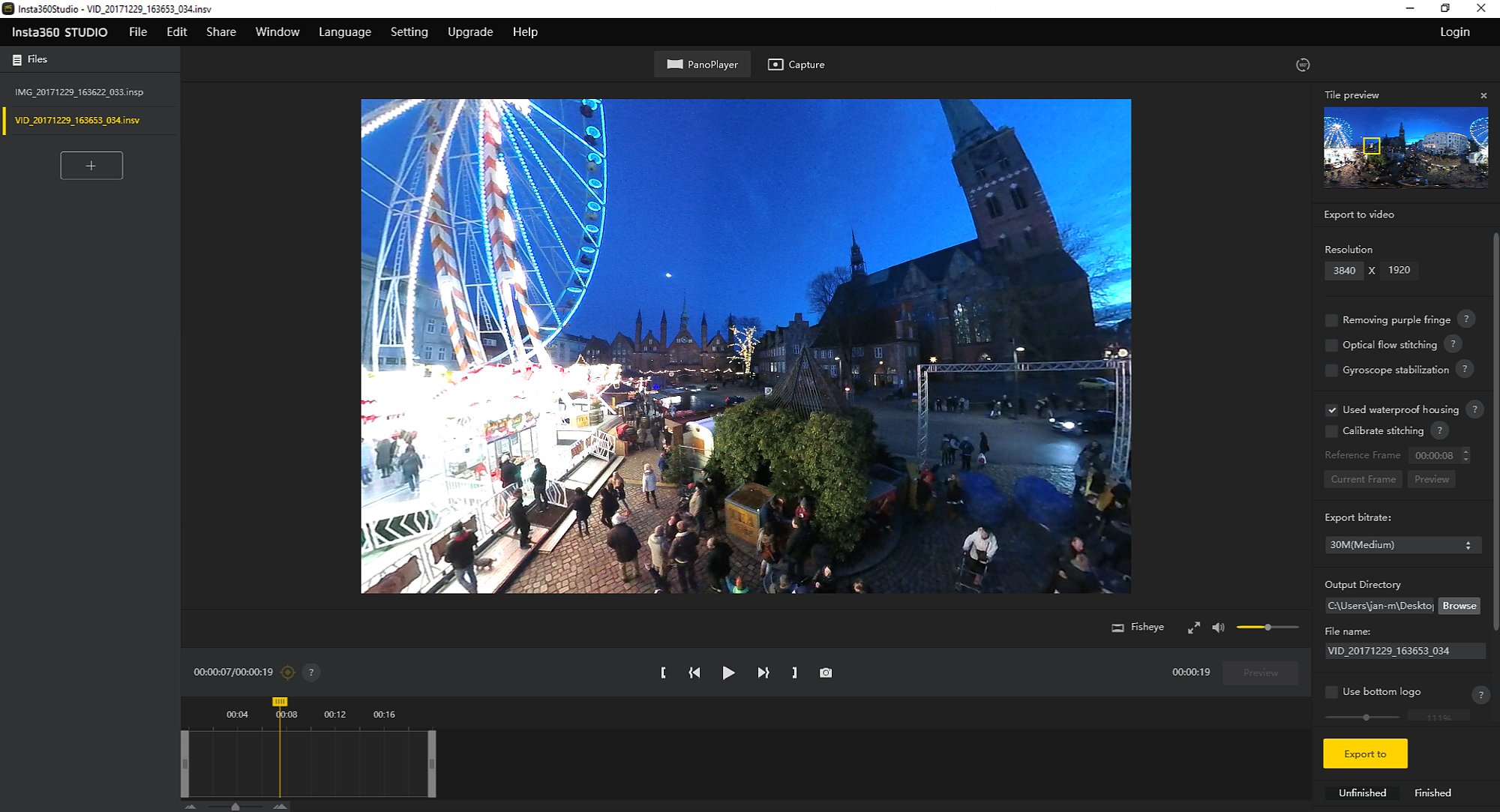 Aber die Arbeit damit ist trotzdem etwas umständlich. Das liegt vor allem daran, dass die Kamera auf der Speicherkarte scheinbar gar keine normalen Fotos und Videos ablegt, sondern Dateien mit den Endungen INSP (offenbar für INSta360 Picture) und INSV (offenbar für INSta360 Video). Das ist wirklich sehr lästig, denn das führt dazu, dass du mit einem normalen Windows Explorer erstmal überhaupt nicht siehst, was das jeweils ist (daneben liegen dann ggf. noch die DNG-Dateien mit den Rohdaten-Fotos, aber die kannst du ja auch nicht einfach anzeigen). Nun würde man ja meinen, wenn man die Insta360Studio-Software installiert, wird alles gut; die Software schlägt auch beim Installieren vor, die Dateiendungen INSP und INSV mit dem Programm zu verknüpfen. Das bringt nur leider auch nichts, weil die Software keinerlei Browser hat! Du siehst also niemals eine Vorschau oder eine Miniatur, weder in der Windows-Umgebung noch in der Insta360Studio und musst also nach dem Trial-and-Error-Prinzip mal diese, mal jene Datei ins Programmfenster ziehen, auf dass vielleicht mal die dabei ist, die du suchst. Konsequenter ist es da einfach einen Batch-Konvertier-Prozess mit allen Dateien anzustoßen, aber solche Vorgänge dauern dann bei Videos sehr, sehr lange.