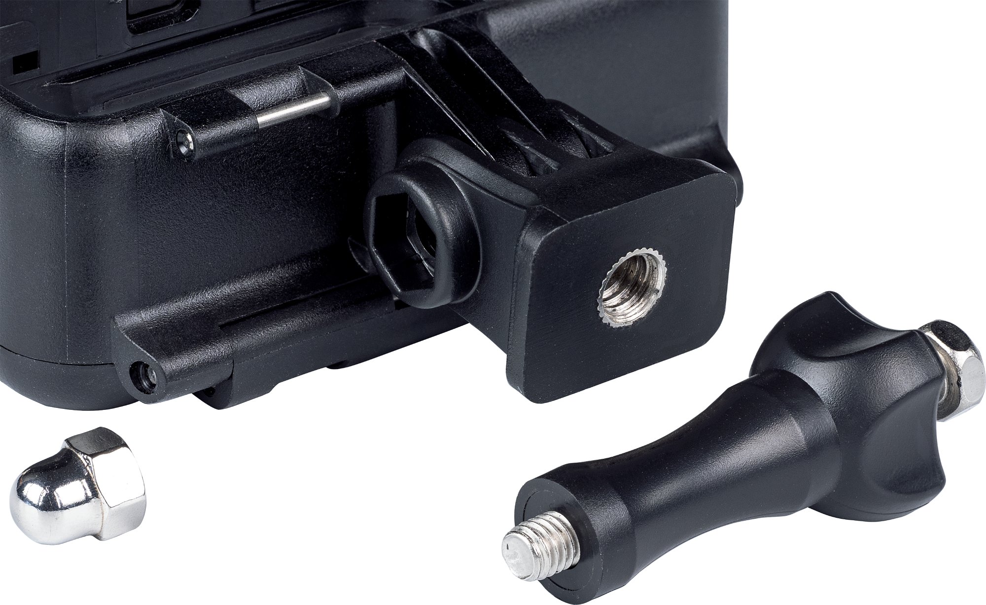 Tatsächlich stammt das Modell, das wir zum Test bekommen haben, noch aus der Vorserie. Bei den finalen Geräten, die jetzt an die Käufer ausgeliefert werden, soll der Abstand zwischen Kamera- und Aufzeichnungs-Modul und dem Akku-Pack geschlossen sein. Dies ist eine rein kosmetische Maßnahme. Die Abdichtung zwischen allen Komponenten erfolgt über Gummidichtungen um die Steckkontakte herum. Von denen gibt es insgesamt drei. Einen zwischen Akku- und Aufzeichnungs-Einheit und zwei recht breite, vielpolige Kontakte zwischen Kameramodul und Aufzeichnungseinheit. Von den symmetrisch angeordneten Steckkontakten nutzt das Weitwinkel-Actioncam-Modul nur eine Steckerleiste zur Zeit, je nachdem in welche Richtung die Kamera schaut. Auf diese Weise kann man das 4K-Weitwinkel-Modul statt mit der Blickrichtung nach vorne auch mit Blickrichtung nach hinten montieren, also im Selfie-Modus, in dem man sich selbst im auf dem Monitor sieht.