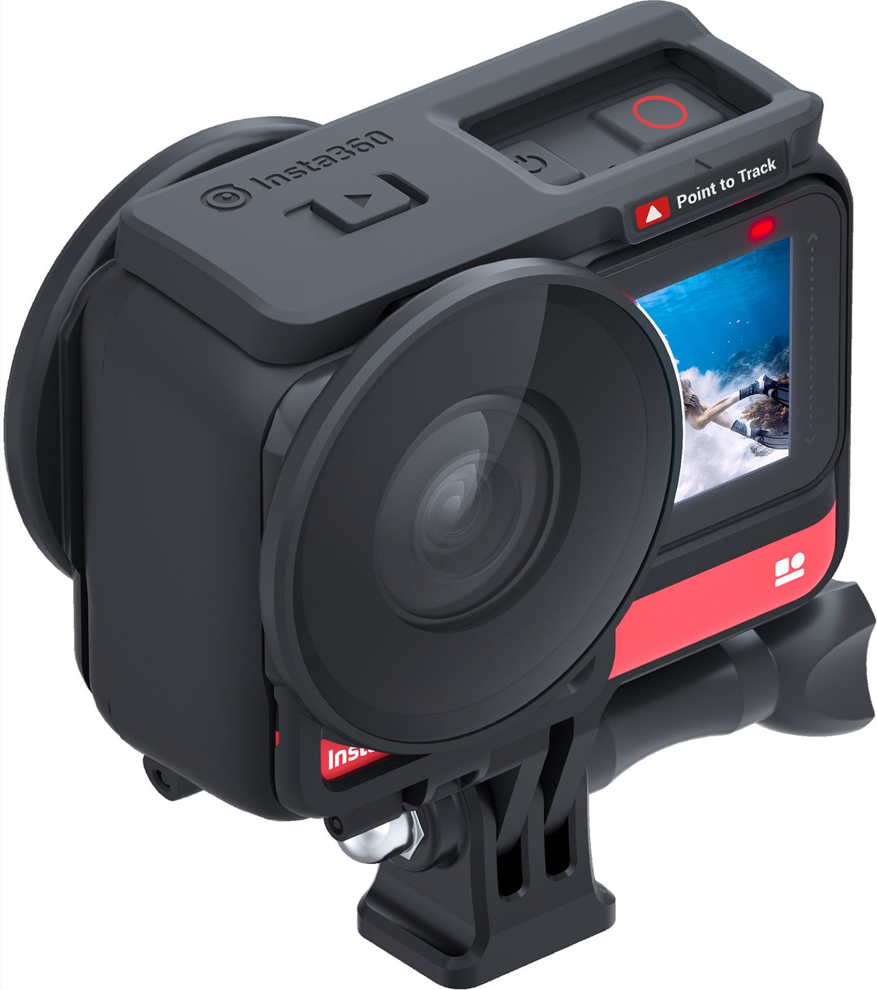 So montiert bleiben die beiden Tasten – Ein-/Aus und der Auslöser – auf der Oberseite der Basiseinheit durch eine Aussparung im Rahmen zugänglich, wenn auch die Bedienung der dann tief versenkten Tasten recht fummelig ist. Gut zugänglich bleibt der Touch-Screen. Dies gilt jedenfalls, solange man nicht die optionalen Objektiv-Schutzgläser ("Lens Guards") für das 360-Grad-Modul am Halterrahmen befestigt. Damit sind dann zwar die vorstehenden 360-Grad-Objektive gut geschützt, aber der Touchscreen ist nur noch teilweise sicht- und bedienbar.
