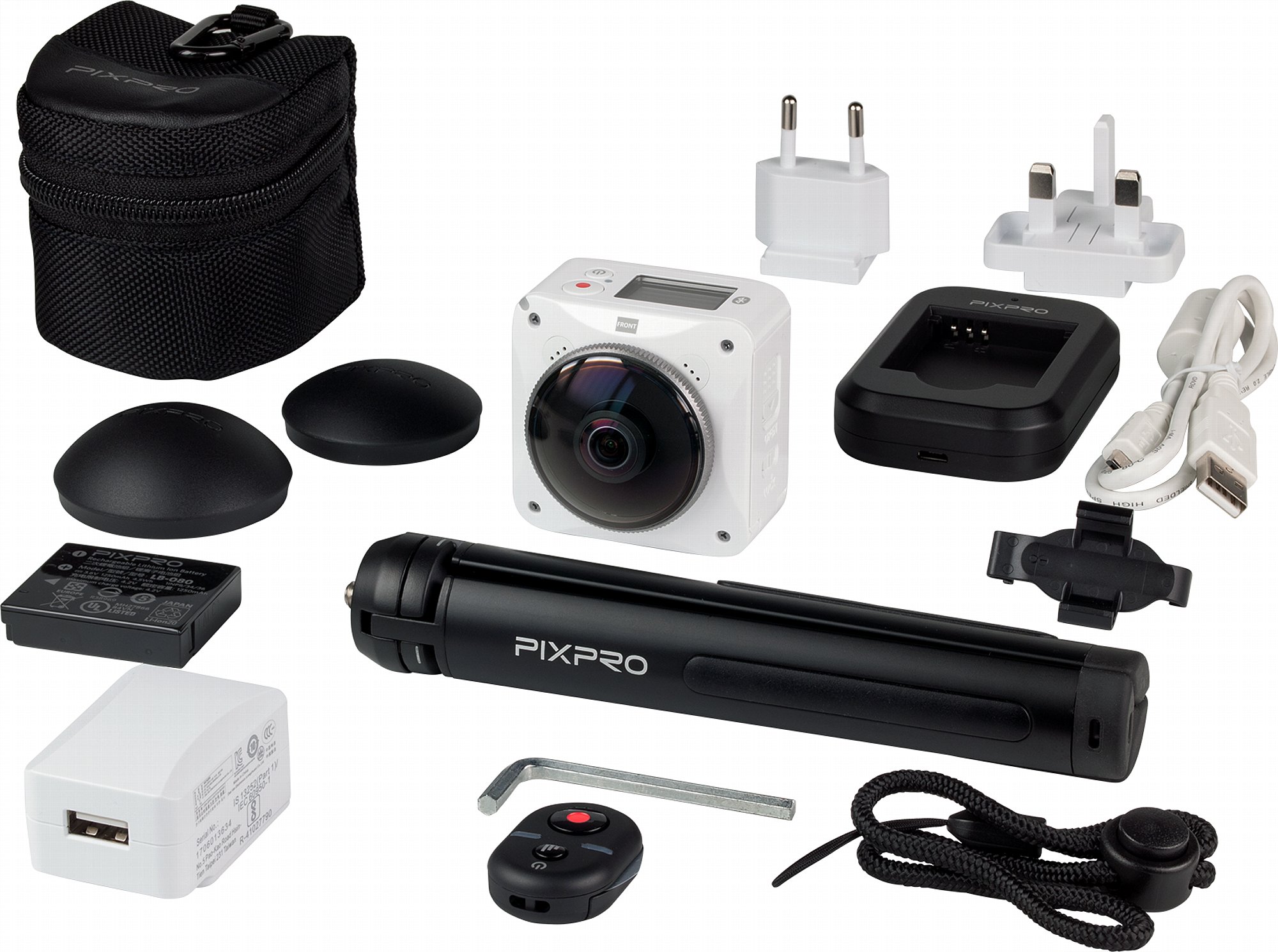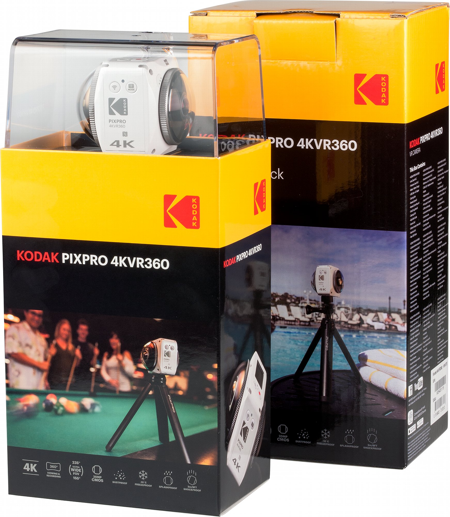 Die Kodak Pixpro 4KVR360 erreicht uns in doppelter Verpackung. Um die Actioncam-übliche Schneewittchensarg-Verpackung herum ist noch ein weiterer geschlossener Karton, der unser Set als Standard-Set ausweist. Dennoch ist es üppig ausgestattet mit Netzgerät mit diversen internationalen Steckern, USB-Kabel und externer Ladeschale. Dabei kann der natürlich ebenfalls mitgelieferte Akku durchaus auch innerhalb der Kamera geladen werden und an jedem handelsüblichen USB-Ladegerät. Ein Mini-Stativ ist dabei, das zusammengeklappt auch als kurzer Selfie-Stick verwendet werden kann. Daran geklippt werden kann die mitgelieferte einfache Bluetooth-Fernbedienung (nur mit Ein/Aus-Schalter und Auslöser). Zwei Linsenschutzabdeckungen sind bereits montiert, weiterer Ersatz ist aber nicht dabei (bei den einäugigen Kodak Pixpro Panoramakameras sind hingegen praktischerweise immer auch gleich Ersatzabdeckungen dabei). Zum Schutz der Abdeckungen bzw. Objektive gibt es jeweils eine Gummikappe und auch eine Weichtasche ist sinnvollerweise gleich mit dabei.
