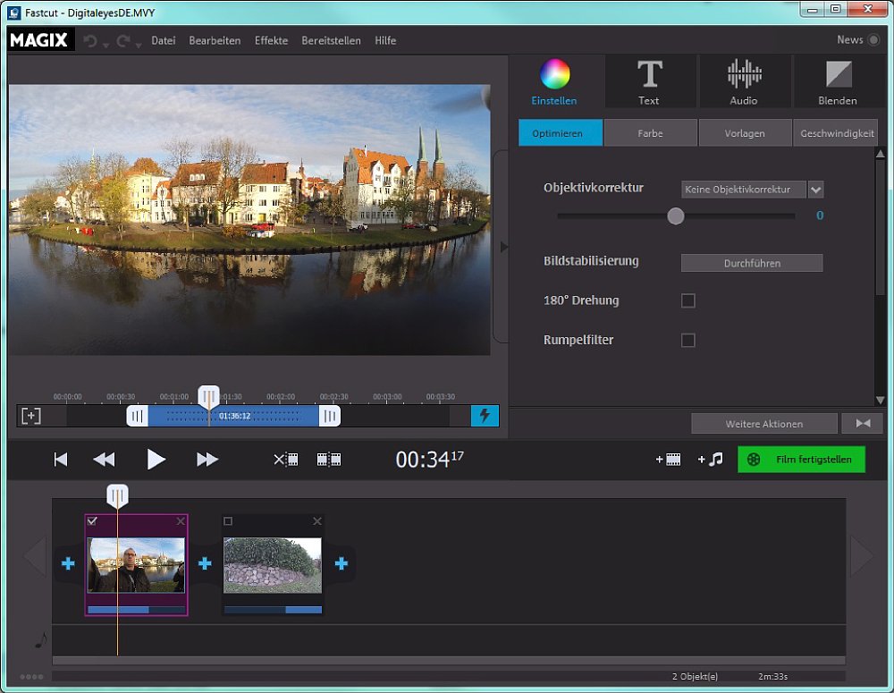 Die Videoobjekt-Einstellungen im rechts oben befindlichen Fenster umfassen alle gängigen Funktionen (Farbkorrektur, Zeitlupe und Filmlooks). Interessanter sind die Korrekturen speziell für Actioncams. Hier findest du eine manuelle Fisheye-Entzerrung, eine 180-Grad-Bilddrehung, sowie Bildstabilisierung und einen sogenannten „Rumpelfilter“. Für die Bildstabilisierung wählst du einen oder mehrere „Videobausteine“ (so sehen die Objekte am ehesten aus) an und klickst auf „durchführen“. Es öffnet sich kein Dialog, das Programm beginnt einfach zu rechnen – dies sogar verhältnismäßig flink: ein dreiminütiges Video ist innerhalb von knapp fünf Minuten bearbeitet. Ungefähr ein Sechstel des Bildes geht dabei zwecks Korrekturen verloren. Das Resultat ist überraschend wenig zufriedenstellend: kleine Erschütterungen kann der Stabilisator noch ausgleichen, wenn die Aufnahme jedoch wirklich kräftig wackelt, tut sie das auch nach der Bearbeitung noch (das kann ProDrenalin, zuletzt getestet, besser) und hochfrequentiertem Zittern von Quadrocoptern kommt Fastcut auch nicht bei. Wenn du hier nun den zuvor erwähnten Rumpelfilter dazuschaltest, bleibt der Horizont einigermaßen gerade, das Bild dreht sich also nicht mehr zu sehr nach links und rechts. Diese Funktion wird aber auch nicht so konsequent umgesetzt, dass das Ergebnis wirklich überzeugen könnte. Wie auch bei Bildstabilisator bleiben stets Ruckler zurück.