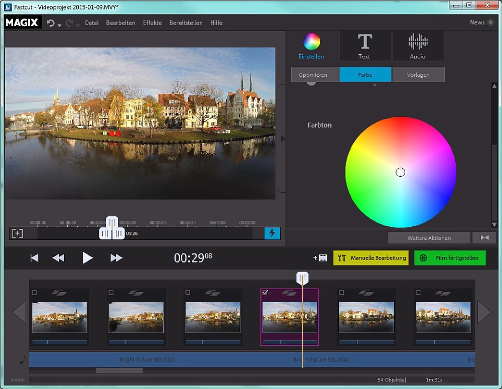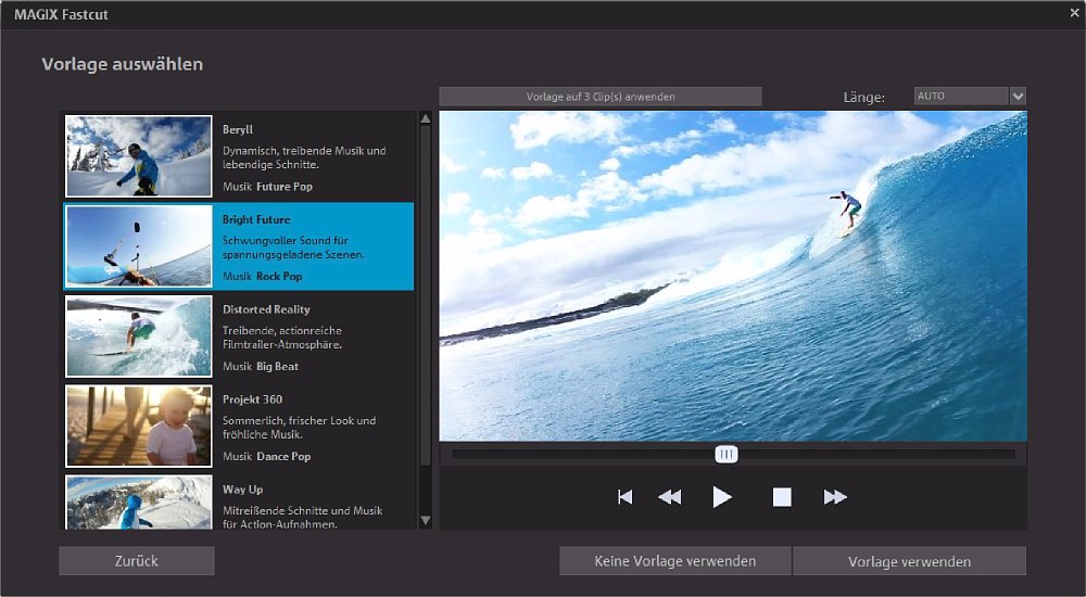 Hältst du dich hingegen an den Importdialog, kannst du im nächsten Schritt eine Filmvorlage inklusive Musik für dein Projekt wählen. Diese Vorlagen sind mit eher abstrakten Begriffen wie „Beryll“, „Bright Future“ oder „Distorted Reality“ betitelt, verfügen allerdings dafür über kurze, aussagekräftige Beschreibungen (auf Deutsch) sowie Beispielvideos zur Demonstration. Diese beinhalten tolles Material und die Musik erweckt tatsächlich Lust, jedes einzelne Preset mit eigenen Clips auszuprobieren (ganz ohne Vorlage kannst du natürlich auch arbeiten). Klickst du auf „Vorlage anwenden“, rechnet Fastcut (beim ersten Mal) eine längere Weile und im Hintergrund bauen sich Videoobjekte mit einer Tonspur auf. Der Dialog bleibt unterdessen geöffnet und bietet dir die Möglichkeit, gegebenenfalls auf eine andere Vorlage umzuschwenken.