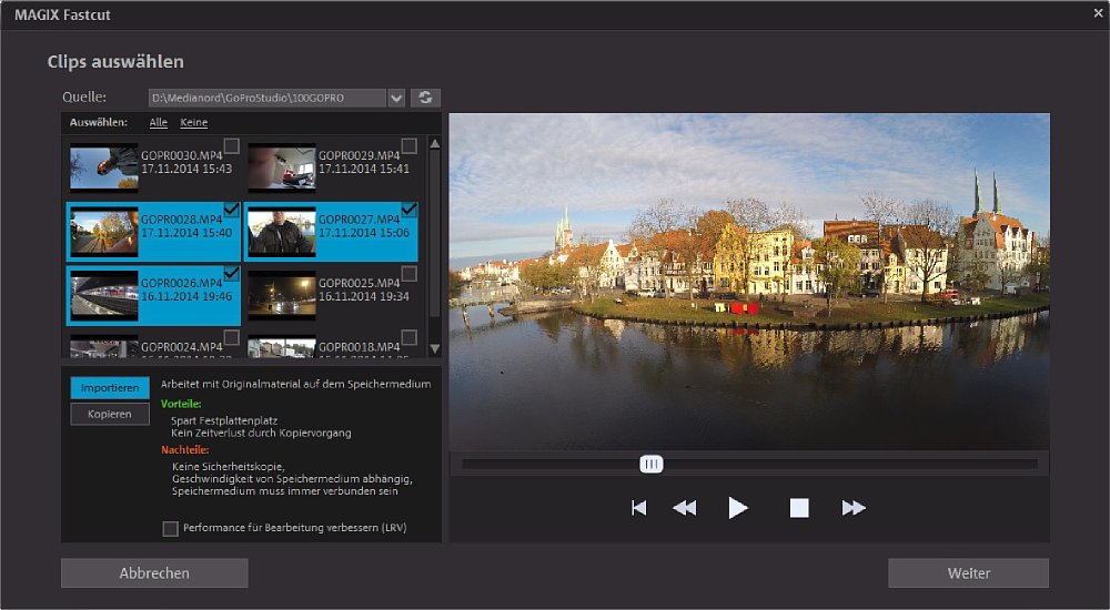 Beim Starten empfängt dich eine schöne, übersichtliche Oberfläche, vor die sich sogleich ein klassischer Eröffnungsdialog schiebt. „Neues Videoprojekt erstellen“, „Projekt laden“ und „Einführungsvideo“ sind die drei selbsterklärenden Antworten auf „Was möchten Sie tun?“. Klickst du auf „Neues Videoprojekt erstellen“, schlägt dir Fastcut zum Import von Dateien direkt externe Speichermedien vor. Nützlich, wenn du die Clips direkt von der Speicherkarte nehmen möchtest, ohne sie zunächst auf die Festplatte kopieren zu müssen. Das Programm kann die Dateien dann auch direkt importieren oder vorher auf die interne Festplatte kopieren. Dabei leistet Magix sogar Hilfestellung und legt dir schriftlich Vor- und Nachteile beider Verfahren vor. Das Programm merkt sich anschließend für das nächste Mal zwar, welche Option ("Importieren" bzw. "Kopieren) du gewählt hast, vergisst aber, welches Verzeichnis du als Ablage fürs Kopieren bestimmt hattest, was nicht zu Ende gedacht ist. Die Materialwahl selber ist auch suboptimal, denn du kannst immer nur aus einem einzigen Verzeichnis Clips beziehen, was unpraktisch ist, wenn dein Material auf mehrere Ordner verstreut ist. Alternativ kannst du übrigens den Dialog auch abbrechen und die Videos per Drag-And-Drop direkt in die Zeitleiste einfügen.