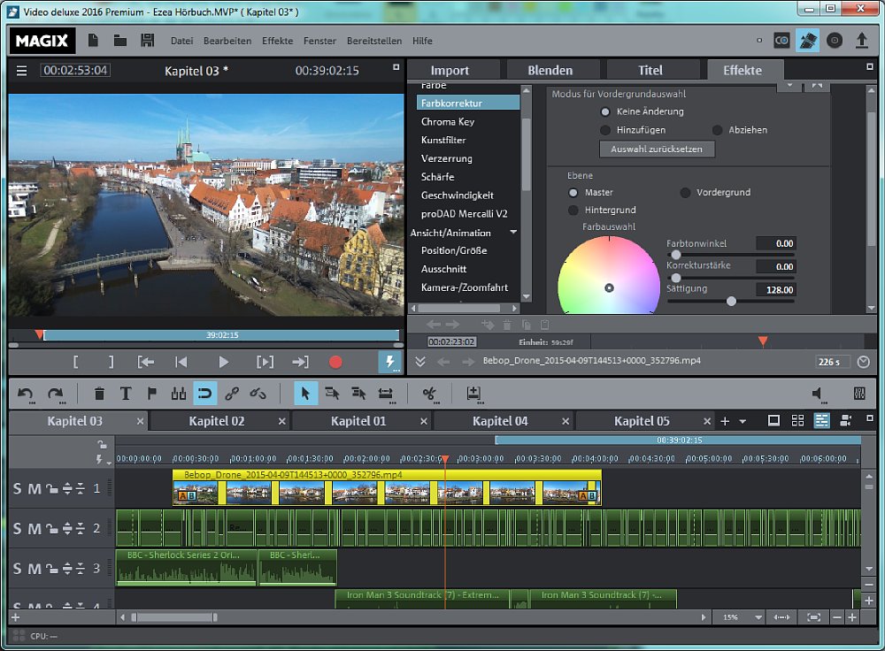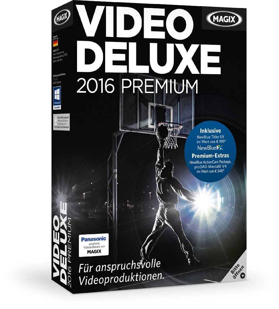 Die Unterschiede der Fassungen im Kurzüberblick: Die Standard-Variante (knapp 50 Euro UVP) bietet 32 Bearbeitungsspuren, 4K- und (neu) H.265-Unterstützung, Vorlagen für Effekte und Menüs und automatische Assistenten für Schnitt und Ton, Streaming sowie direkter Upload auf YouTube und in soziale Netzwerke. Magix Video Deluxe 2016 Plus (knapp 100 Euro) fügt 67 Schnitt-Spuren hinzu, ebenso das Plugin NewBlue Titler EX, Proxymedien zur ruckelfreien 4K-Bearbeitung, Multicam-Editing für bis zu 4 Kameras, sekundäre Farbkorrektur, 3D-Unterstützung, Bearbeitungstools für 360°-Videos und HDR-Effekte sowie noch mehr Vorlagen und Menüs. Magix Video Deluxe 2016 Premium (knapp 130 Euro) beinhaltet dies alles und fügt zusätzlich die Plugins NewBlue ActionCam Package und proDAD Mercalli V4 (Bildstabilisierung) an.