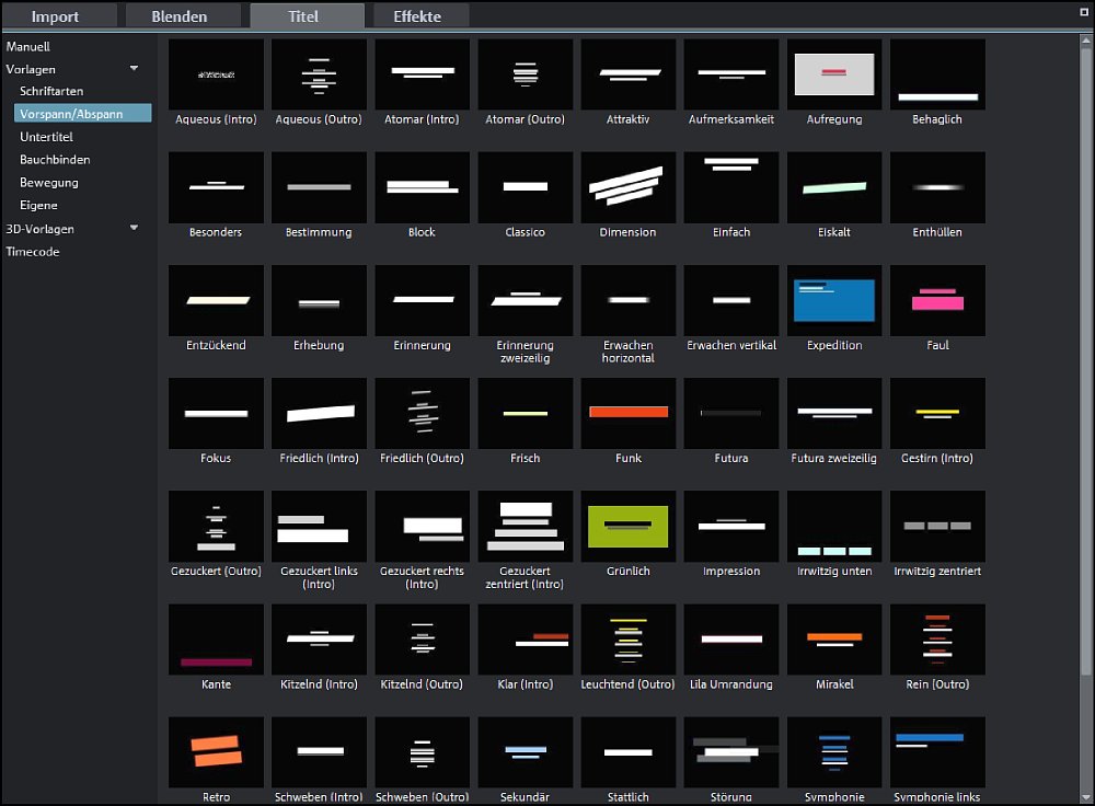 Wenn du eine Filmvorlage verwenden möchtest, stehen dir hier über 40 verschiedene, meist englisch beschriftete Motive für jeden erdenklichen Zweck zur Verfügung. Diese Vorlagen sind in den meisten Fällen sogenannte Trailer. In einem übersichtlichen Ansichts-Modus wird vor dir die kurze Szenenabfolge ausgebreitet, die Titel, Effekte, Musik und Platzhalter beinhaltet. Die Platzhalter sind sogar mit Icons gekennzeichnet, um dir dabei zu helfen, das richtige Füllmaterial auszuwählen. Die Presets sind gerade für Einsteiger hervorragend, um schnell erste, wirkungsvolle Resultate zu erzielen.