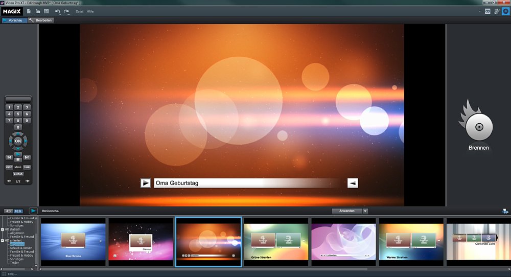Möchtest du dein fertiges Video exportieren, ist dies in alle gängigen Datei-Formate möglich. Ebenso kannst du aus der im Film verwendeten Musik eine Soundtrack-CD erstellen lassen. Möchtest du eine DVD oder BluRay produzieren, kannst du dies in der DVD-Suite tun. Andere Hersteller erachten diese Funktion leider immer noch nicht als selbstverständlich und integrieren sie höchstens halbherzig, Magix jedoch investiert viel Mühe in eine DVD-Suite, die alle Wünsche abdeckt. So kommen mit jeder neuen Version weitere, aufwändige Menü-Vorlagen hinzu, sodass die Entscheidung für eines von ihnen immer schwerer fällt. Natürlich kannst du jedes Menü komplett deinen Bedürfnissen anpassen und auch ein komplett individuelles von Grund auf erstellen. Hinzu kommt, dass du in Magix Video Pro X7 deinem Video auf DVD/BluRay bis zu 8 Tonspuren zuweisen kannst, um beispielsweise mehrere Sprachen einzubinden. Außerdem besteht die Möglichkeit, jeweils 5.1-Surround- und Stereo-Sound der Auswahl hinzuzufügen.