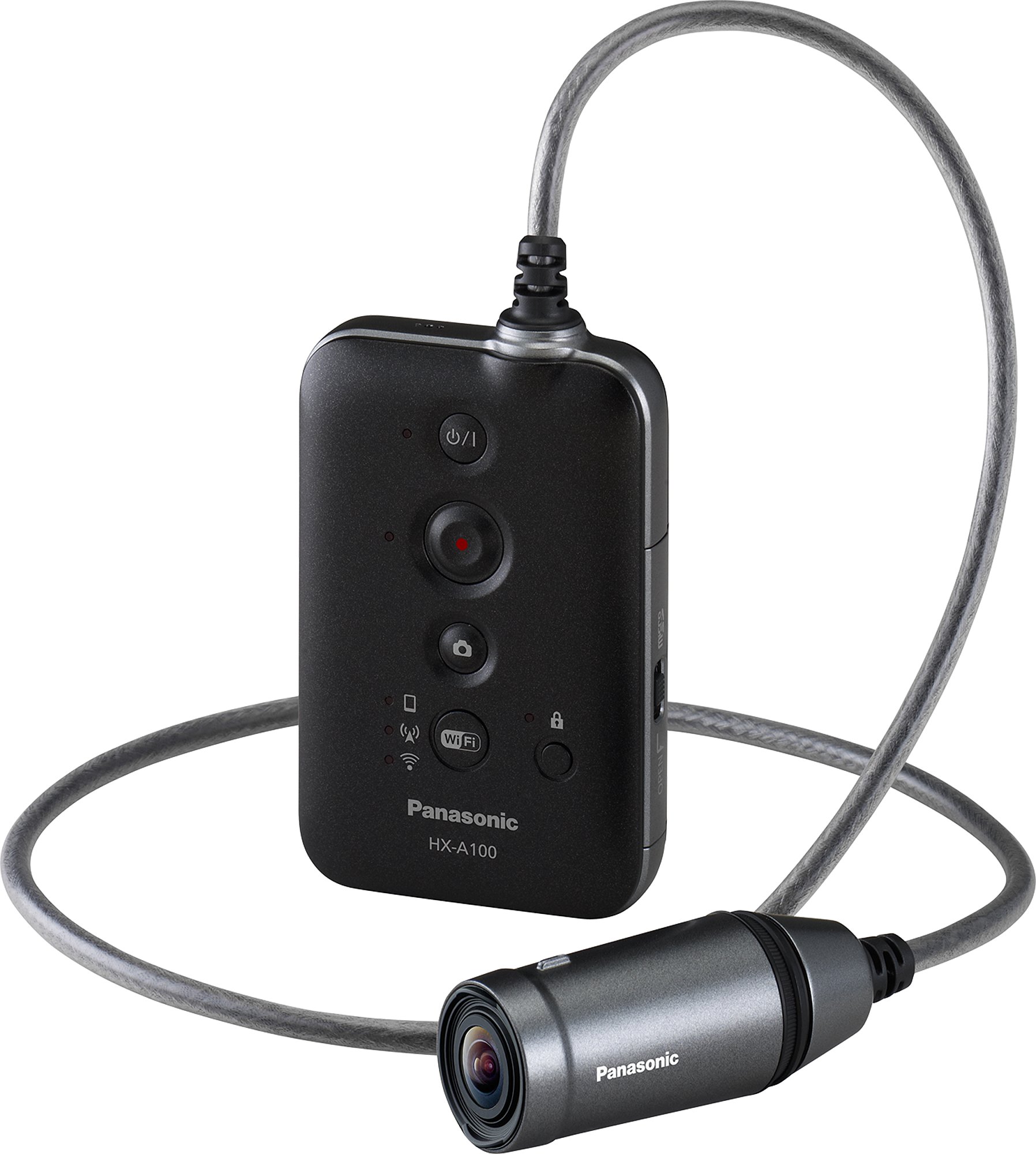Die Actioncam HX-A100 von Panasonic fällt zunächst durch ihre ungewöhnliche Form auf. Anders als die meisten Actioncams ist sie zweigeteilt. Die Optik und die Geräteelektronik sind voneinander getrennt bzw. nur mit einem 70 Zentimeter langen, 5 Millimeter dicken Kabel miteinander verbunden. Das Kabel ist an beiden Enden fest mit den Modulen verbunden und nicht verlängerbar. Dies bringt Vor- und Nachteile mit sich. So ist es von Vorteil, dass die Optik klein und vor allem leicht ist (30 Gramm, deutlich kleiner und leichter als eine komplette Action Cam). Das ist gut, wenn man sie mit dem mitgelieferten Bügel am Kopf trägt. Aber der Bügel ist leider nicht sehr angenehm zu tragen. Trotz Verstellmöglichkeit spürt man, dass man den Bügel auf dem Kopf bzw. am Kopf hat. Der eigentliche Bügel wird nämlich hinter dem Kopf getragen und hat eigentlich keinen direkten Kontakt. Seine Federwirkung drückt die Ohrbügel an den Kopf (und das stört). Zu locker darf es nicht sitzen, sonst verrutscht die Kamera. Das Mono-Mikrofon der Kamera zeigt dann zum Gesicht und ist ziemlich nah am Mund. Eigene Kommentare werden so gut aufgezeichnet.