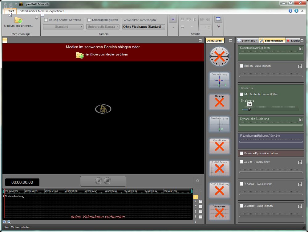 Sicherlich ist ProDrenalin (Testbericht unten verlinkt) dem teuren Mercalli-Studio nachempfunden (und nicht umgekehrt), aber wir hatten ja zuvor die kleinere Version im Test und werden deshalb beim Anblick von Mercalli V4 an die Fünfzig-Euro-Software ProDrenalin zurückerinnert: Die gleiche, trist graue, trotz weniger Elemente unübersichtliche Benutzeroberfläche und auch die nervig blinkende Import-Fläche ist wieder da. Mittig sitzt die Vorschauanzeige, unten findest du eine Zeitleiste, rechts ein paar Bildeinstellungen und in der Kopfleiste sind die entscheidenden Korrektur-Assistenten angebracht. „Neu“ sind die als „Armaturen“ betitelten Schaltflächen, auf denen dir unter anderem die im jeweiligen Frame vorgenommenen Veränderungen angezeigt werden.