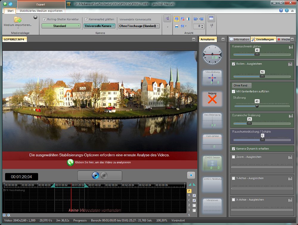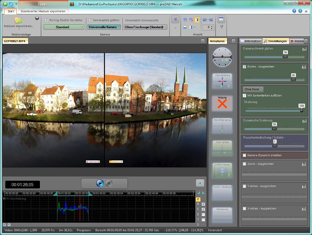 Importierst du einen Clip (Mercalli akzeptiert im Gegensatz zu ProDrenalin die meisten gängigen Videoformate) taucht er auf dem Vorschaumonitor und in der Zeitleiste auf, die zu dem Zeitpunkt noch recht unspektakulär aussieht. Mercalli verlangt nun, das Video zu analysieren. Du solltest dein Material jedoch zuvor mit dem Intervall-Trimmer auf den wichtigsten Ausschnitt kürzen, um alle folgenden Rechenzeiten möglichst gering zu halten, und eventuell das Fischauge entzerren lassen (falls gewünscht oder notwendig). Für die Entzerrung hat sich ProDAD mit einigen Actioncam-Herstellern zusammengetan, um die Resultate bestmöglich ausfallen zu lassen. Wenn du eine gängige Kamera besitzt, kannst du also das dazugehörige Profil aus einer Liste auswählen. Verfügst du über eine "exotische" Actioncam (beispielsweise von SJCam), bleibt dir nichts anderes übrig als "Universell" mit dazugehörigem Bildwinkel anzuklicken. Außerdem solltest du dir vorher überlegen, welche CMOS-Fehler beseitigt werden sollen. CMOS-Fehler könnten dir beispielsweise als Schlieren in Quadrocopter-Videos bereits begegnet sein. Es handelt sich dabei um Bildfehler, die nicht von der Kamerabewegung selbst herrühren, sondern vom Sensor verursacht werden, weshalb sie auch nicht wie klassische Verwackelungen aussehen. Viel mehr gleichen sie Schlieren und einem Wabern – das Bild wölbt sich stellenweise und/oder ist mittendrin aus unerklärlichen Gründen verzerrt. Werden diese Fehler als erstes eliminiert, muss das Programm weniger zusätzliche Stabilisierungsarbeit leisten und kann mehr Bildqualität vor eventuellen Verlusten bewahren. Du solltest vor Beginn der Bereinigung also ungefähr wissen, welche Fehler wie intensiv gesucht werden sollen.